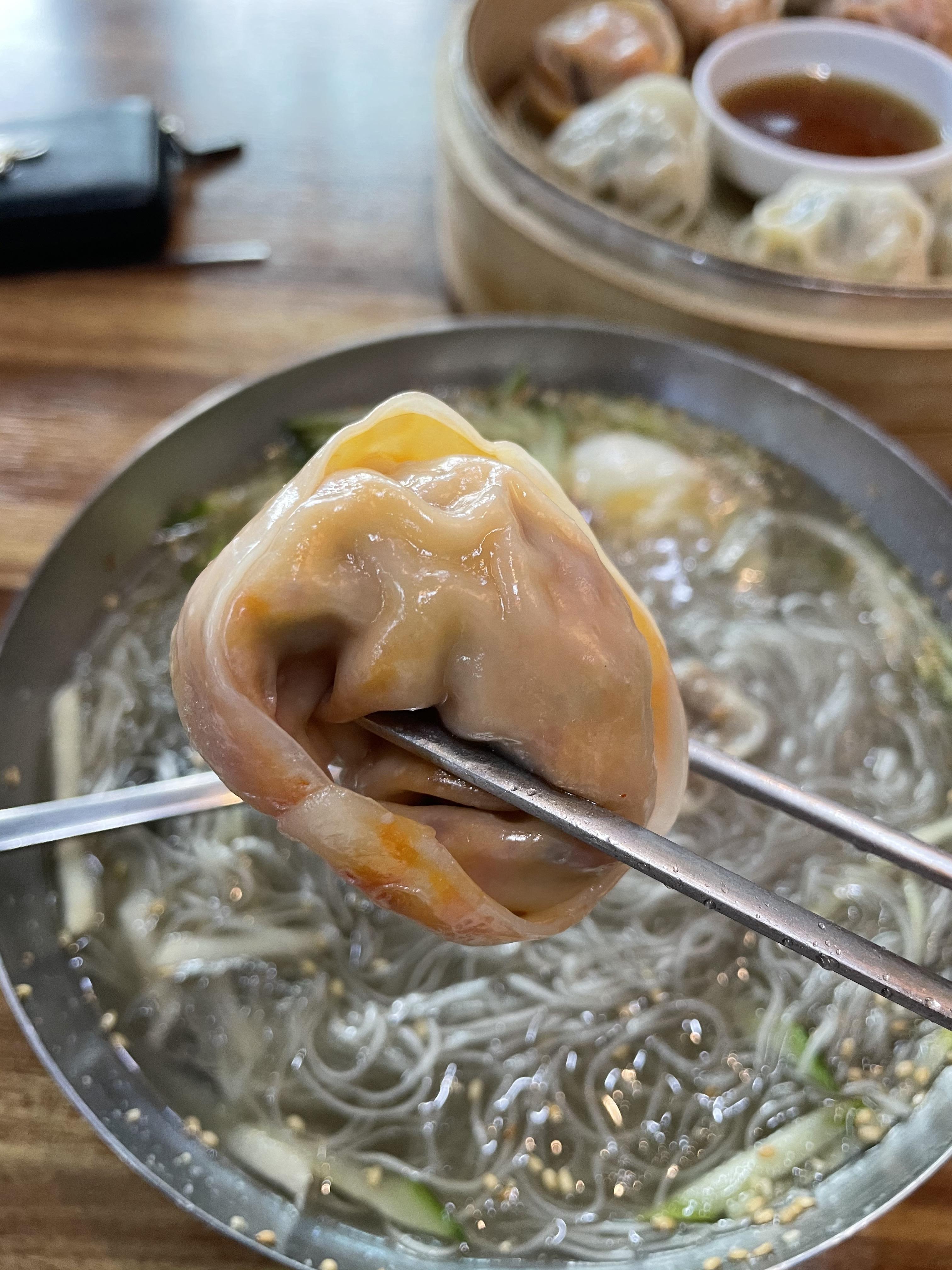 조금 있으니 만두도 나왔는데요. 저희가 딱히 반반이라고 말씀드리지 않았지만 센스있게 반반으로 주셨어요. 저는 김치만두가 딱 제 스타일이었어요. 기성품 만두 같지 않아서 좋았어요.
