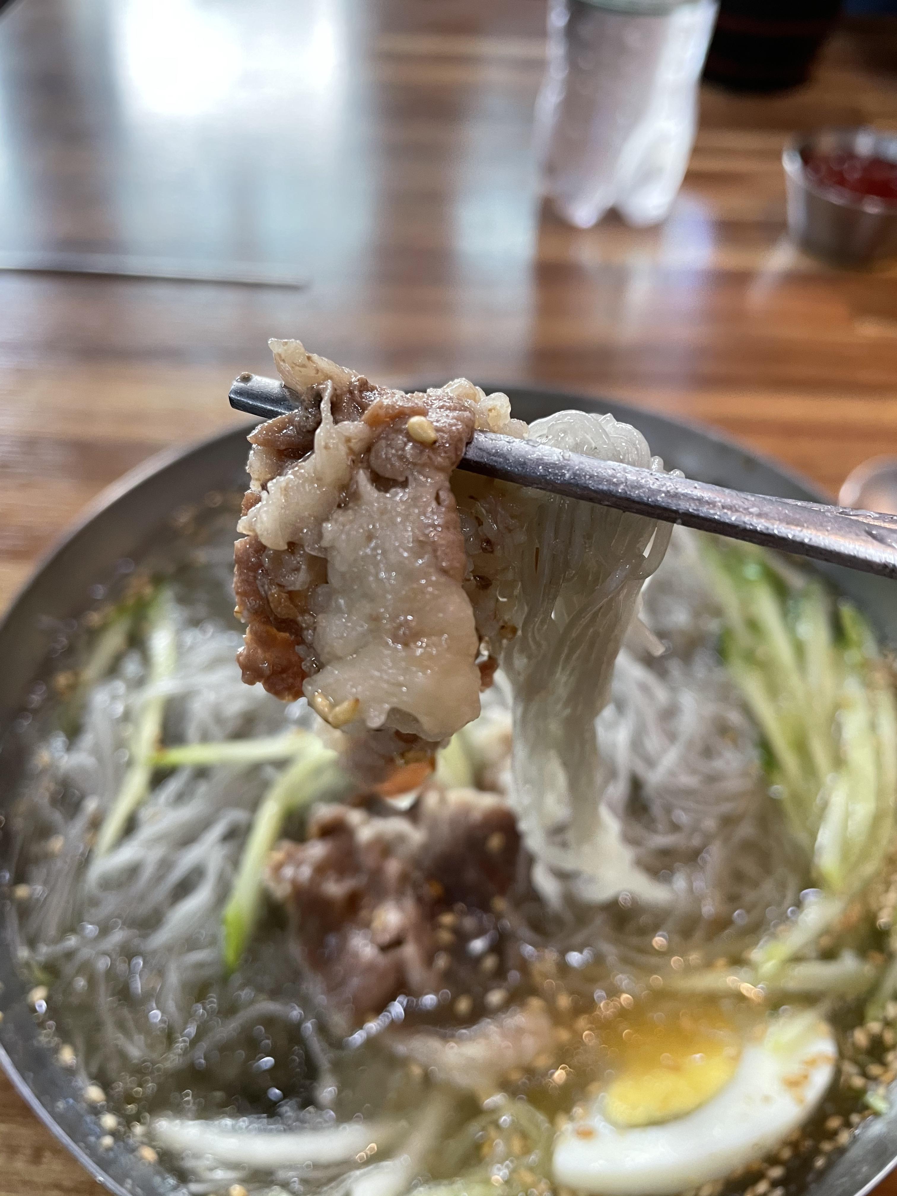 저는 이 곳 물냉면의 특장점을 차돌박이인지 뭔지는 잘 모르겠지만 아무튼 이 기름지고 부드러운 고기라고 생각했어요. 다른 냉면들 위에는 정말 차갑고 뻑뻑한 고기들이 주로 올라가 있는데, 이 고기는 저한테 너무 맛있었어요.