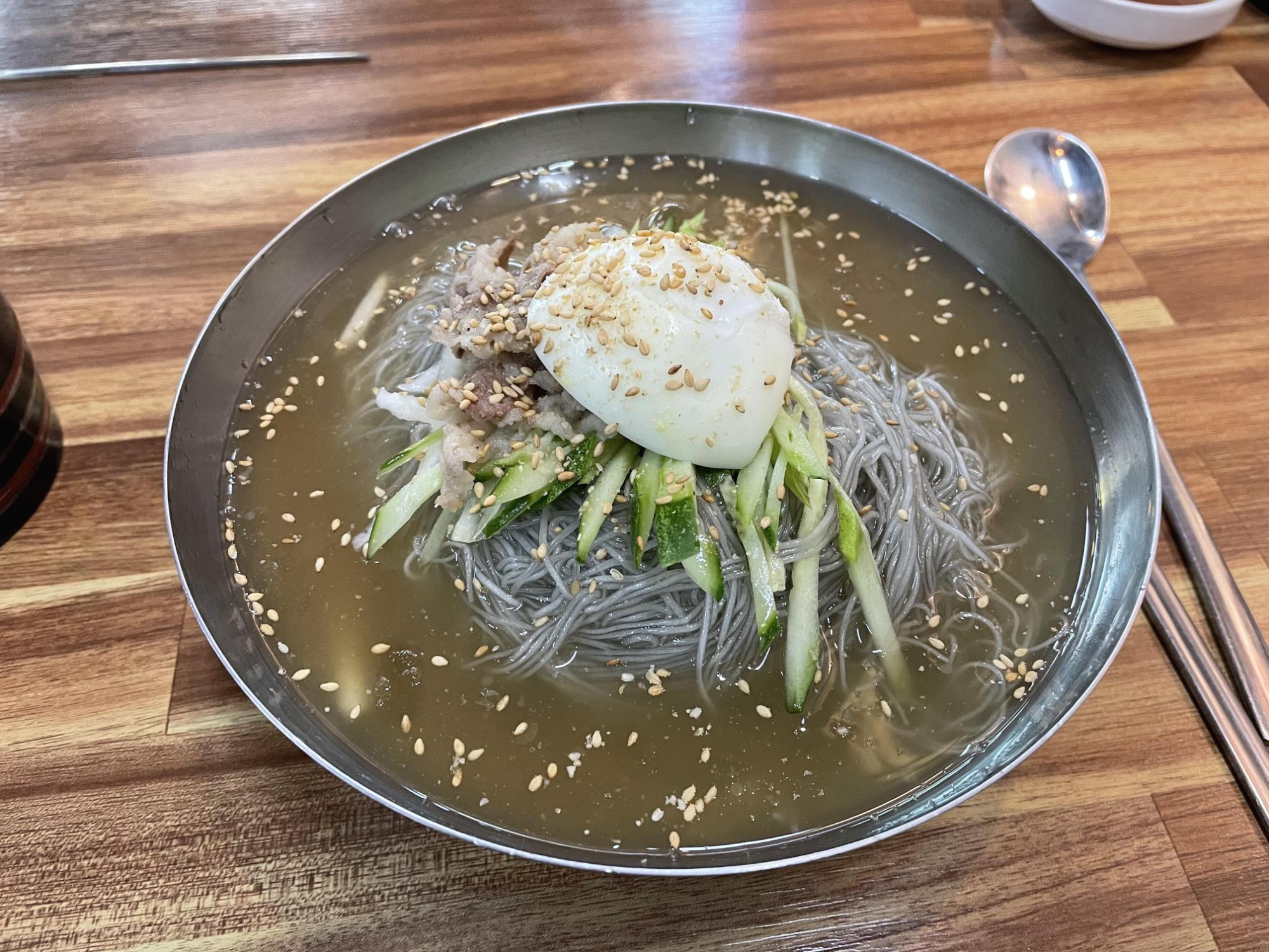 물냉면은 그냥 먹어도 맛있지만, 이렇게 같이 나온 비빔장을 넣고 먹으니 더 맛있었어요! 같이 온 일행은 맵기를 매운맛으로 했는데 정말 매운 것 같더라구요. 저는 물냉면의 이 슴슴한 맛이 좋아요!