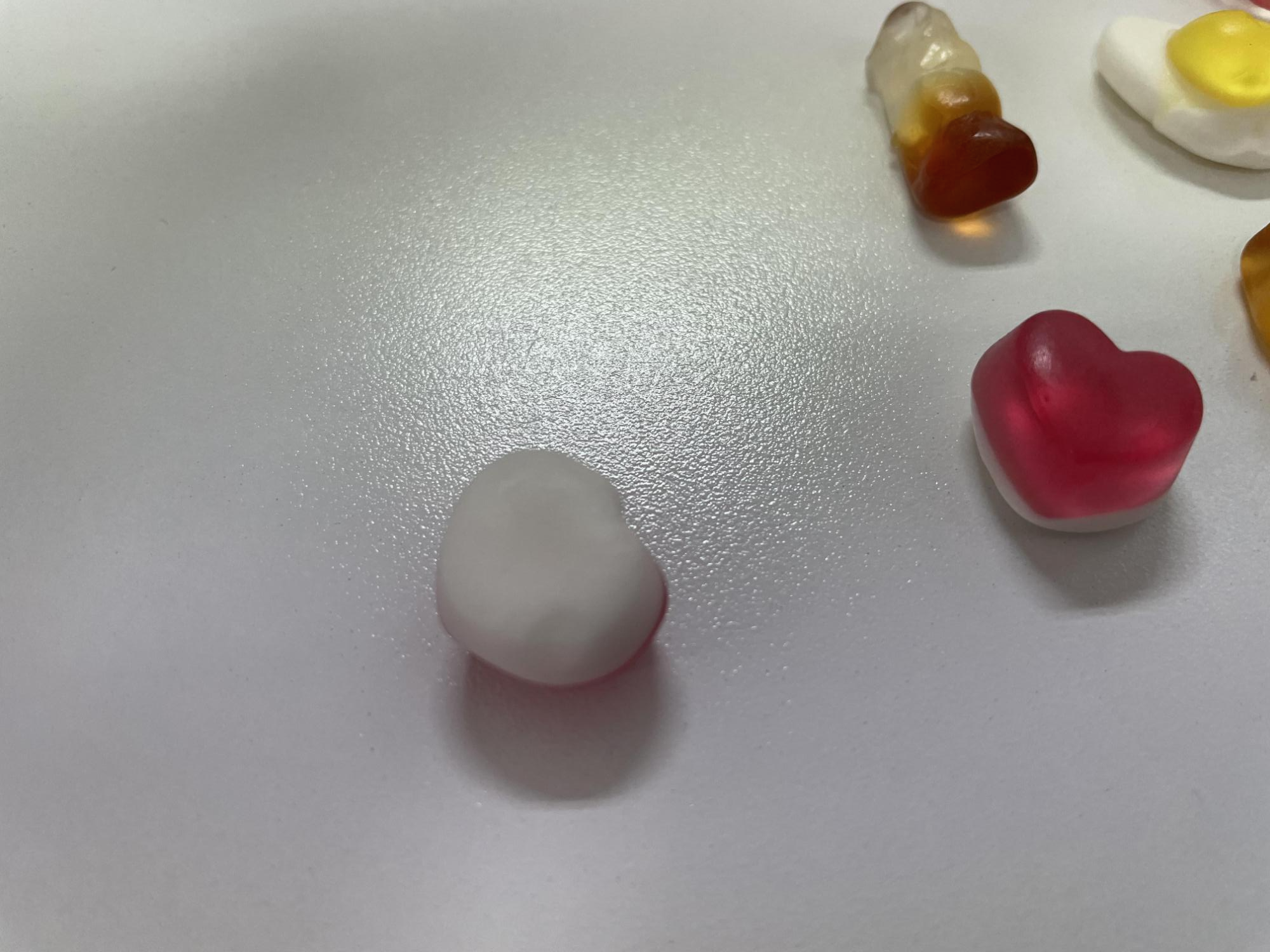 하트를 뒤집으면 이렇게 강아지 고양이 발바닥처럼 아주 말랑말랑한 하얀 젤리가 나오는데 저는 이게 너무 좋더라구요. 하리보 젤리들은 약간 딱딱한 게 특징인데, 이 친구는 빨간 부분이 딱딱하고, 하얀 부분은 부드럽게 말랑거려요. 두 가지 식감이 섞여 재밌는 것 같아요. 맛은.. 그냥 딸기..? 라즈베리인가..? 기억에 안 남는 걸로 봐선 그런 빨간 과일 맛인 것 같아요.