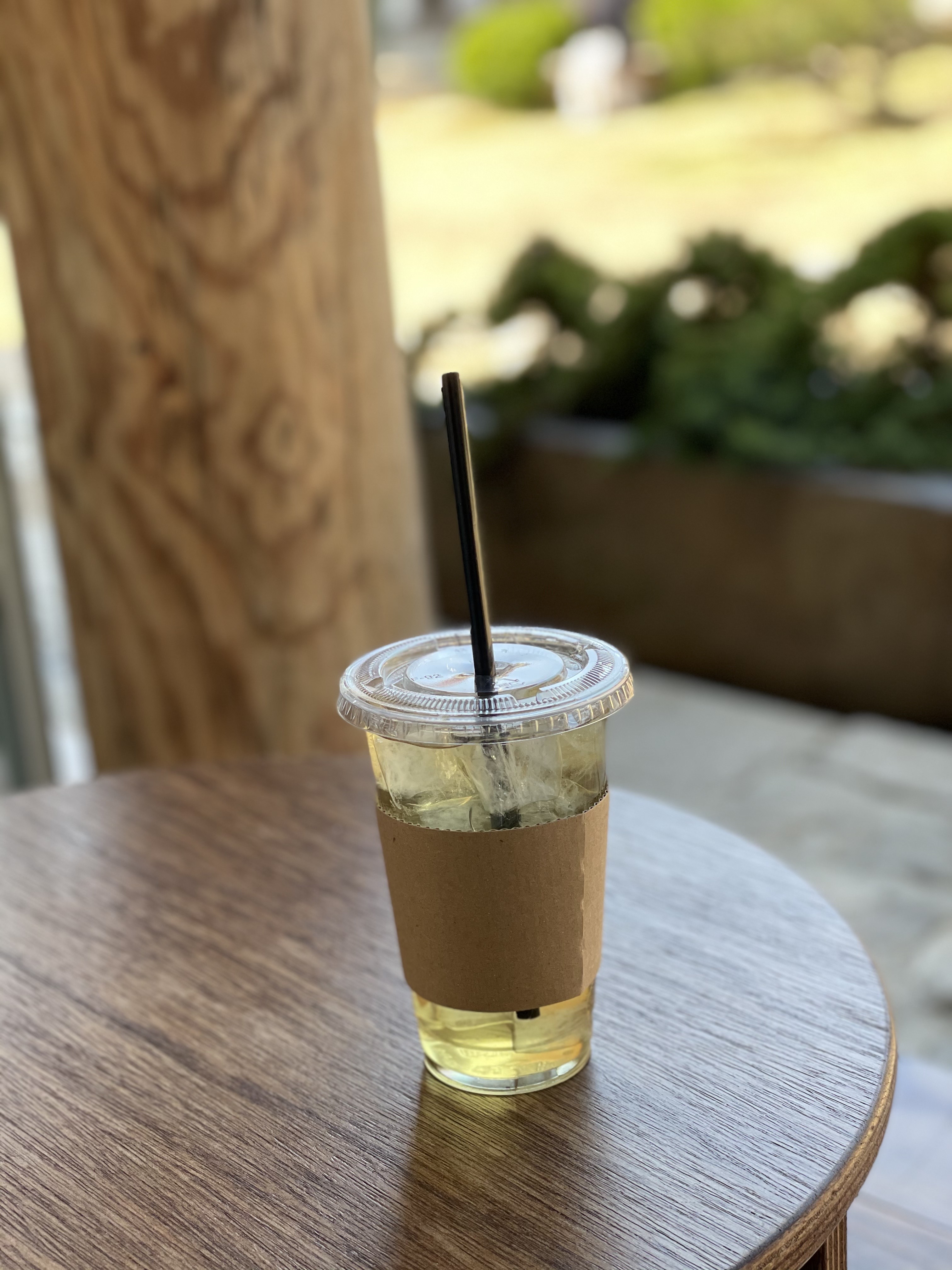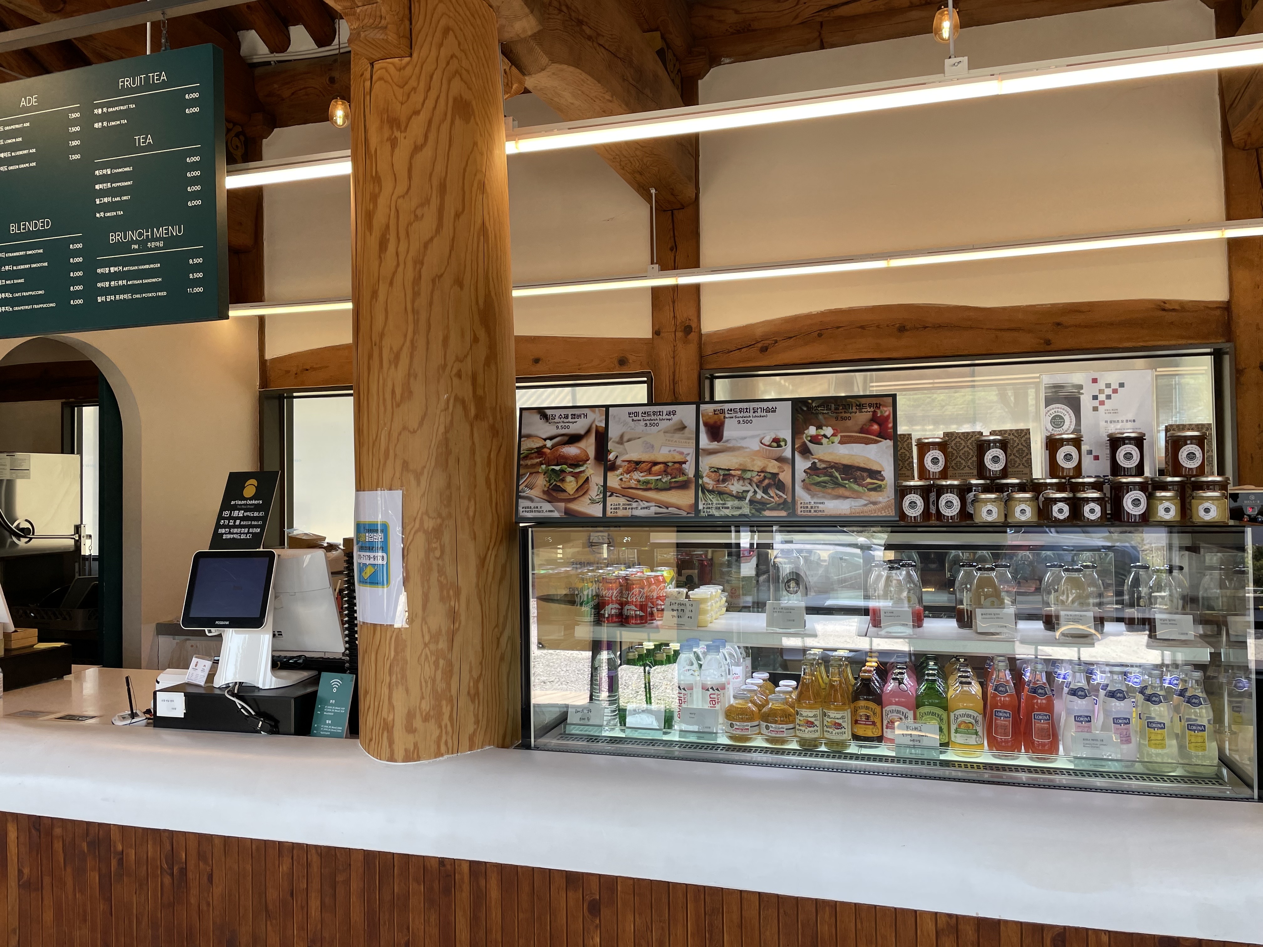 오른쪽에는 이런 내부에서 먹는 입식좌석 공간이 있었어요. 아직은 바람이 불어 쌀쌀하니 안에 앉을까 고민하다가, 미세먼지도 없이 청명한 날이라 조금 쌀쌀하더라도 밖으로 나가기로 결정했어요.