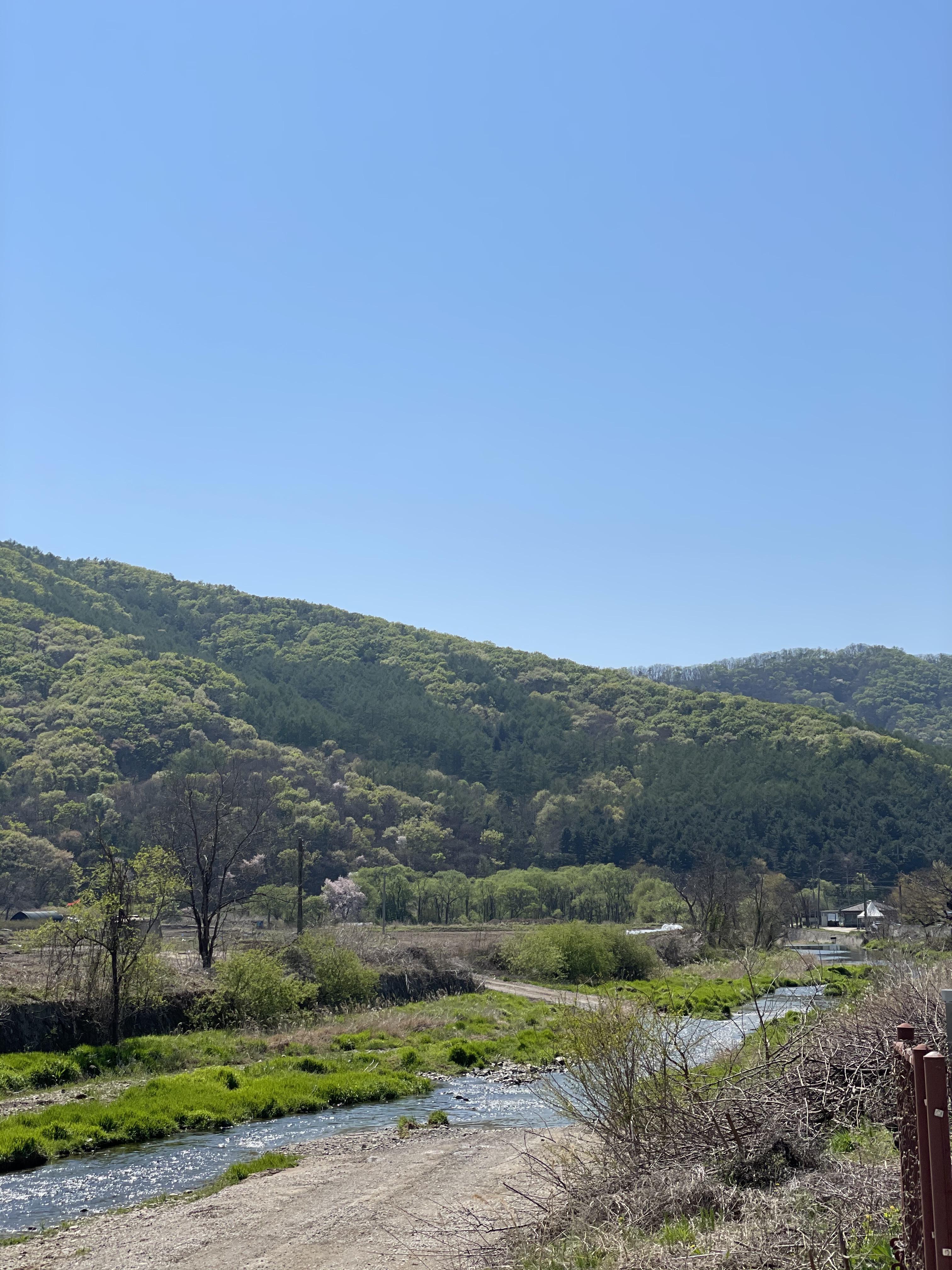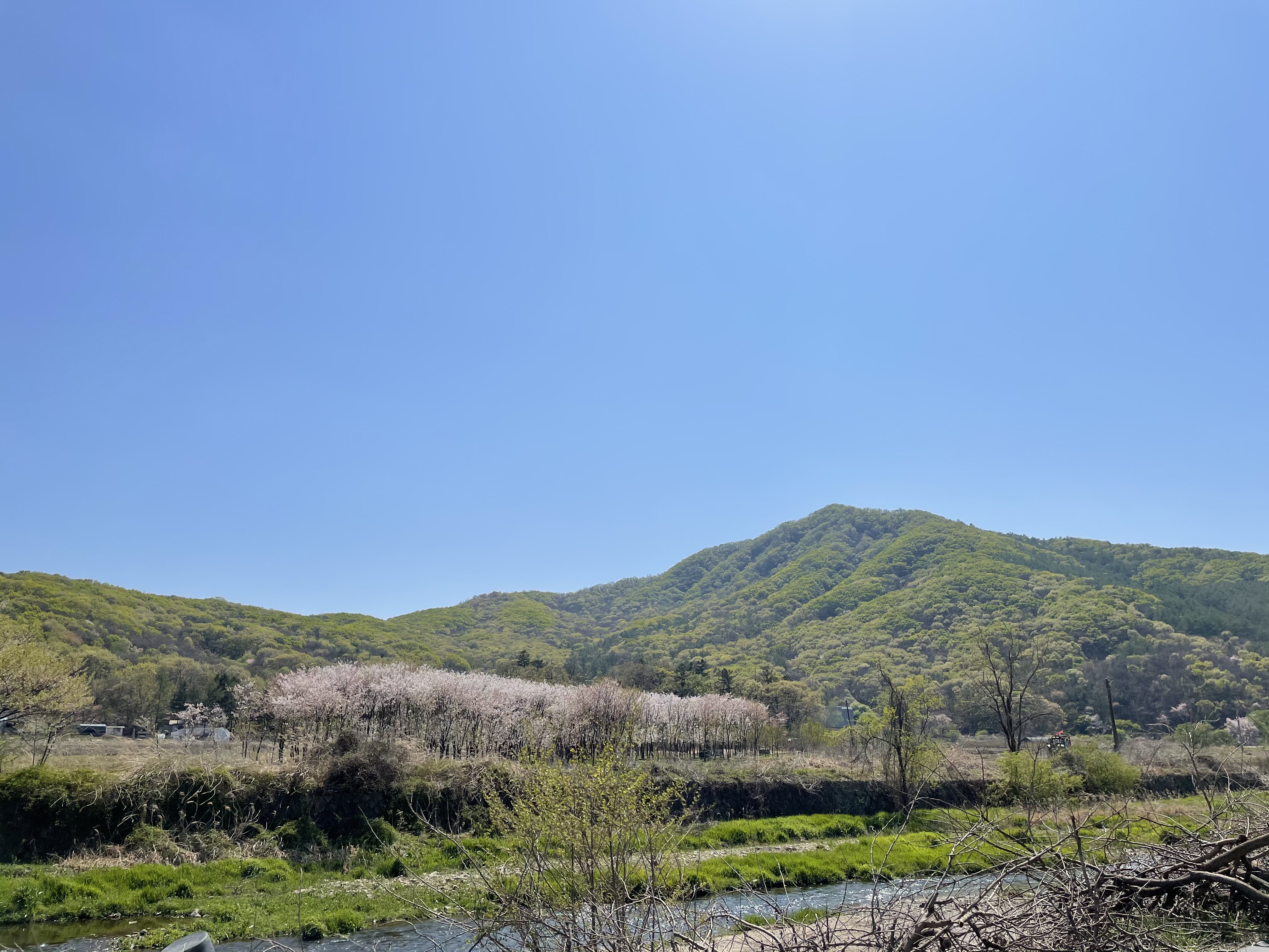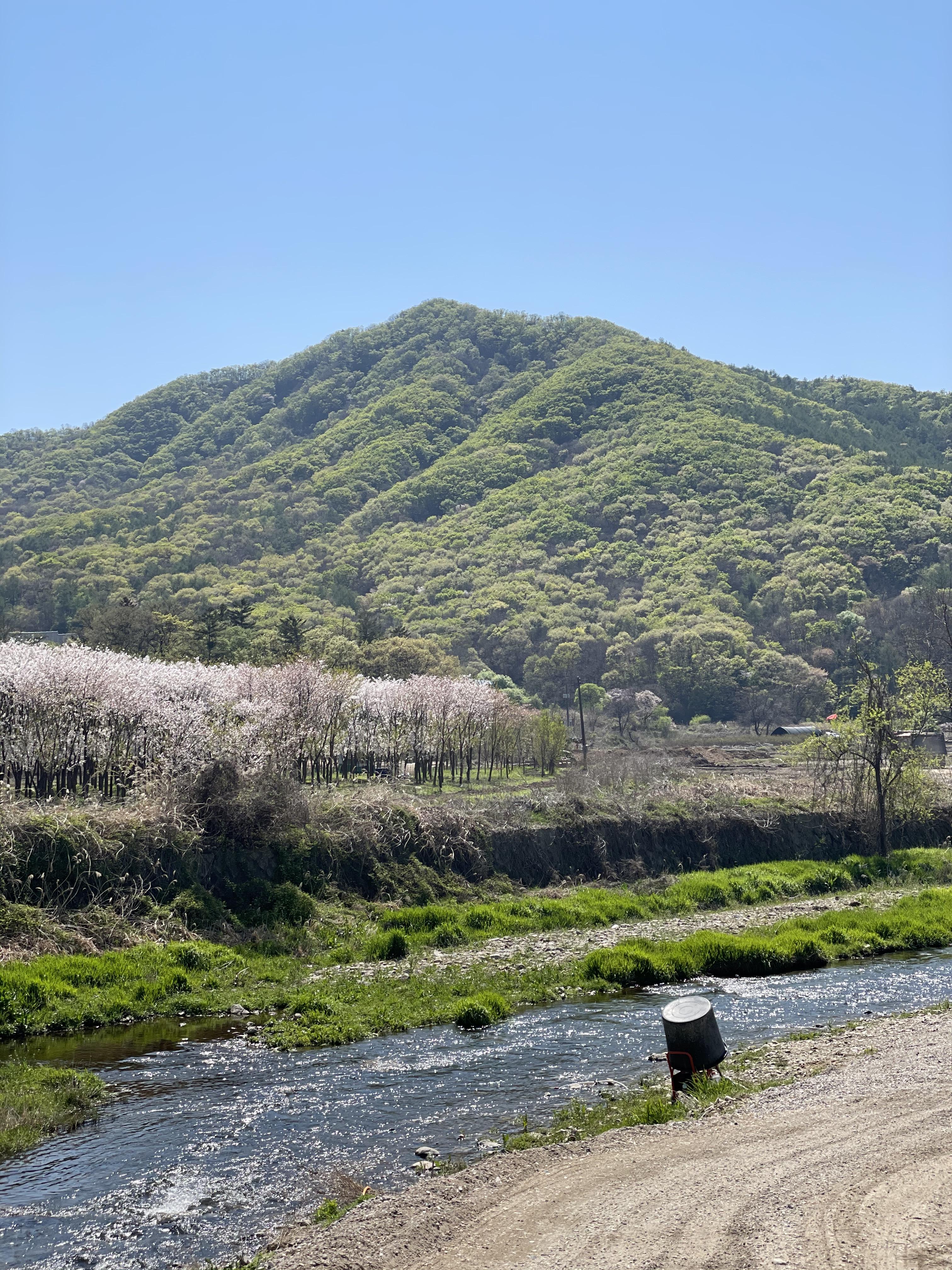 그냥 시골 그 자체이긴 한데, 연두빛 잎들이 이제 막 나기 시작하는 나무들이 뒤덮인 산과, 파란 하늘에, 졸졸졸 시냇물까지 완벽한 조합이었어요.