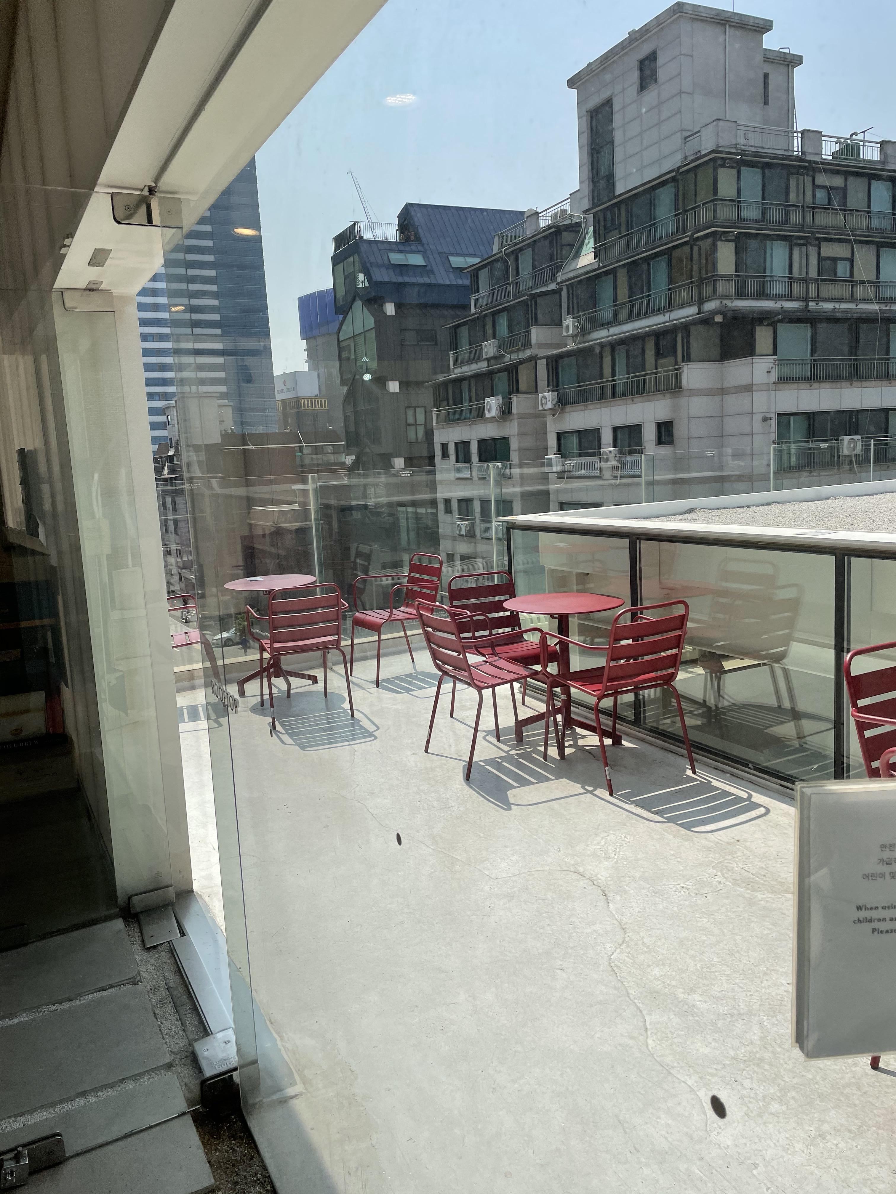 3층 테라스에는 이런 빨간 의자가 들어간 테이블과 의자들이 있어요. 광합성 하기는 딱 좋겠네요.