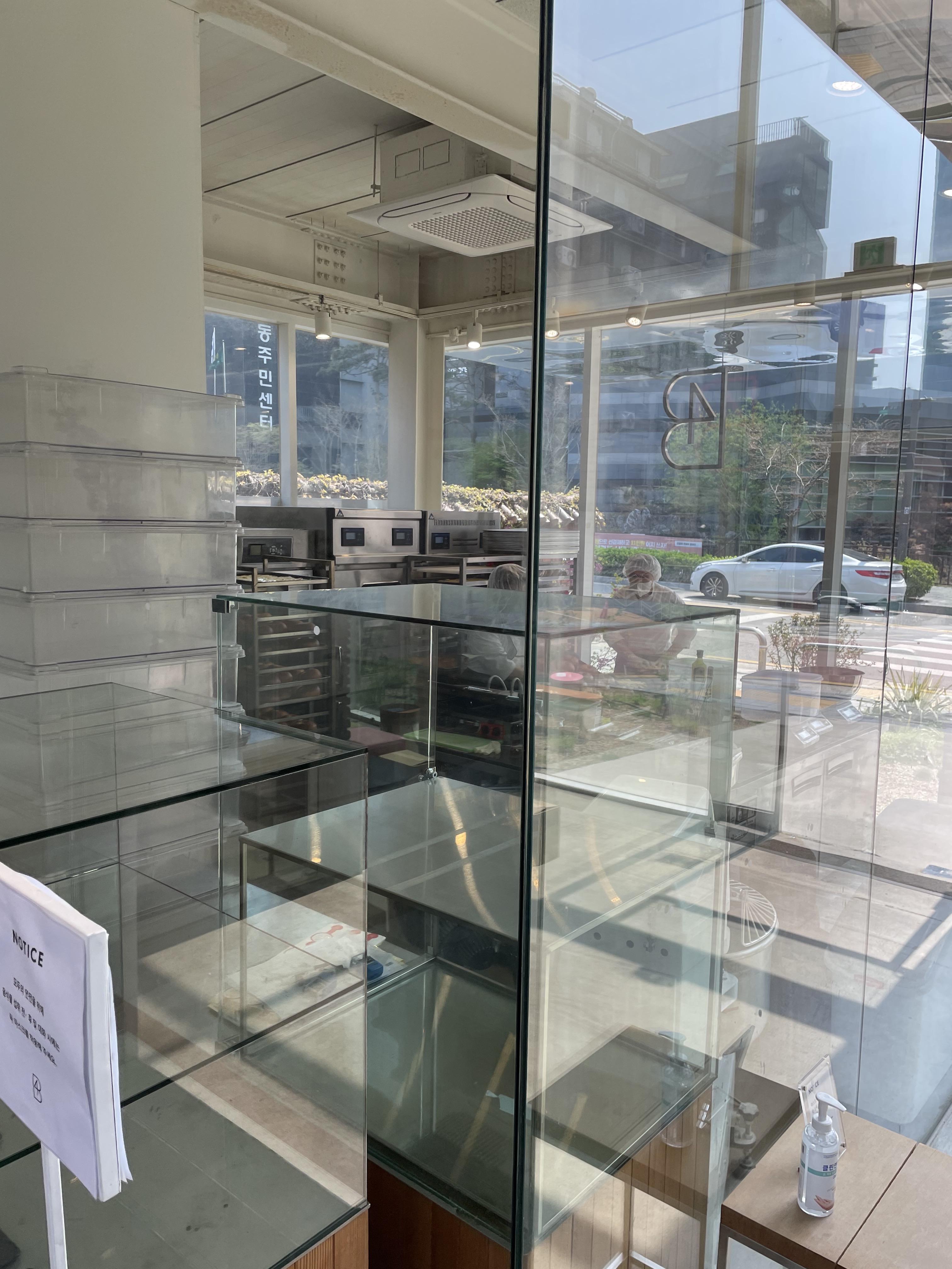 입구로 들어서면, 이렇게 그냥 봐도 복잡해 보이는 공간과, 투명한 유리로 된 베이글 작업장이 보여요.
