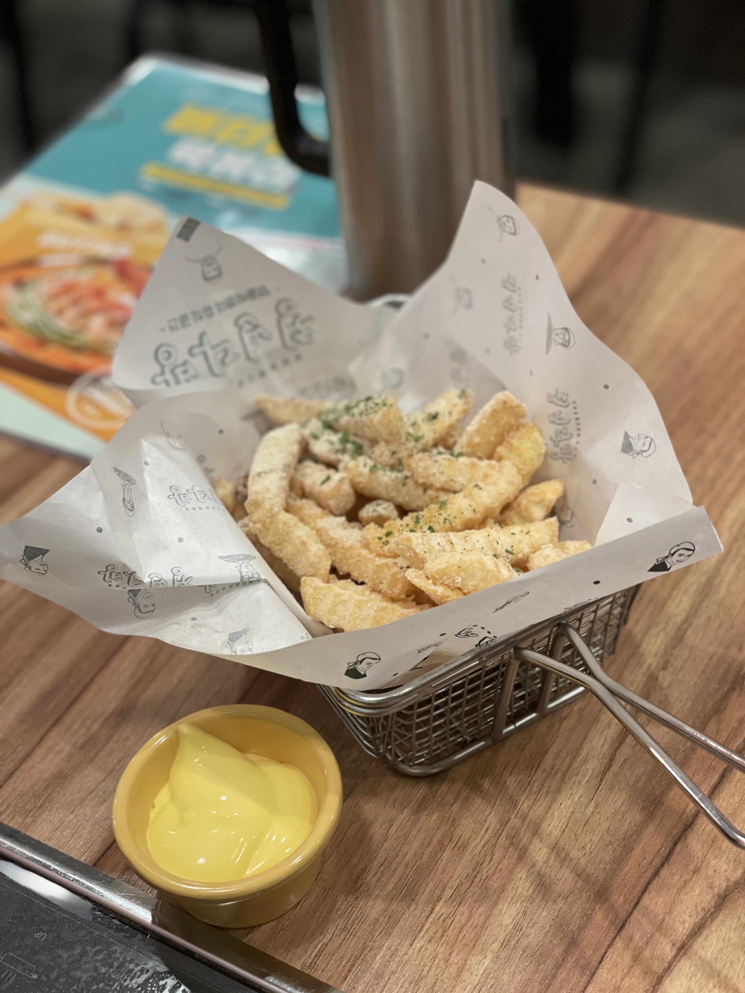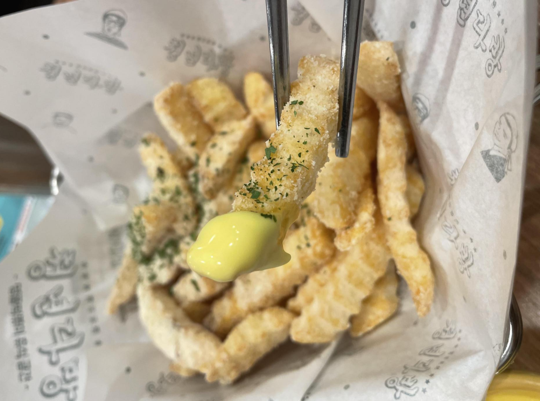 버터갈릭감자는 떡볶이와 늘 궁합이 최상이에요. 달달하면서 갈릭향이 가득한 파우더가 뿌려진 겉바속촉 감자튀김에 버터크림을 찍어먹으면 떡볶이의 매콤함이 중화됩니다.