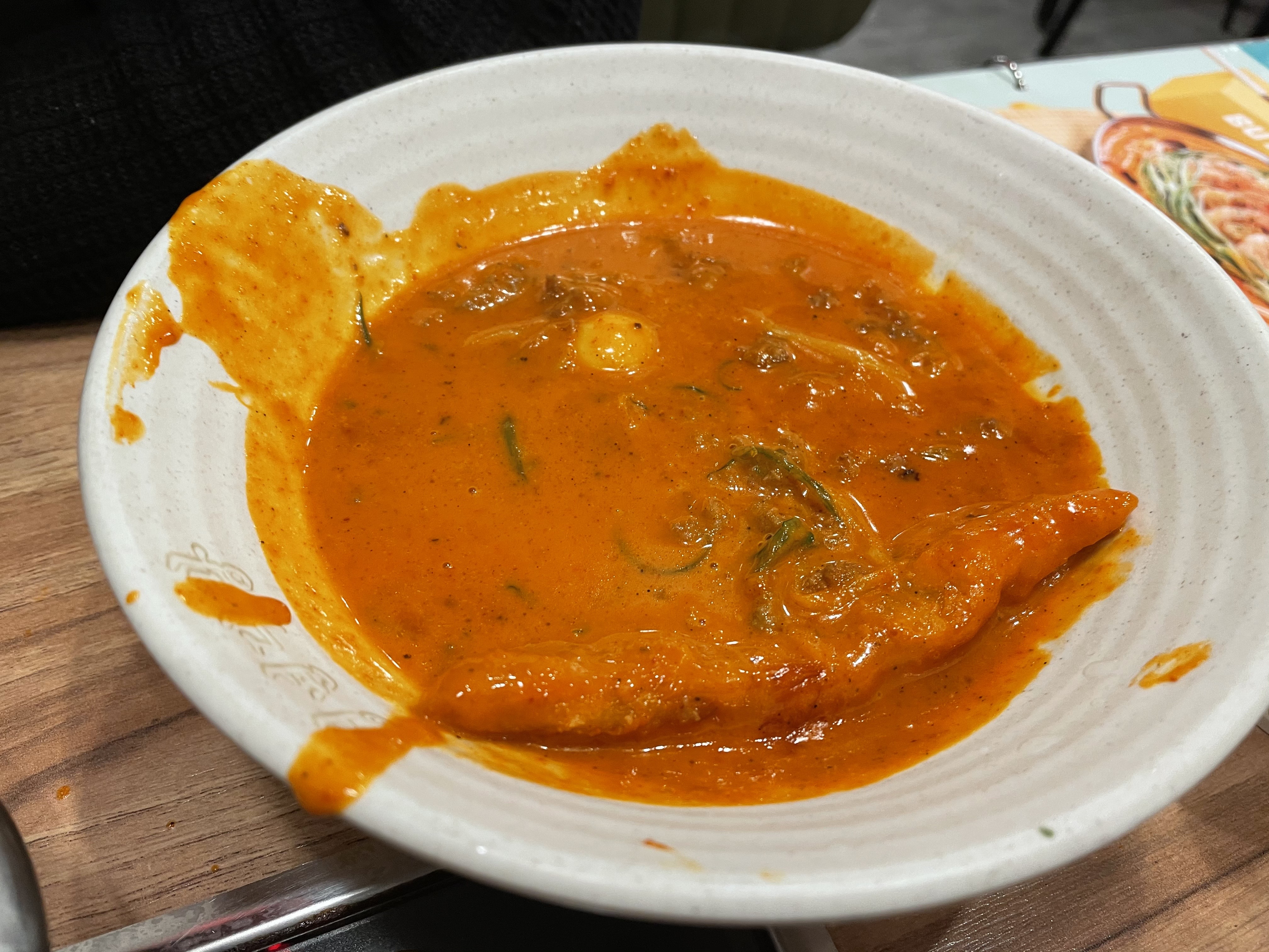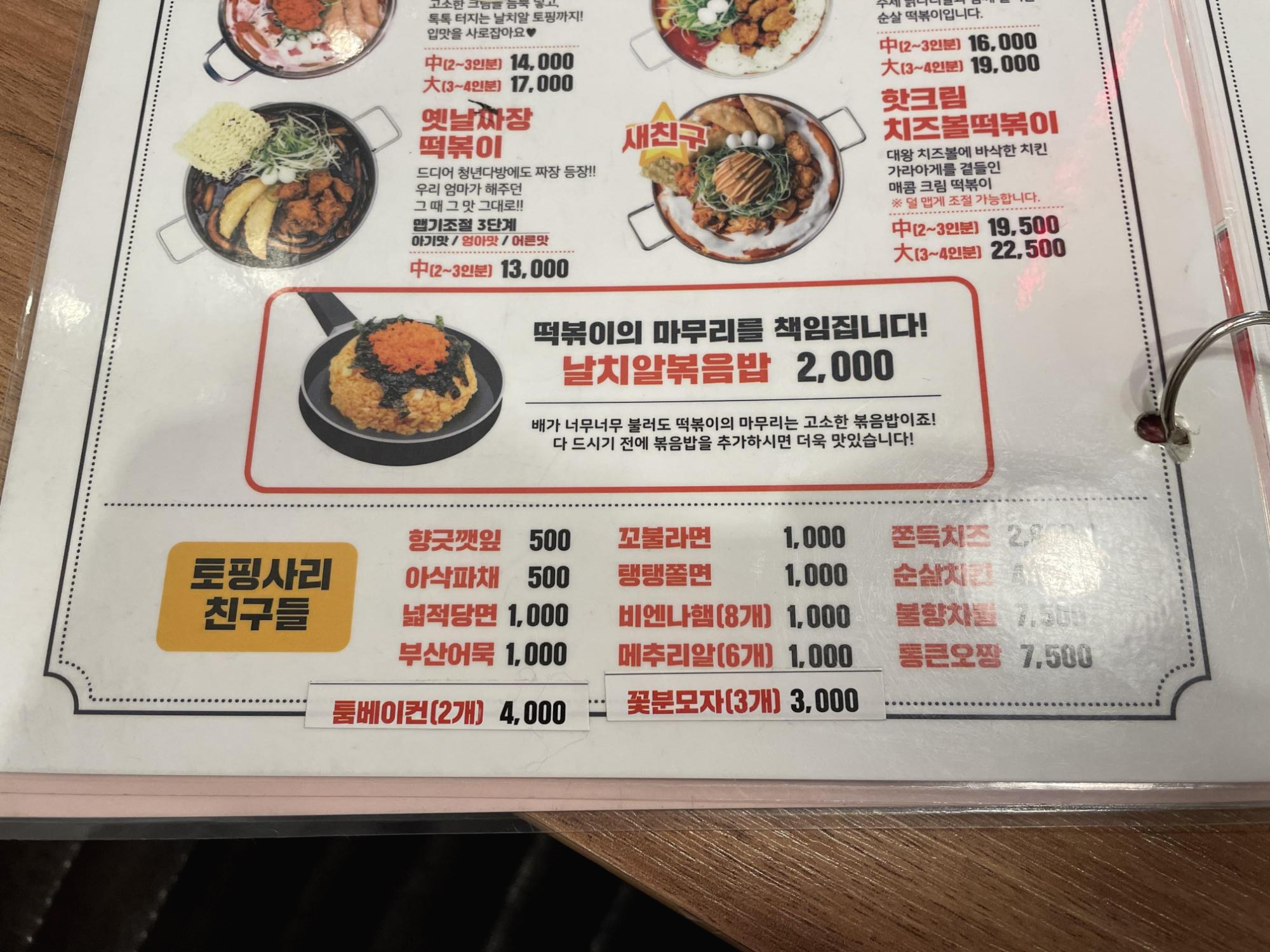 메뉴판이구요. 일단 두 명이니깐 차돌로제떡볶이 중자에 넓적 당면 토핑을 추가했어요. 로제에는 분모자를 추가하시는 분들이 많은데, 저는 분모자가 맛있는지 크게 모르겠어서 추가하지 않았어요.