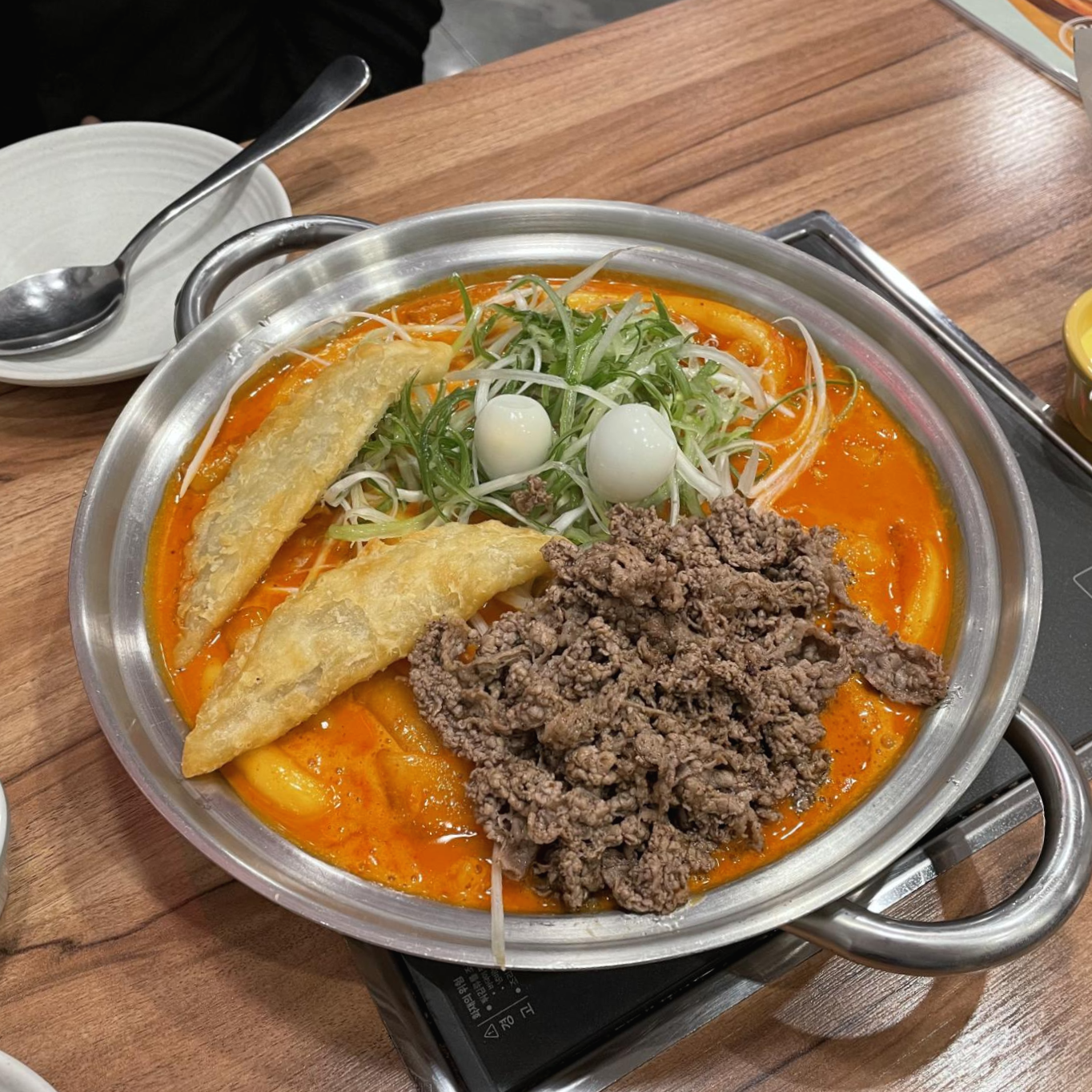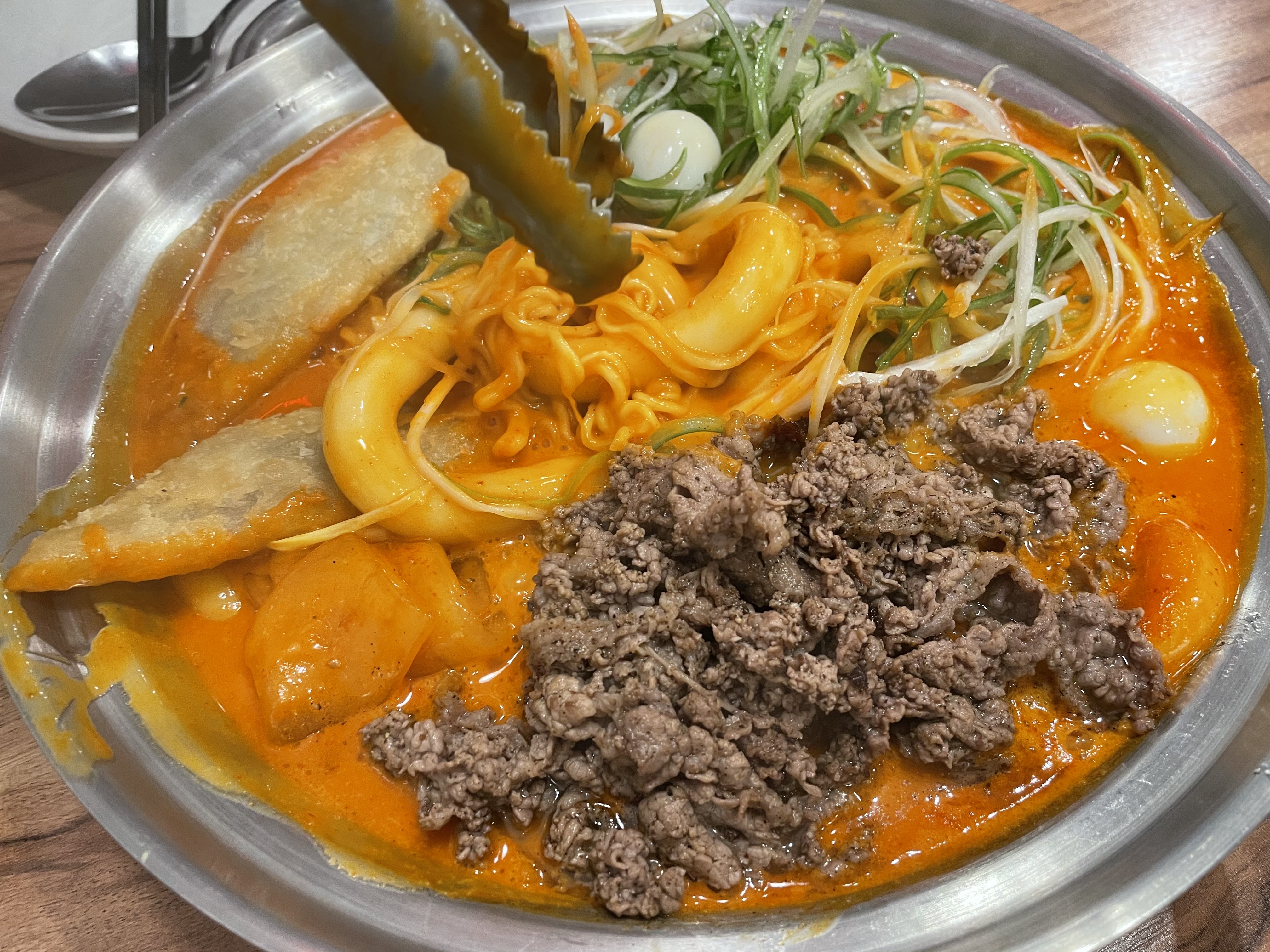 뜨든! 드디어 떡볶이가 나왔어요! 구성은 누들밀떡 + 차돌박이 + 야끼만두2개 + 메추리알 2개 + 파채 + 라면사리 + 넓적당면 + 어묵 조금입니다.