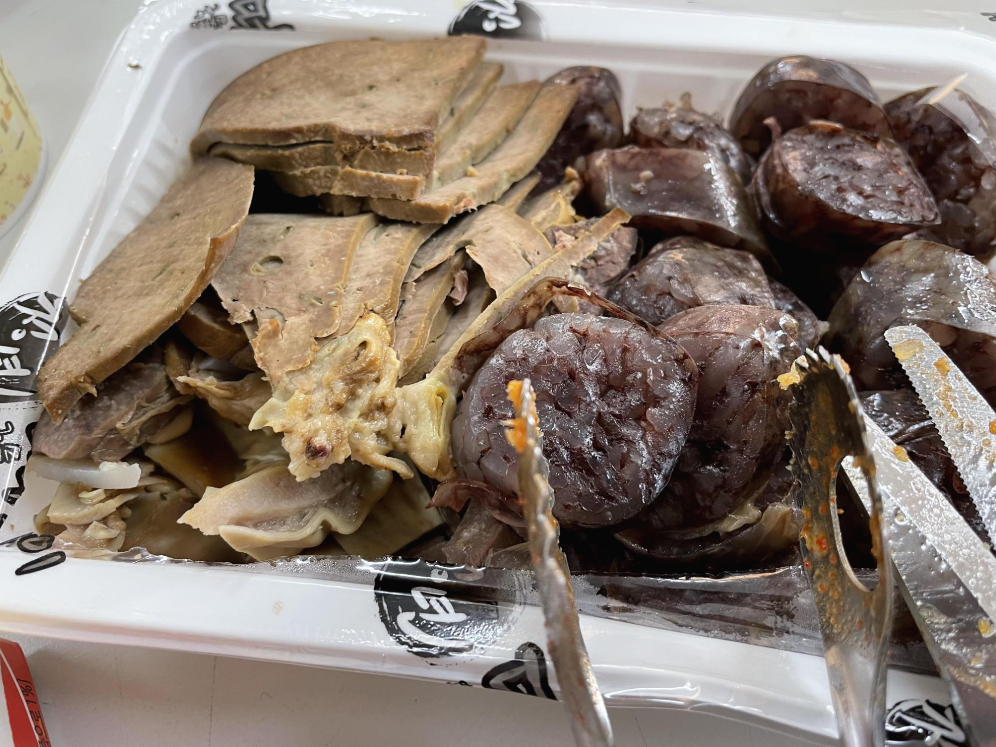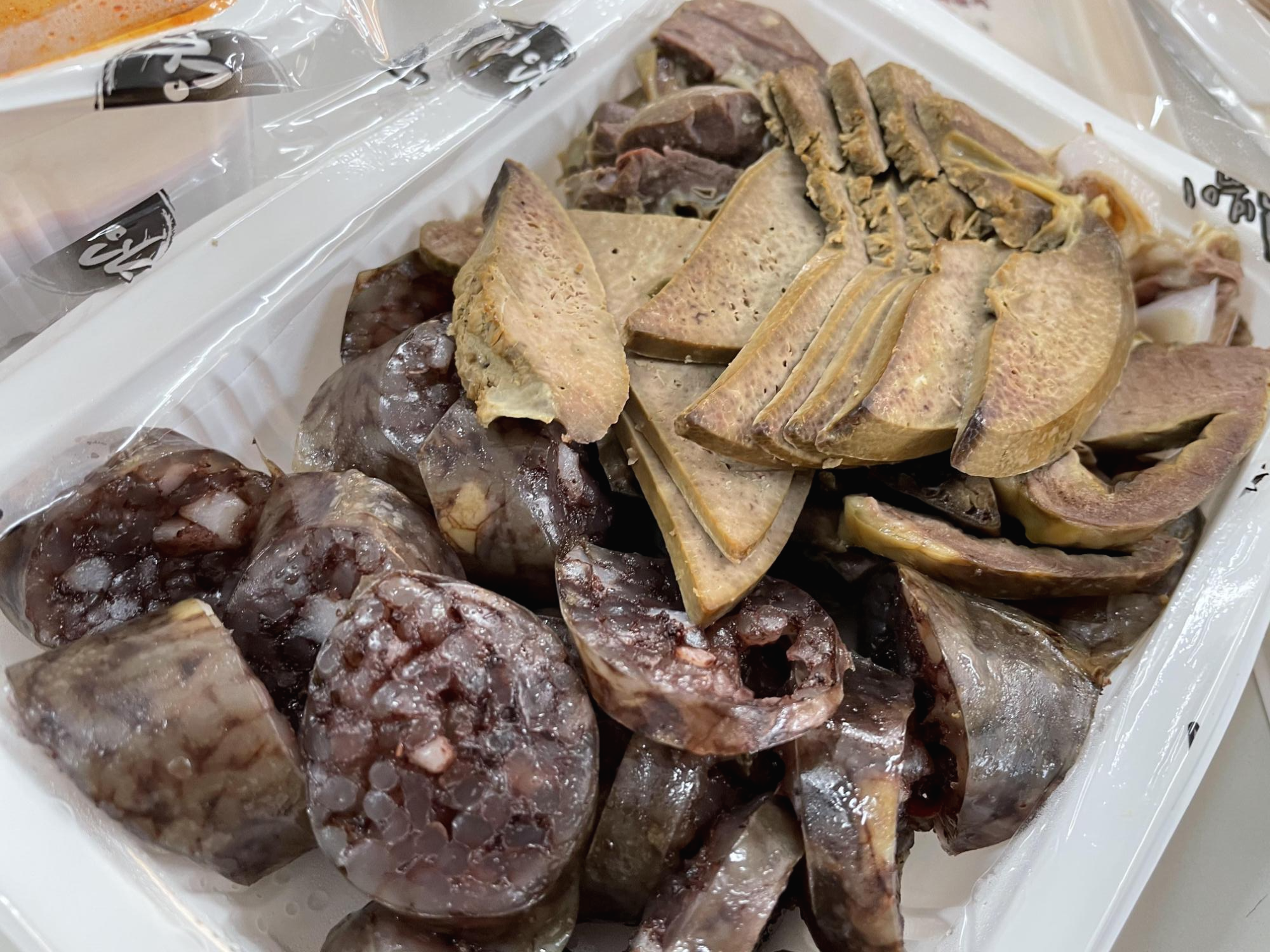 순대예요. 내장을 섞어서 가져왔어요. 순대는 잡내가 나거나 하는 것 없이 맛있어요!