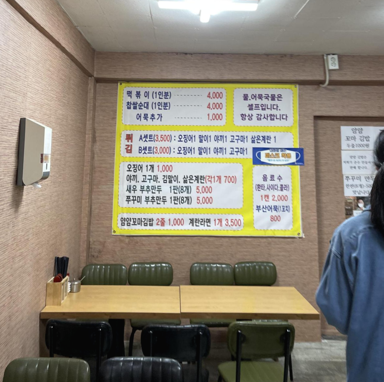 경이네 떡볶이는 굉장히 소박하고, 학창 시절 학교 앞에서 먹던 떡볶이가 생각나는 곳이에요. 우리는 떡볶이 1인분, 순대 1인분(내장 섞어서), 튀김 B세트, 얌얌꼬마김밥을 주문했어요. 요금은 후불이며, 카드 결제 가능합니다.