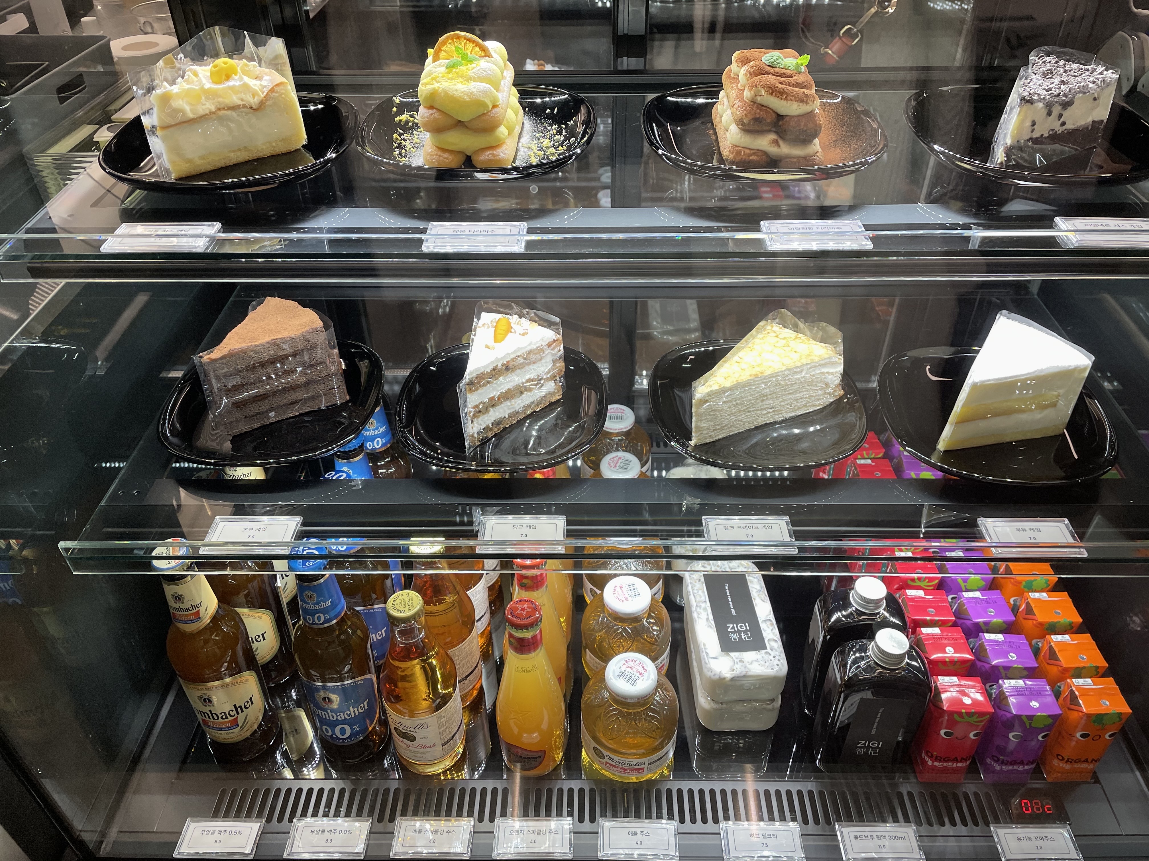 카운터 옆 냉장 진열장에는 조각 케이크와 병 음료들이 있었어요. 저희는 아이스 아메리카노와 카모마일 블루밍 티, 이탈리안 티라미수를 주문했어요.