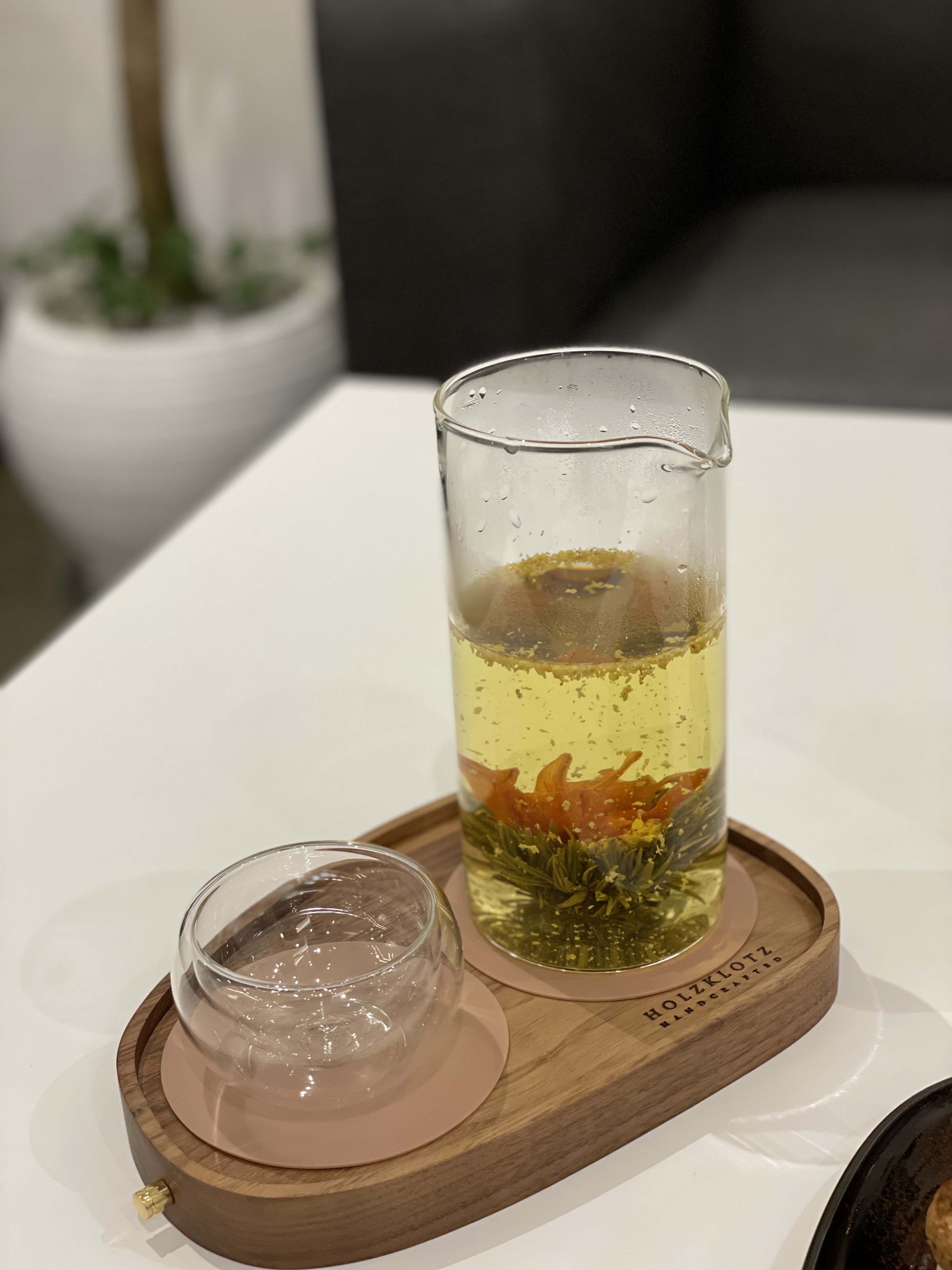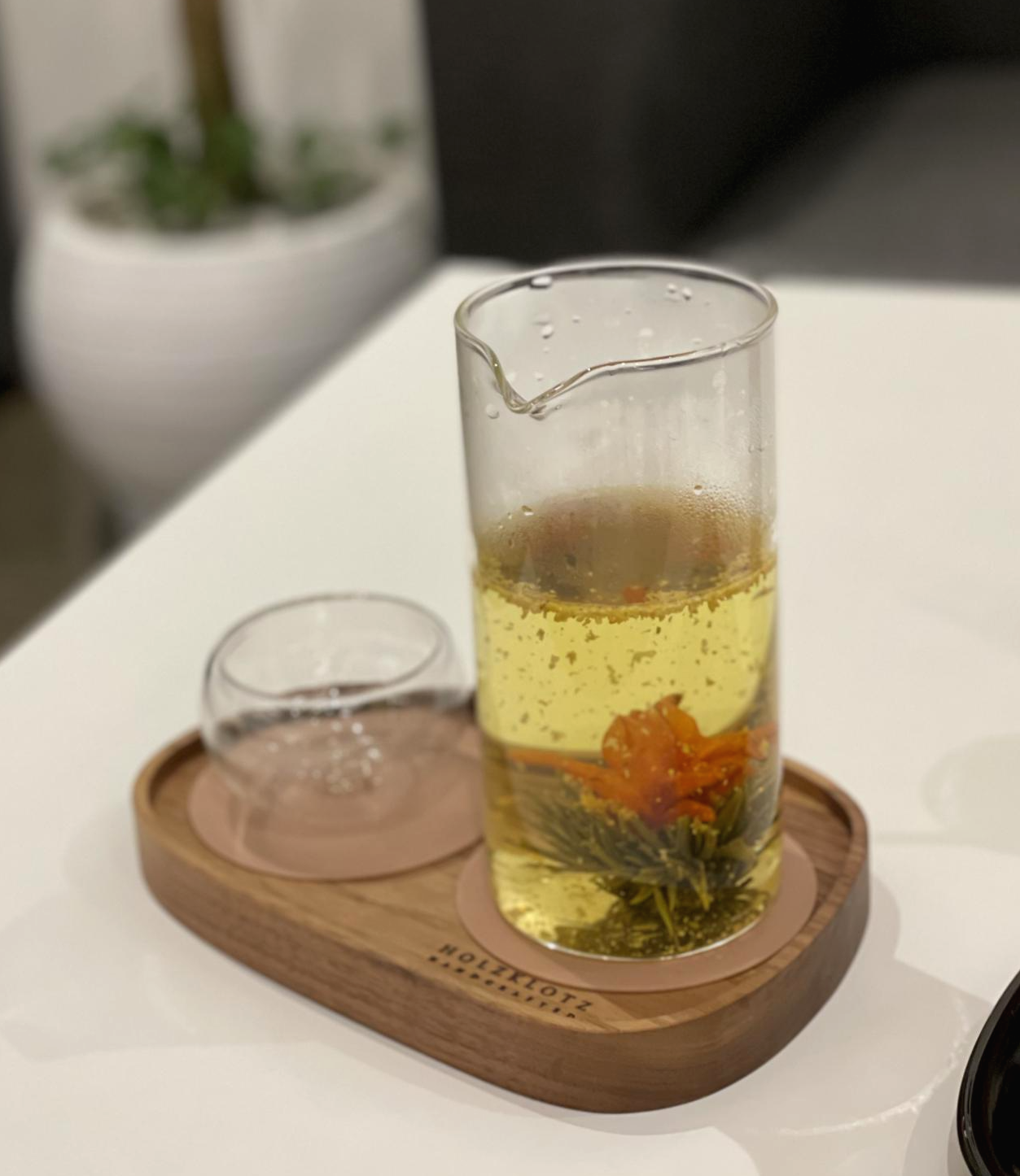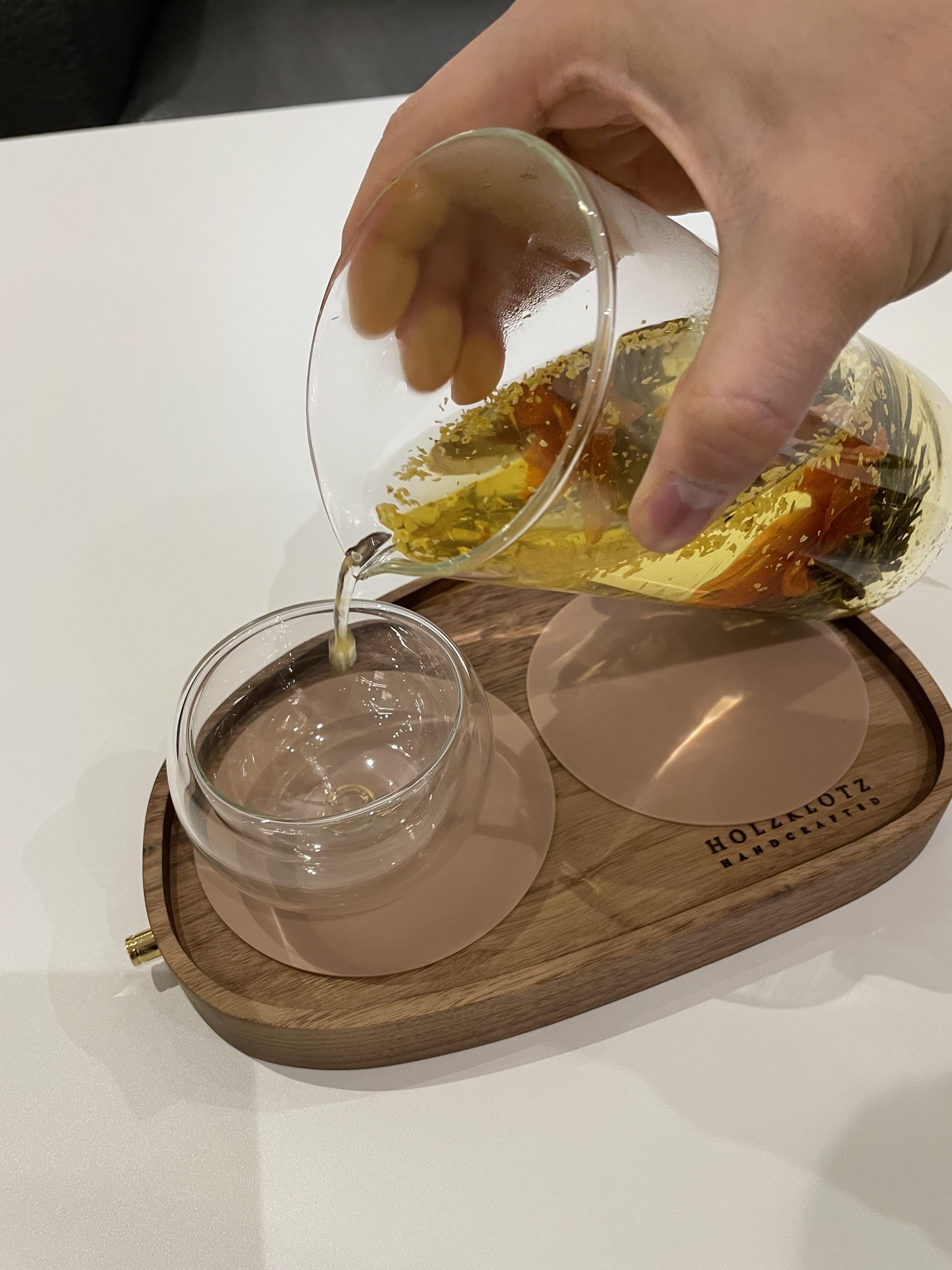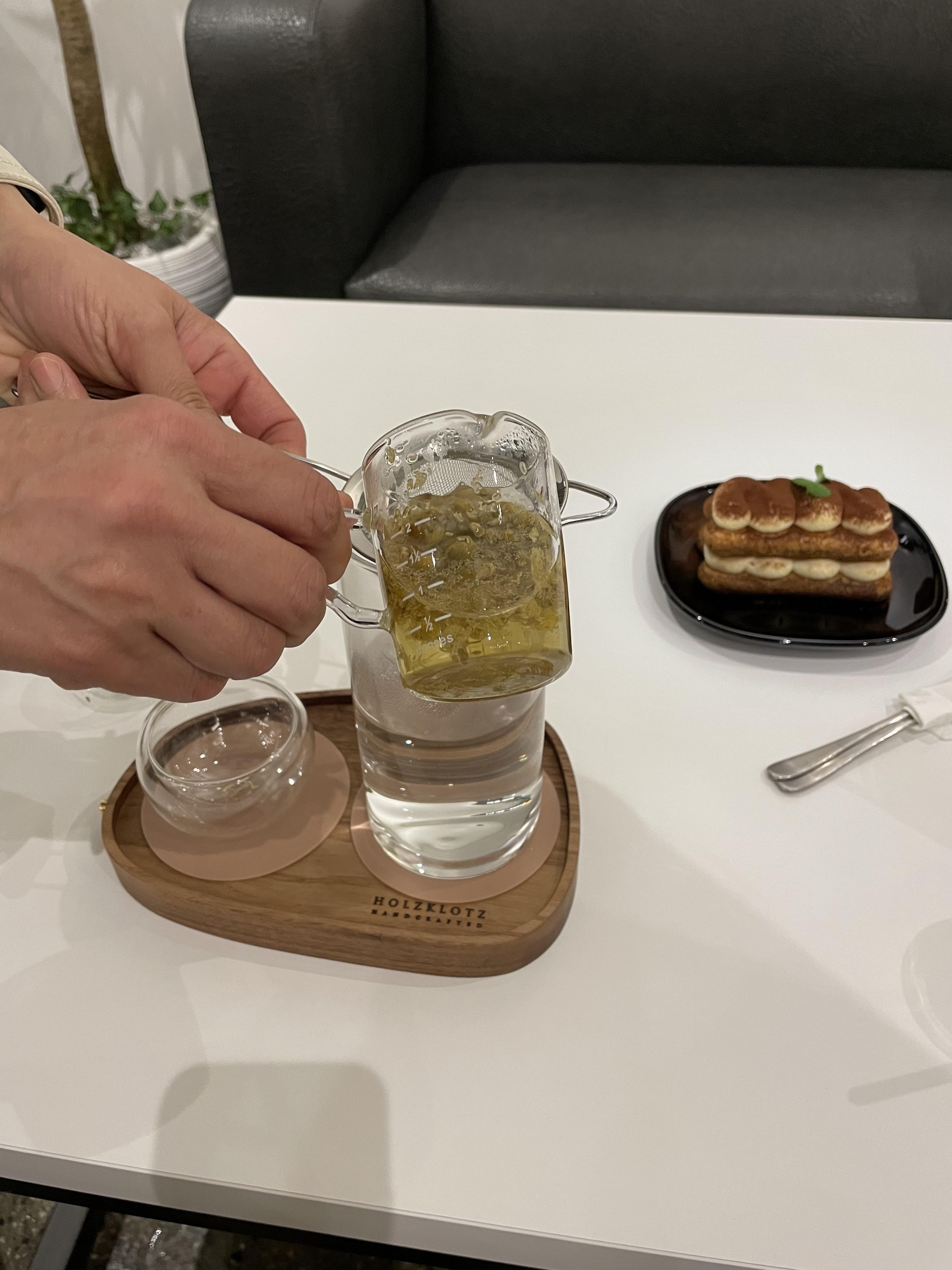 카모마일 블루밍티가 좀 특별한데, 처음에 따뜻한 물만 담은 상태로 나와서, 직원분께서 직접 카모마일을 체에 걸러 우려 주시고