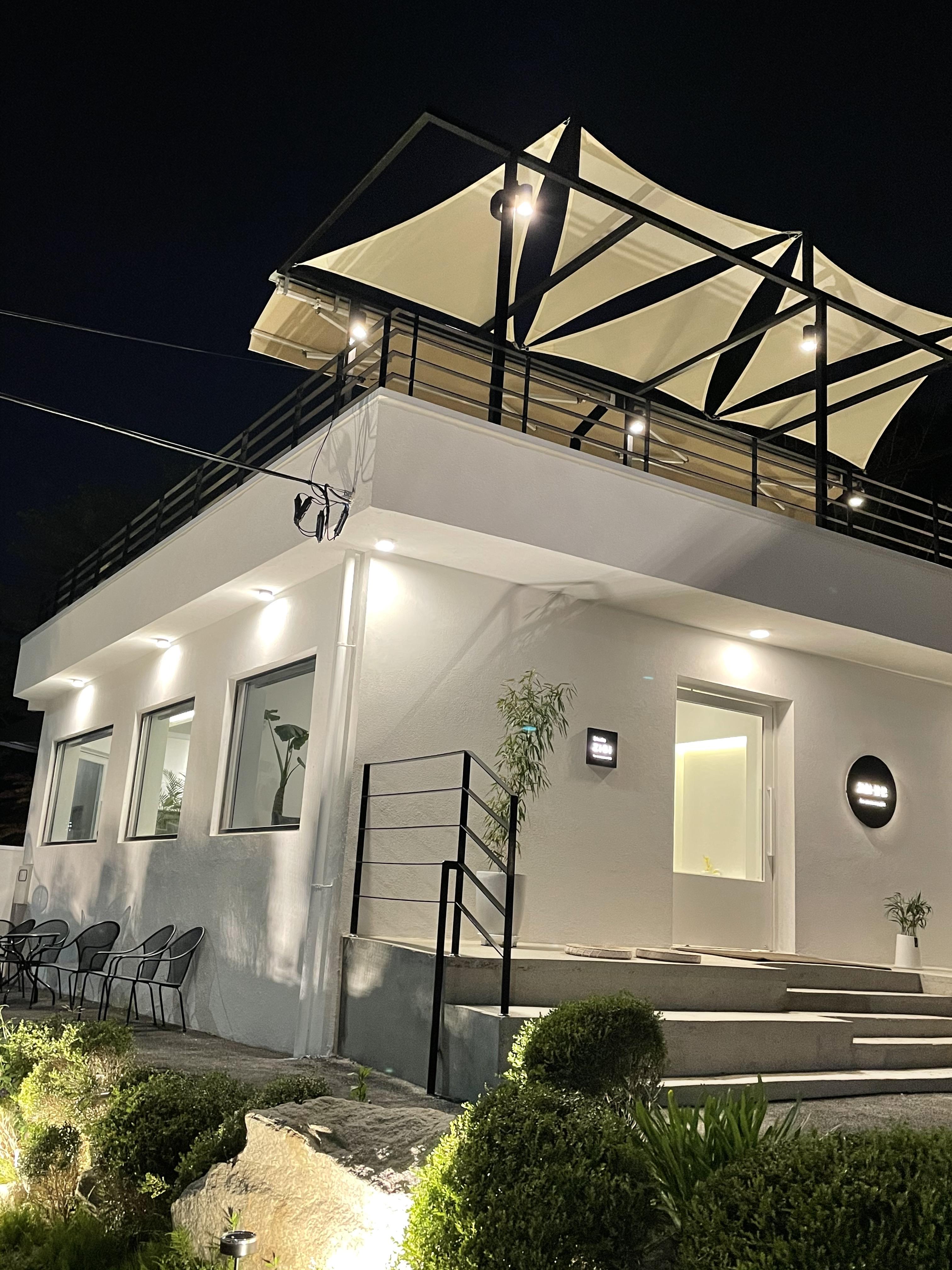 카페의 구성은 주차장을 사이에 두고, 이렇게 두 채로 되어 있어요. 두 건물 모두 앉을 수 있게 되어있지만, 주문은 삼각지붕의 본 건물에서 하셔야 해요.