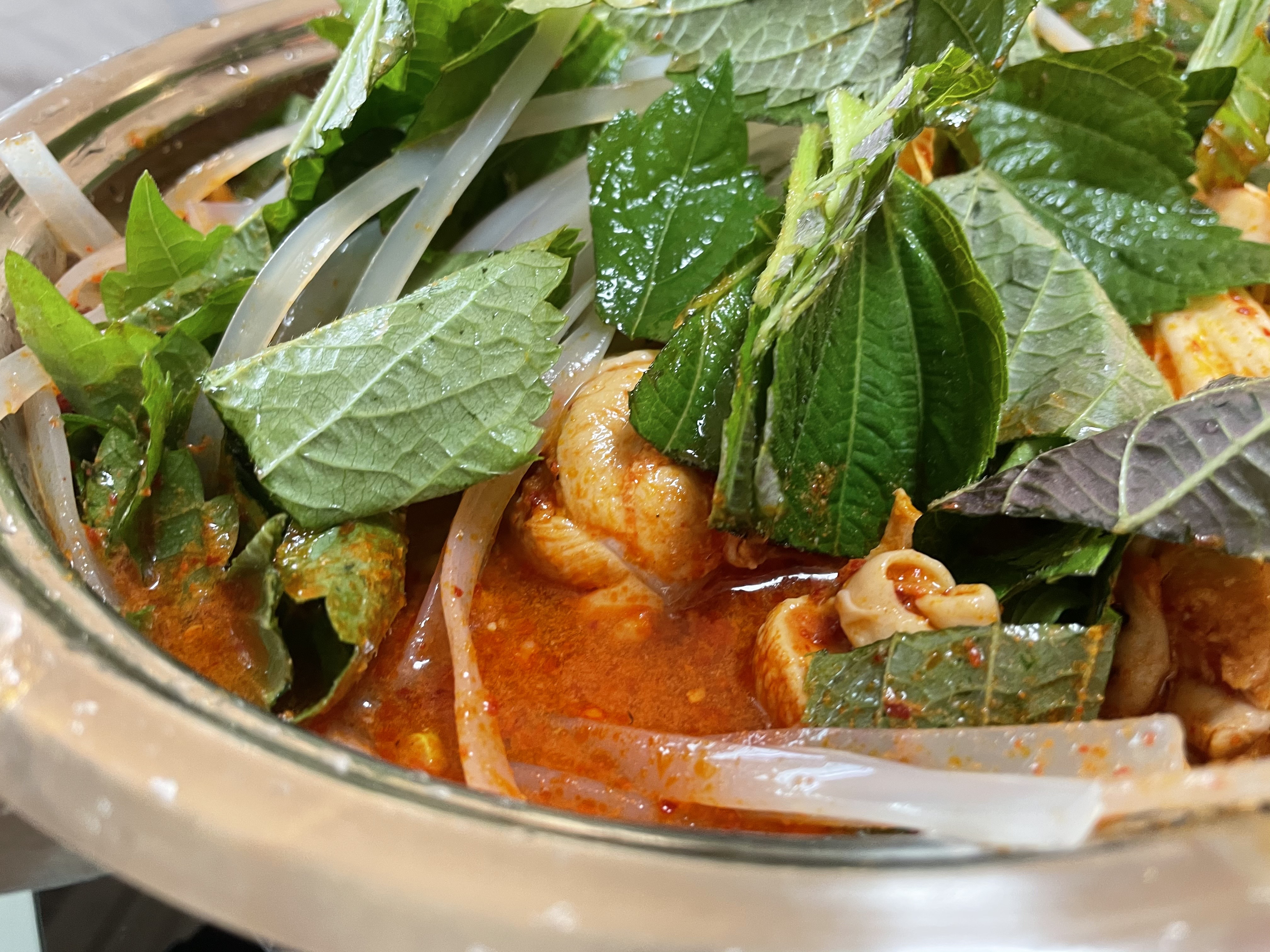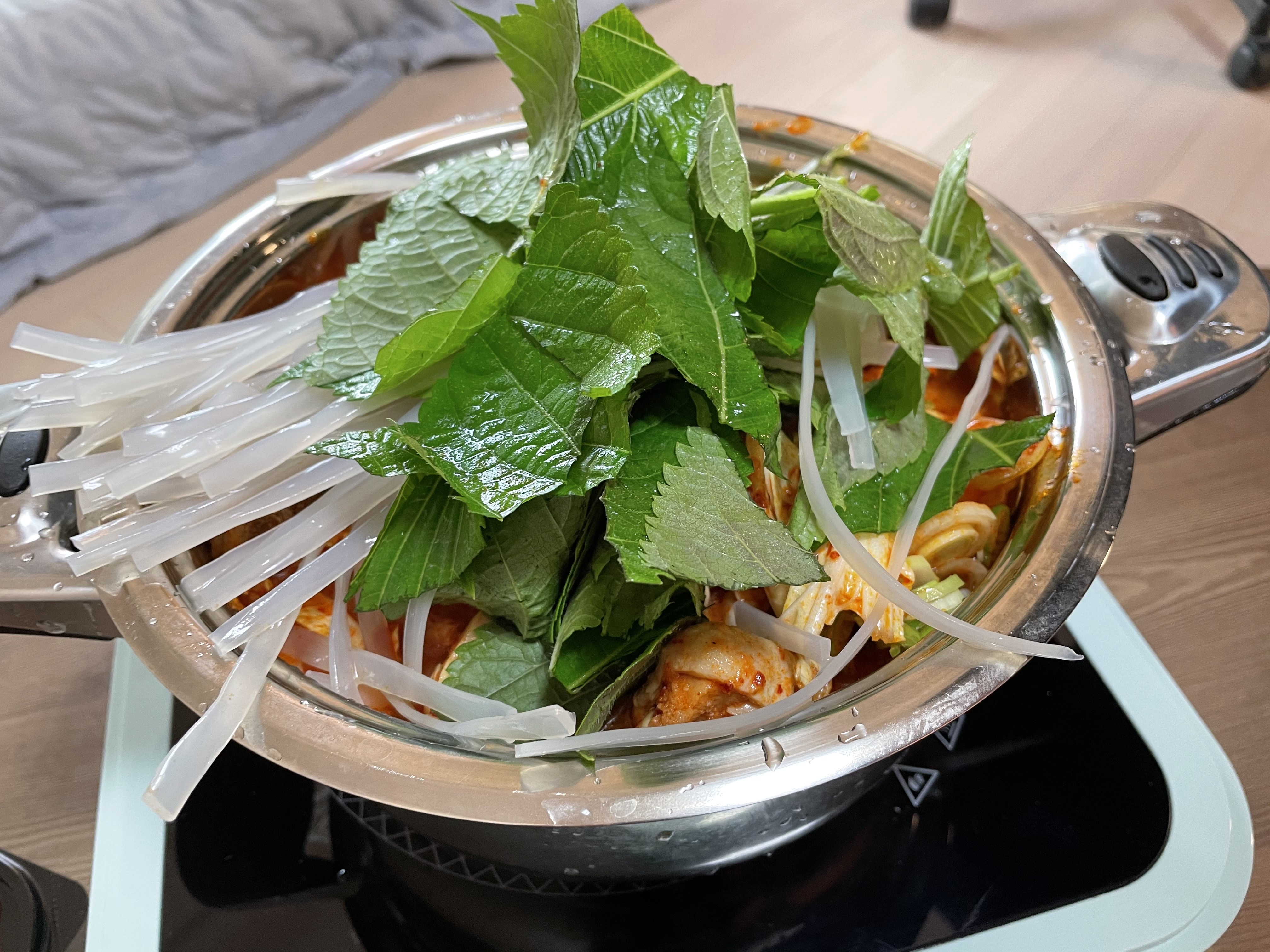 비슷한 크기의 냄비에 조심히 담고, 그 위에 깻잎과 당면 사리를 넣어줬어요.