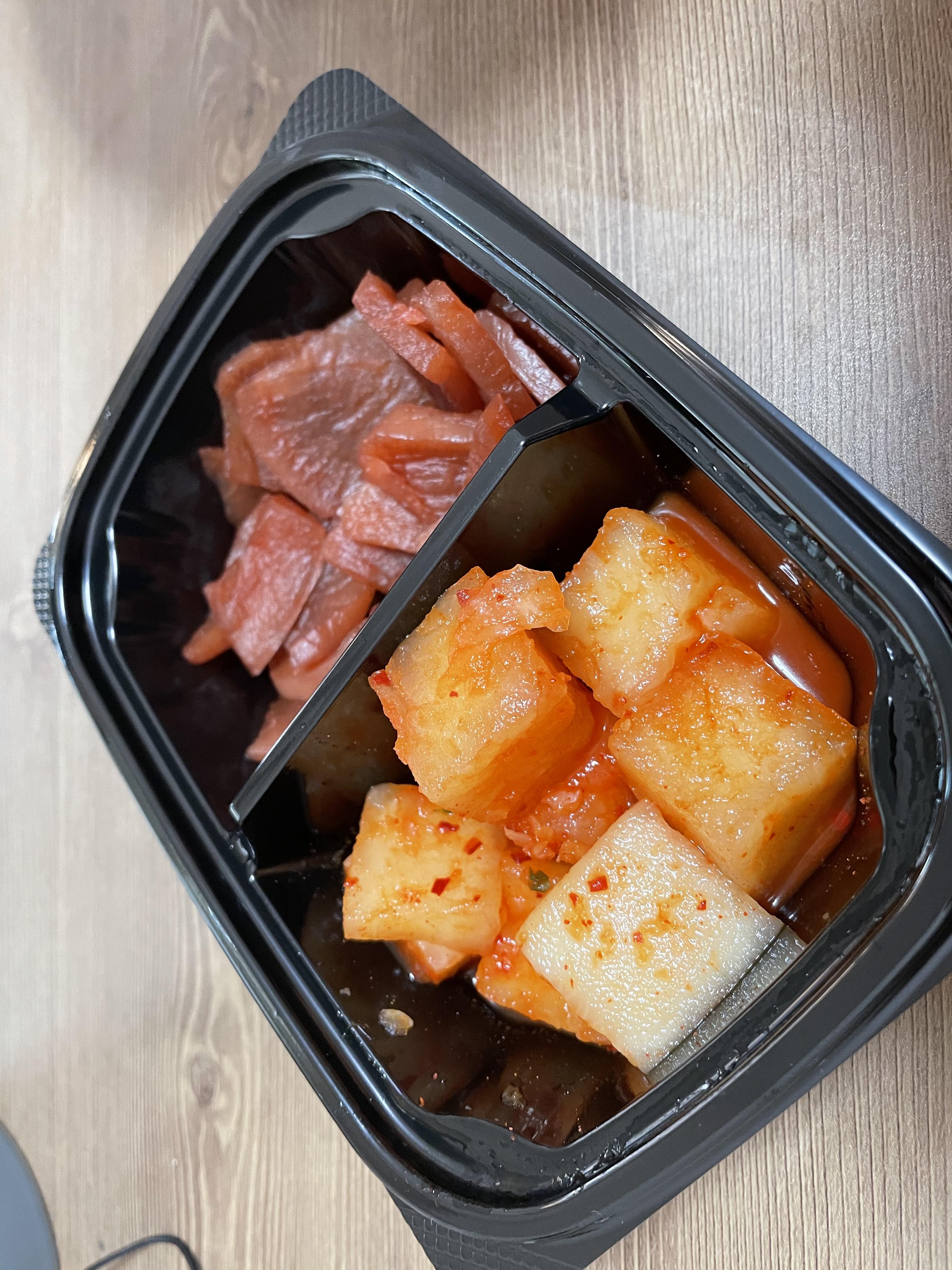 이러한 구성입니다. 곱도리탕 + 깻잎과 넓적 당면 사리 + 깍두기와 단무지(?) 같은 걸 넣어주셨구요.