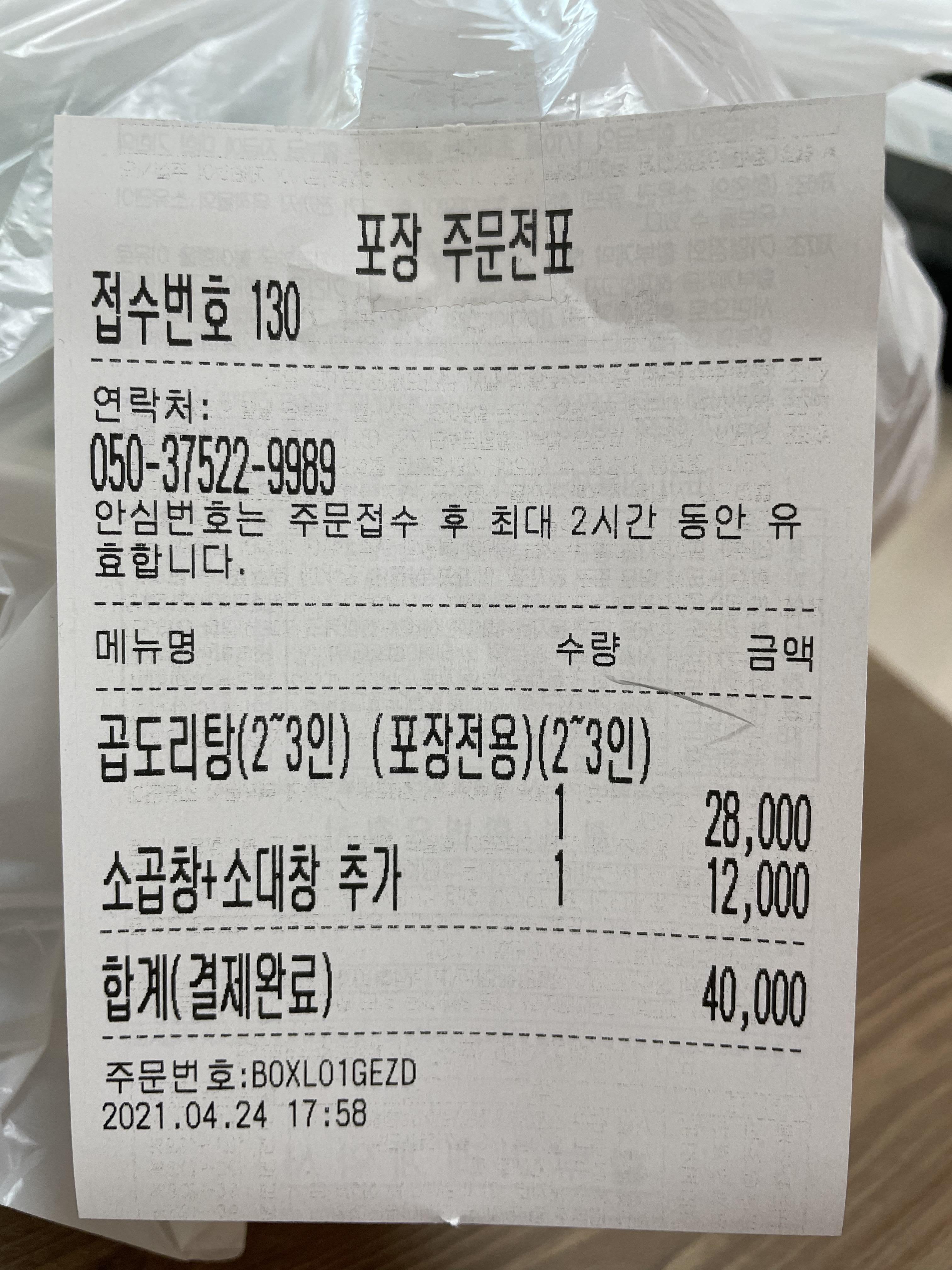 2명이라서, 2-3인용 곱도리탕을 주문하고, 혹여나 곱창과 대창이 아쉽게 들어가 있을까 봐 추가를 했어요. 총 40,000원이네요. 배달의 민족으로 포장 주문을 했어요!