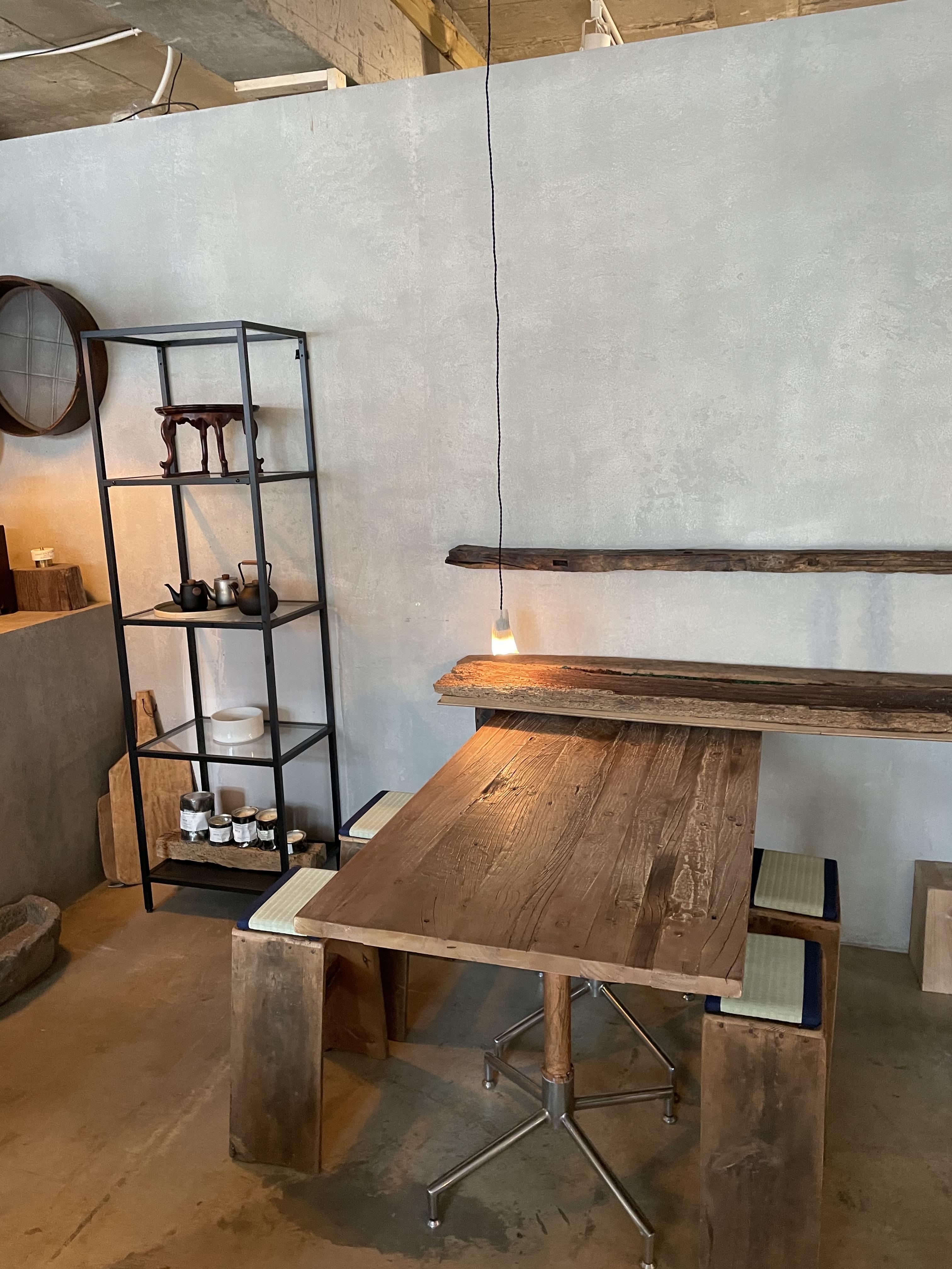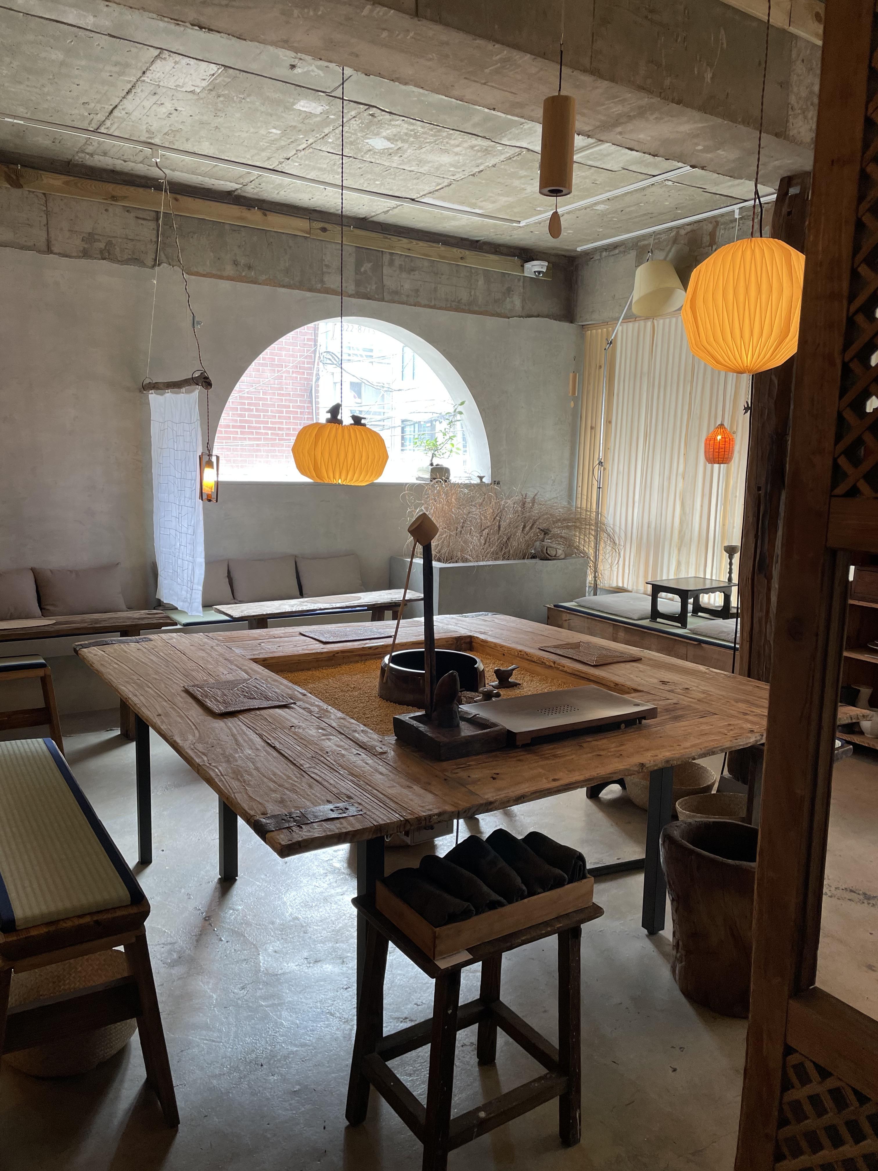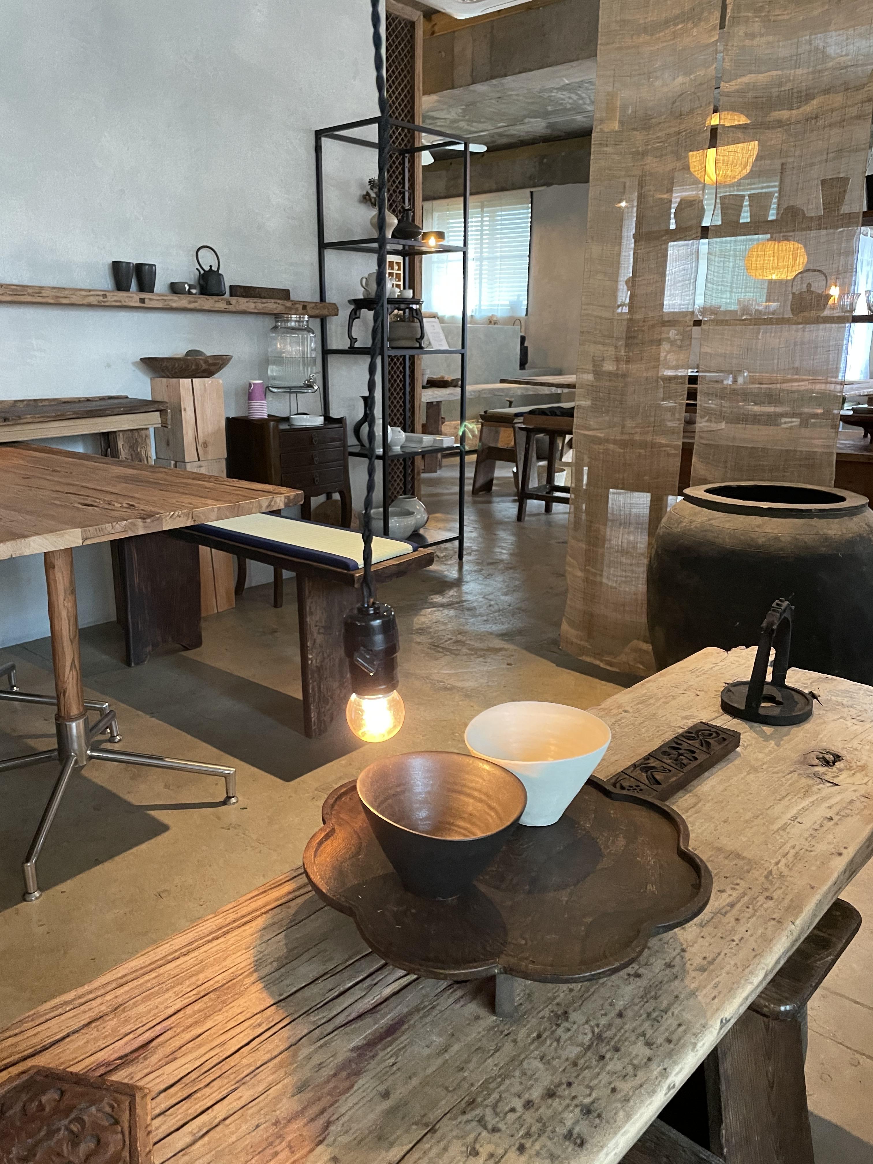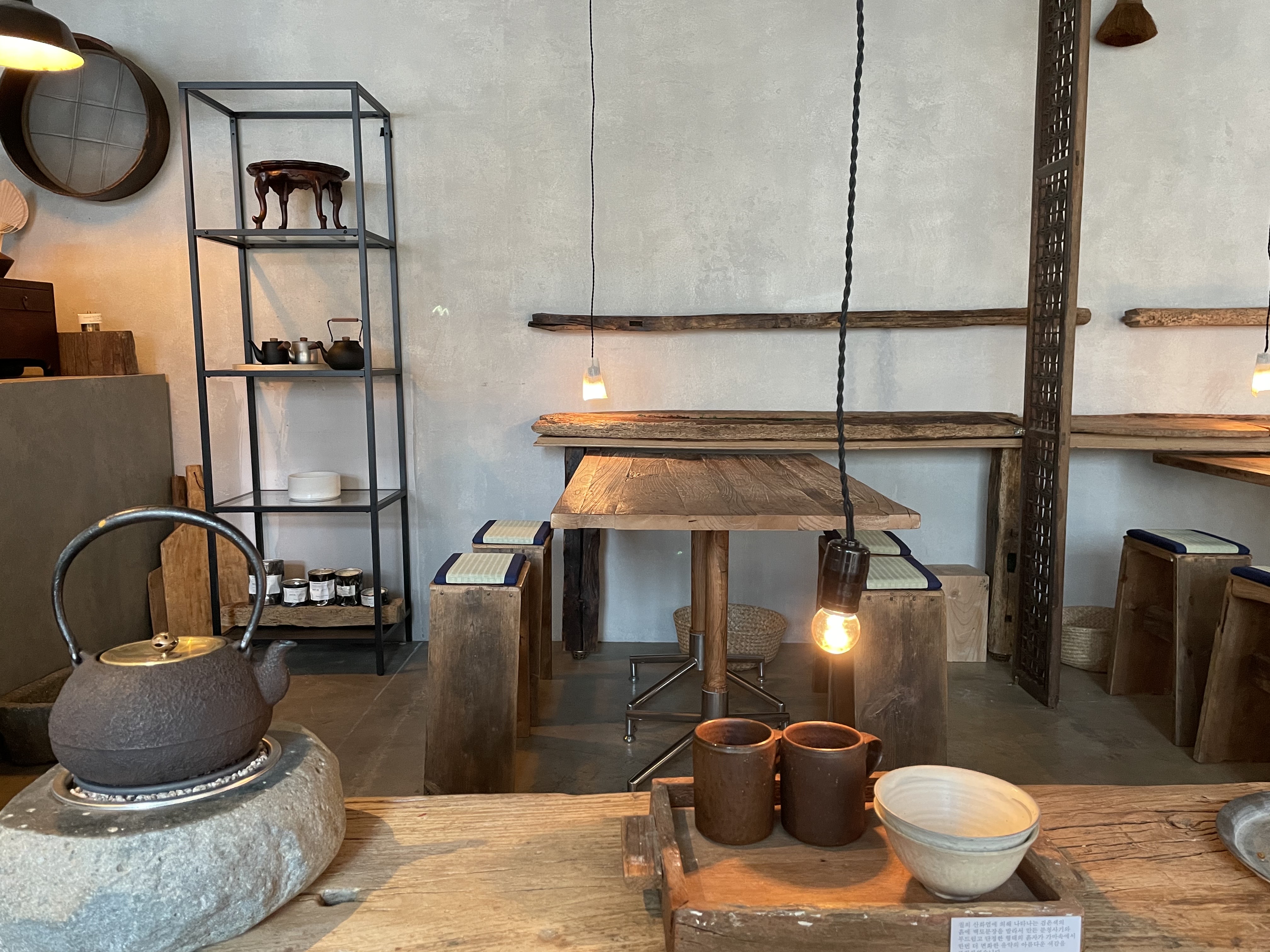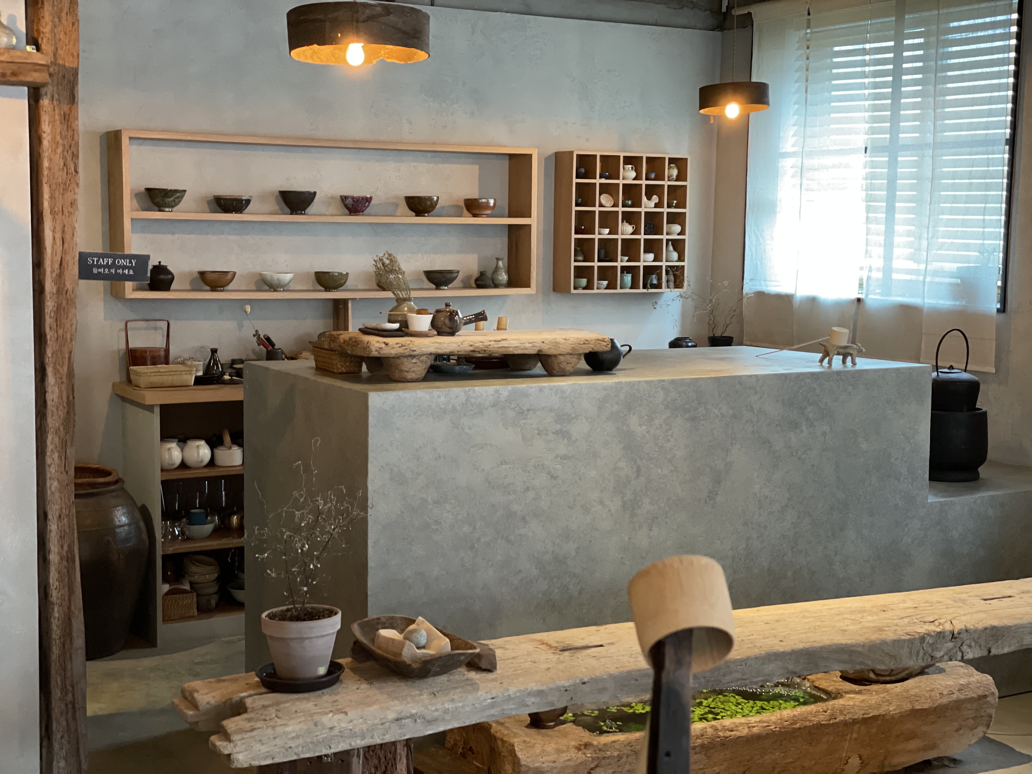 도예를 기반으로 하는 곳이기 때문에, 곳곳에 도기들이 많았어요. 전반적으로 고목으로 만들어진 가구들, 노출콘크리트 천정과 벽에서 거친 노마드(유목민)의 느낌이 났지만, 그 또한 정갈하게 손 때가 탄 느낌이었어요. 그만큼 신경을 많이 쓰셨던 거겠죠?