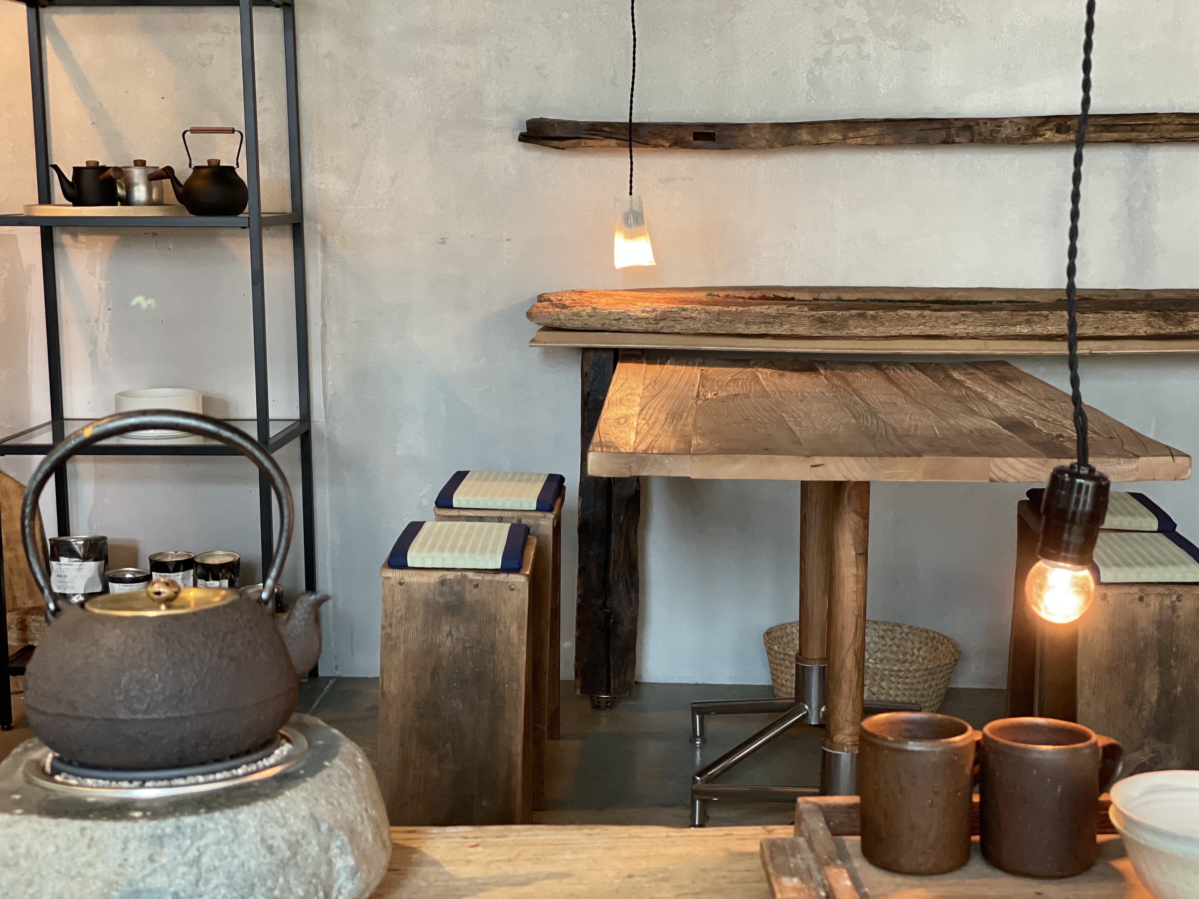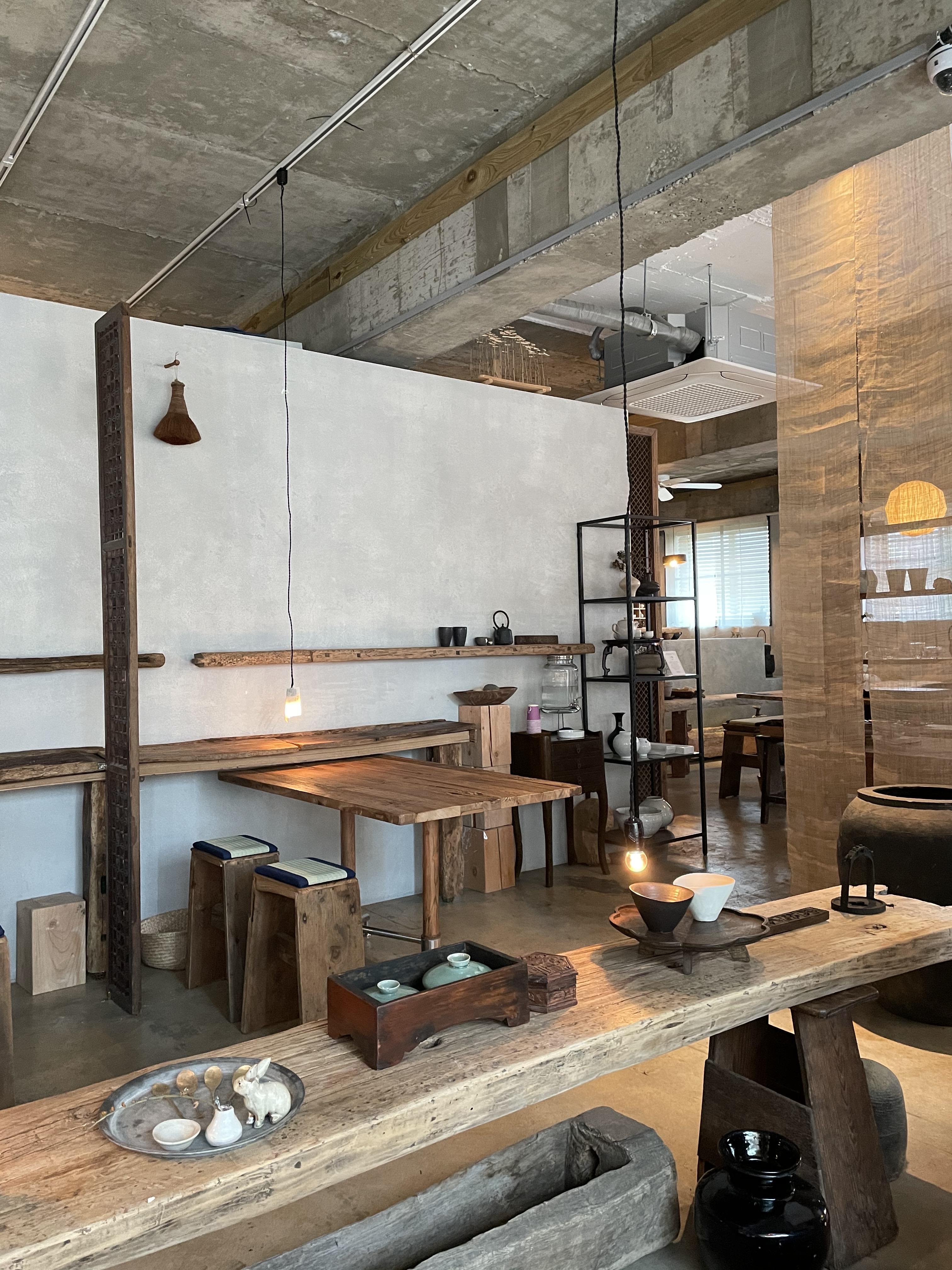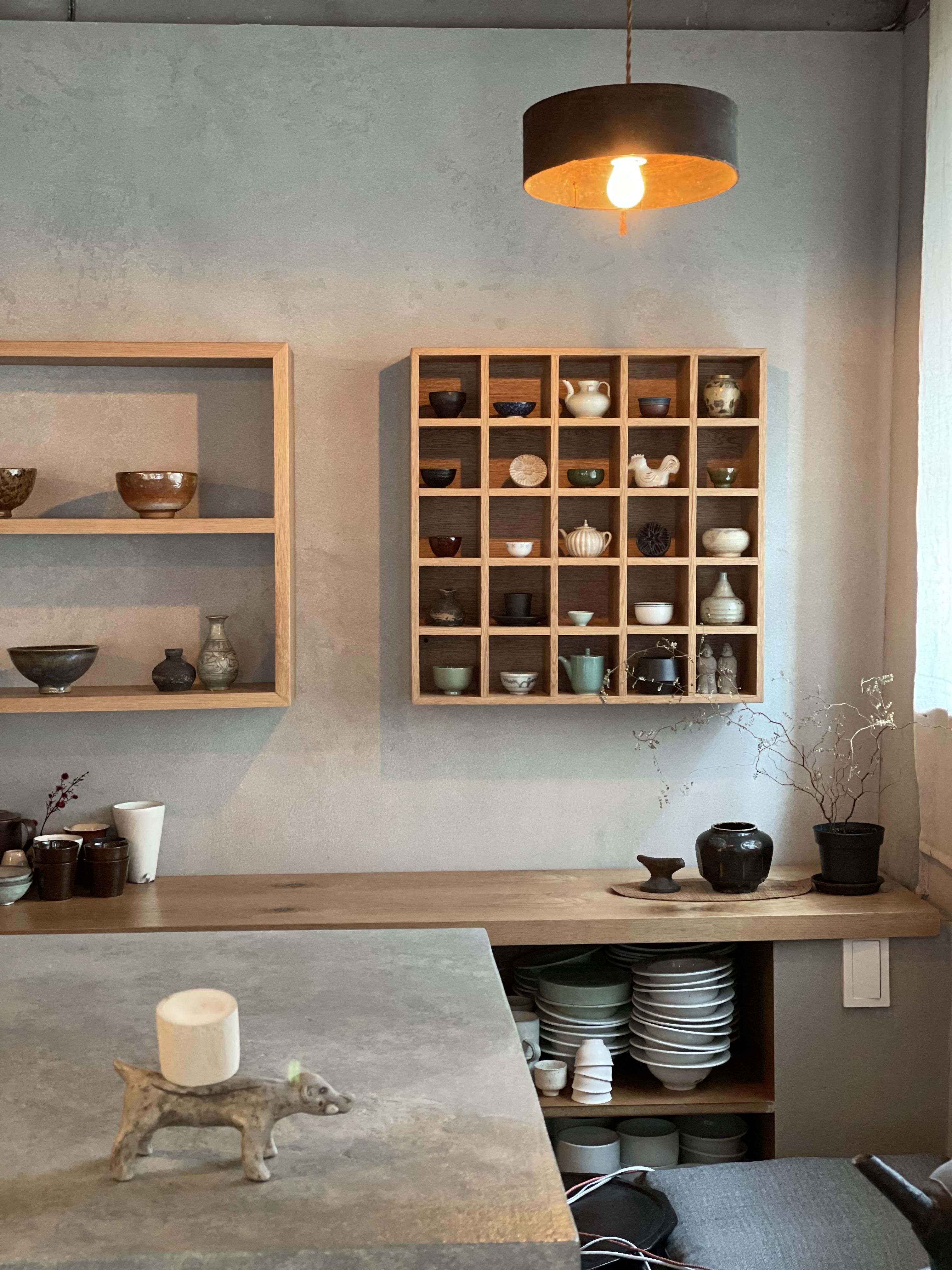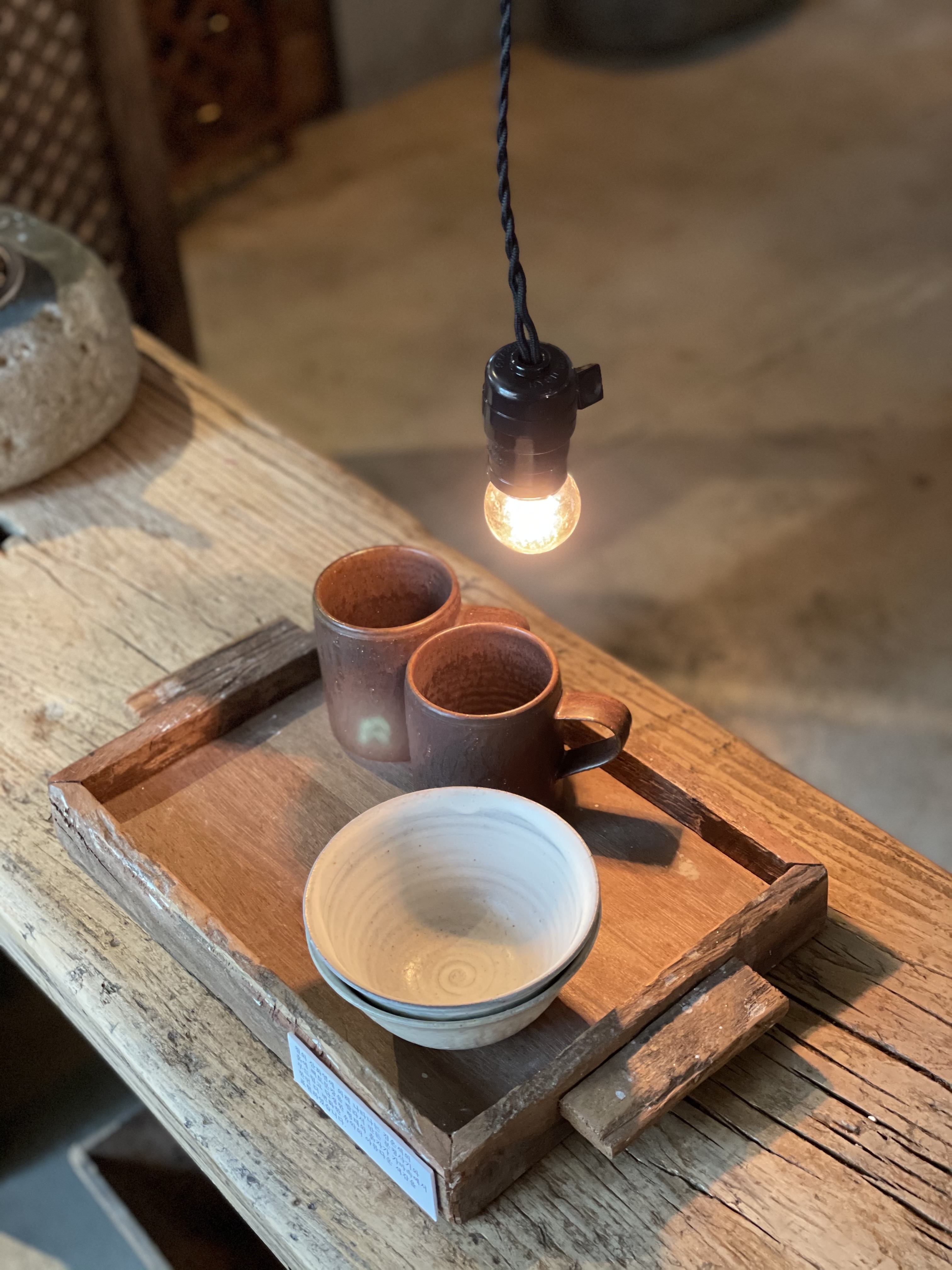 도예를 기반으로 하는 곳이기 때문에, 곳곳에 도기들이 많았어요. 전반적으로 고목으로 만들어진 가구들, 노출콘크리트 천정과 벽에서 거친 노마드(유목민)의 느낌이 났지만, 그 또한 정갈하게 손 때가 탄 느낌이었어요. 그만큼 신경을 많이 쓰셨던 거겠죠?