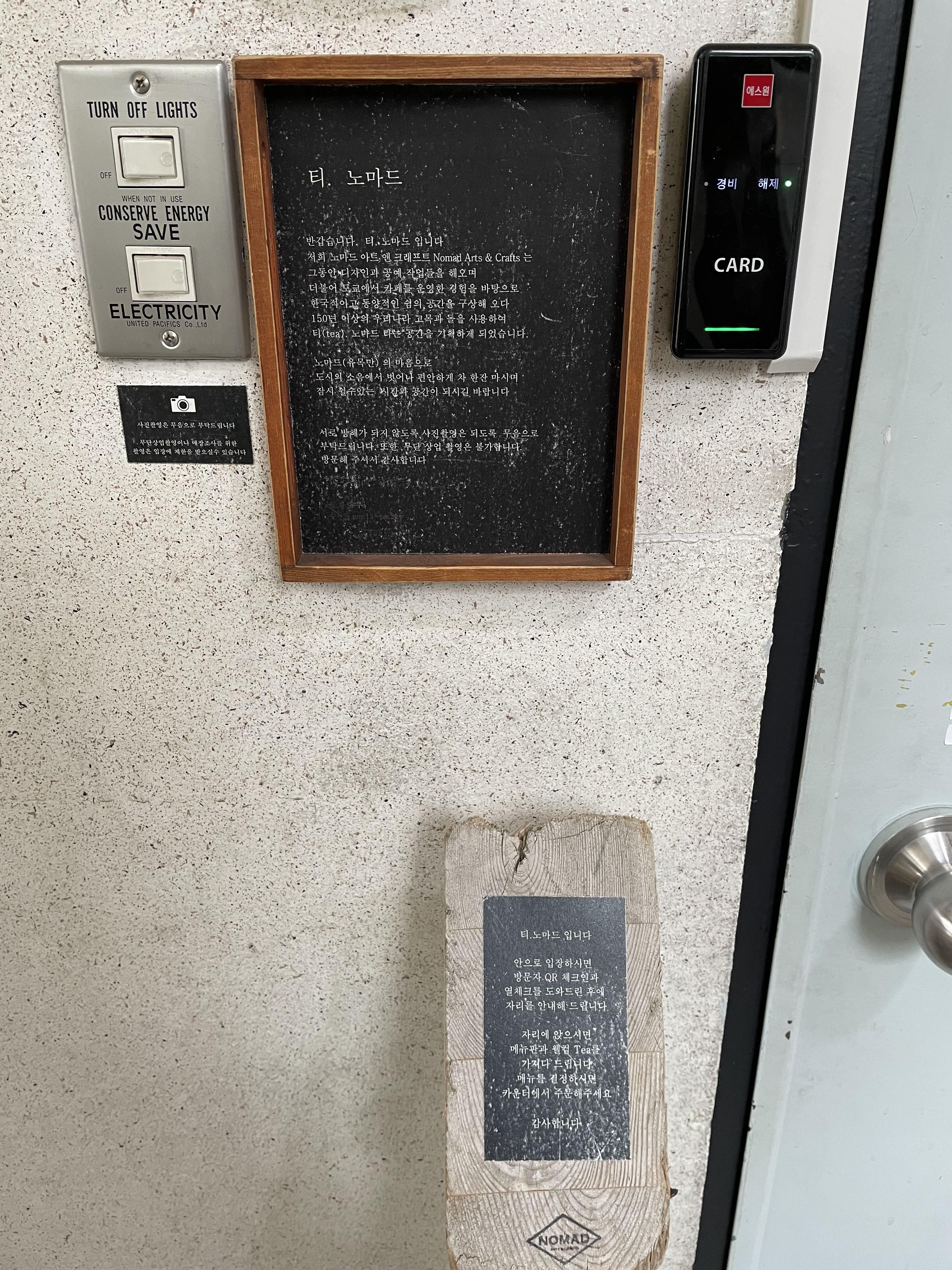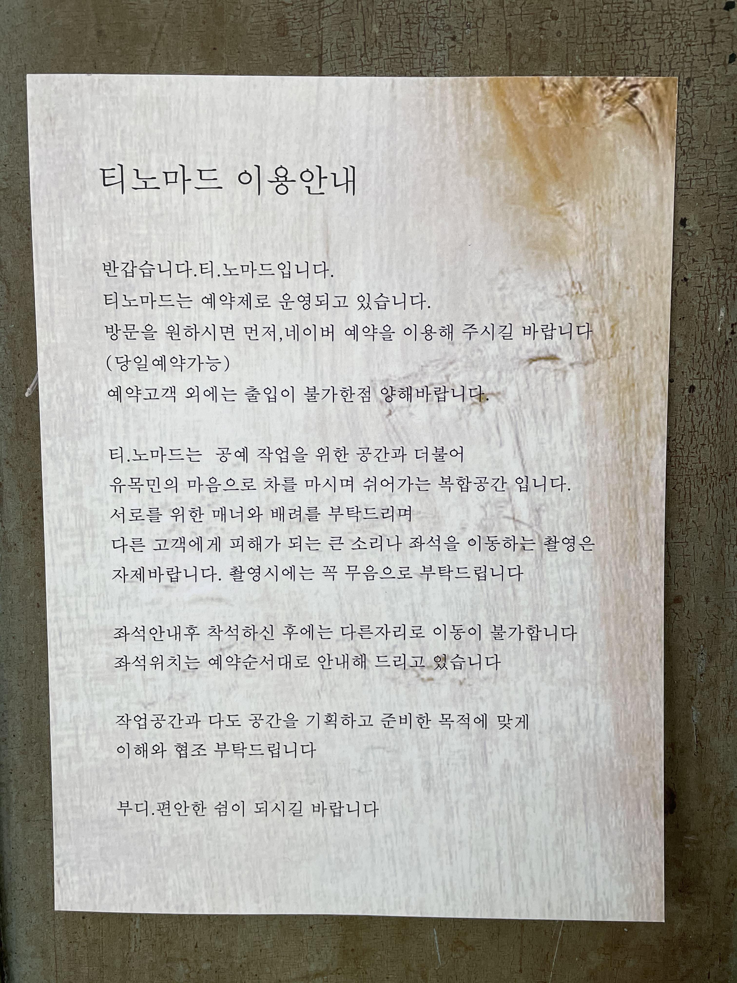 티노마드는 노마드 아트 앤 크래프트가 만든 공간이래요. 디자인과 공예 작업들을 해오며, 도쿄에서 카페를 운영한 경험을 바탕으로 한국적이고 동양적인 쉼의 공간을 구상해 오다 이 공간을 기획하게 되었다고 적혀 있네요.