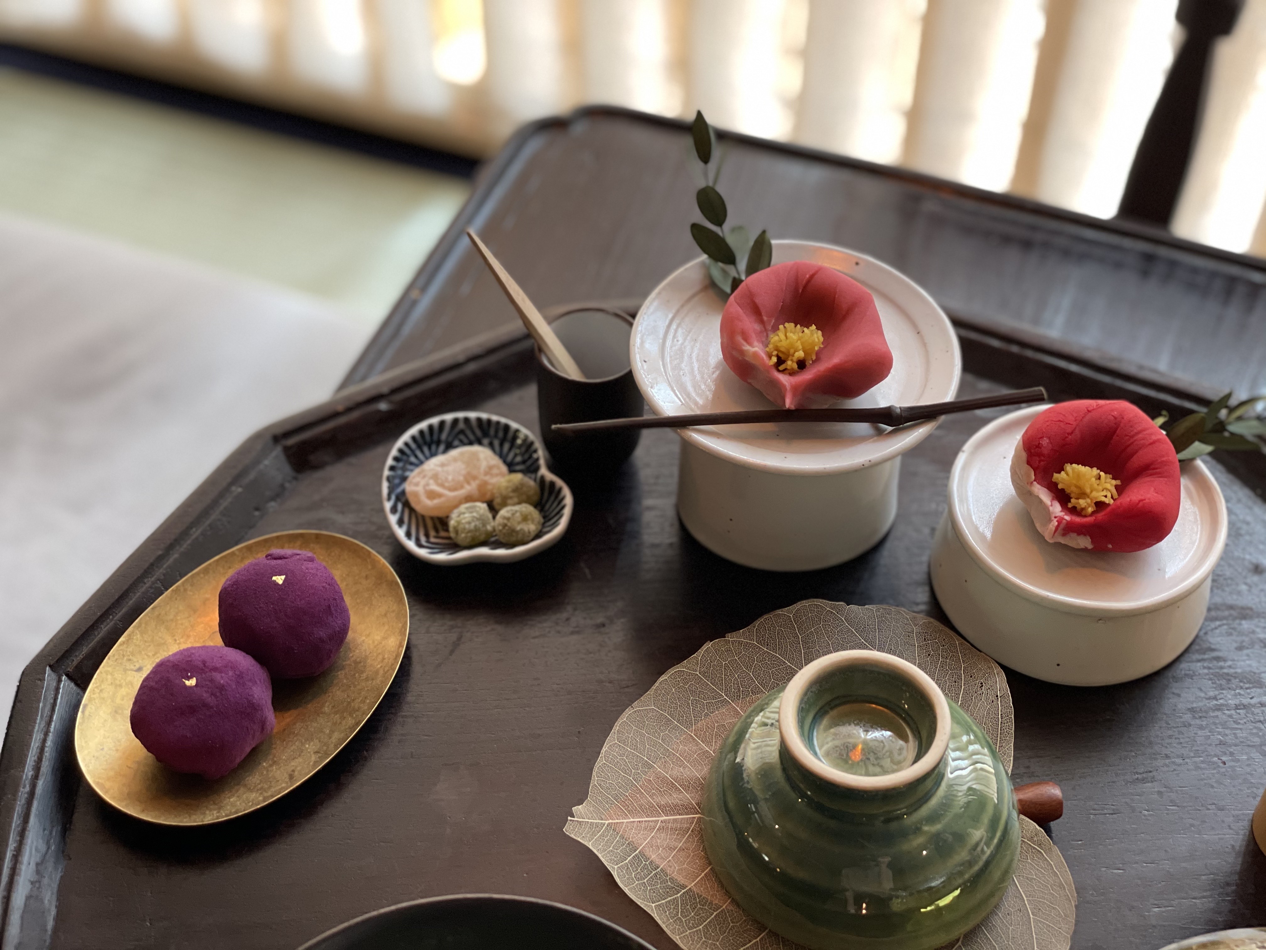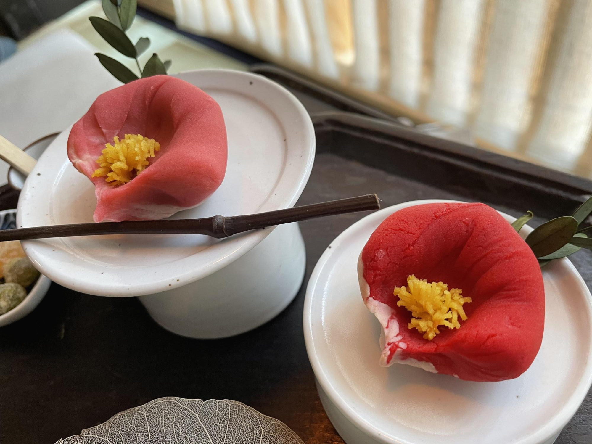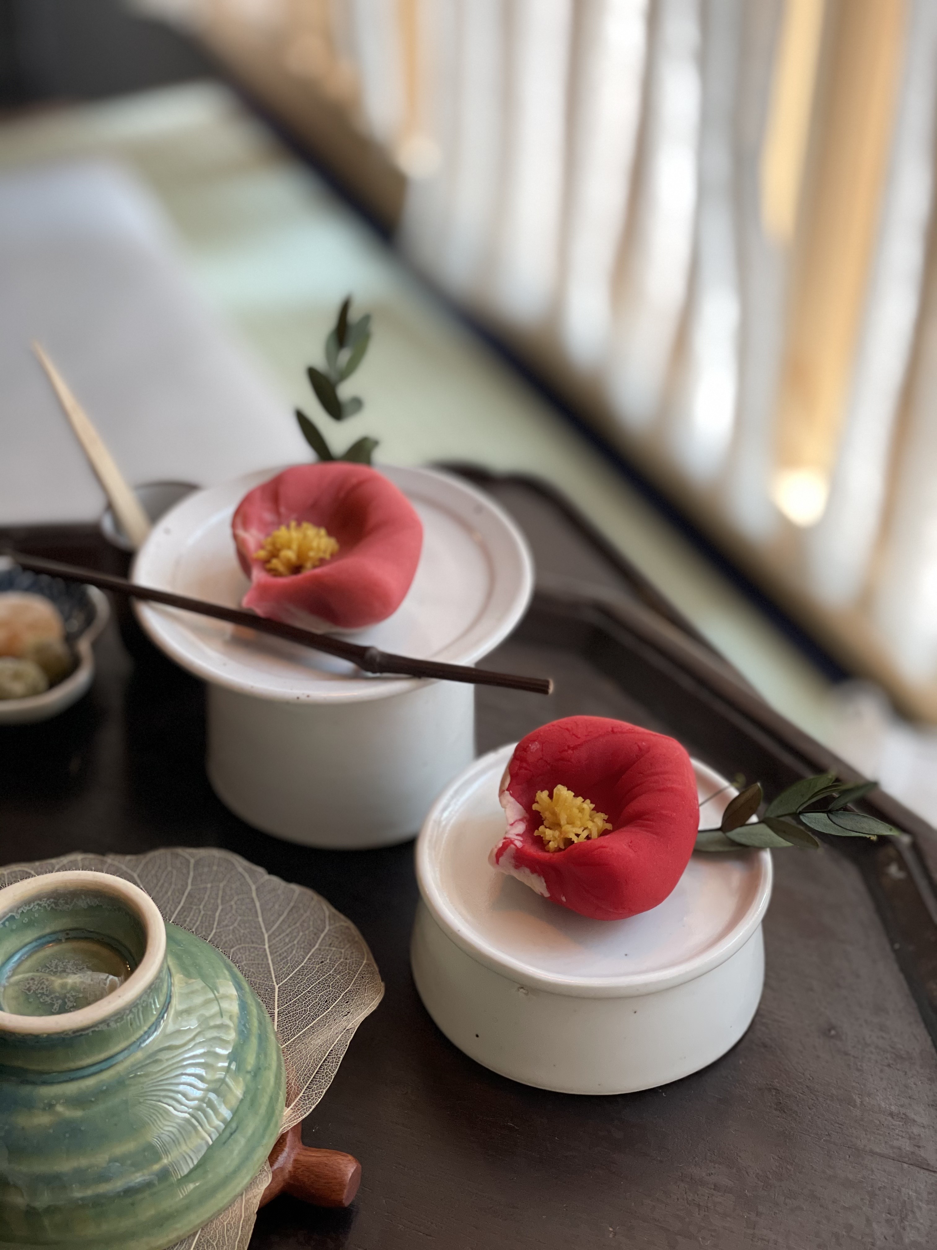 화과자는 동백꽃인데, 앙금으로 만들어진 화과자예요.