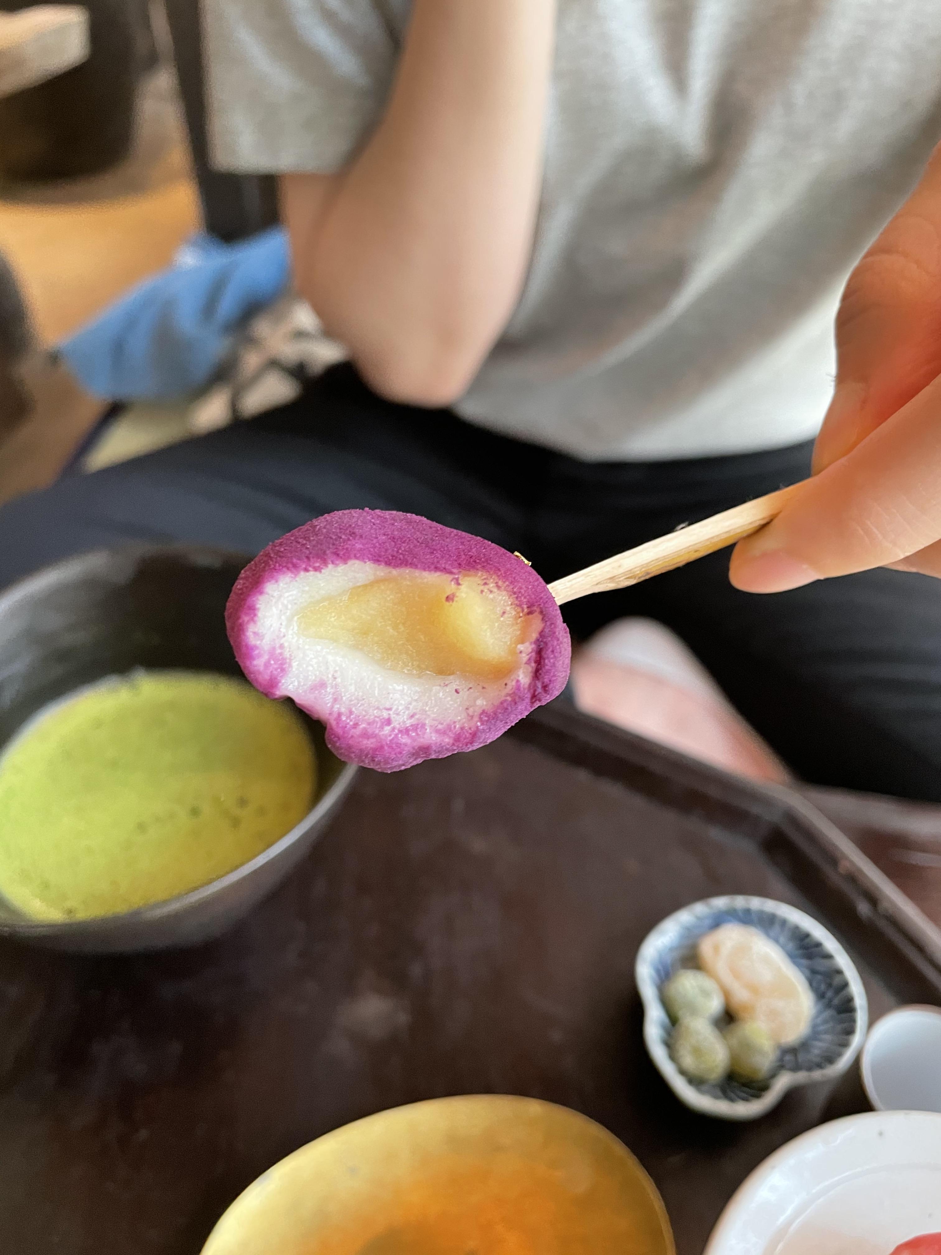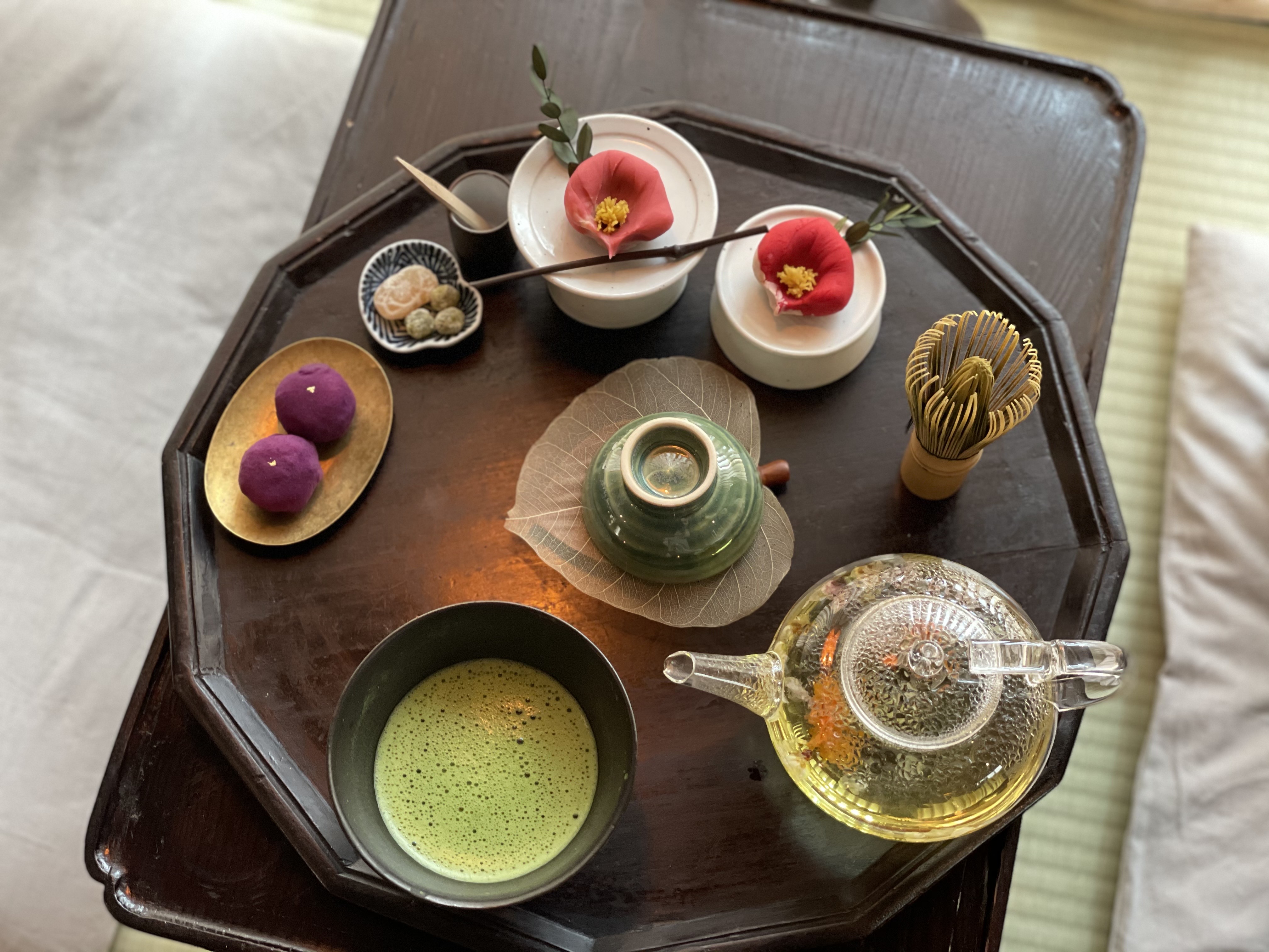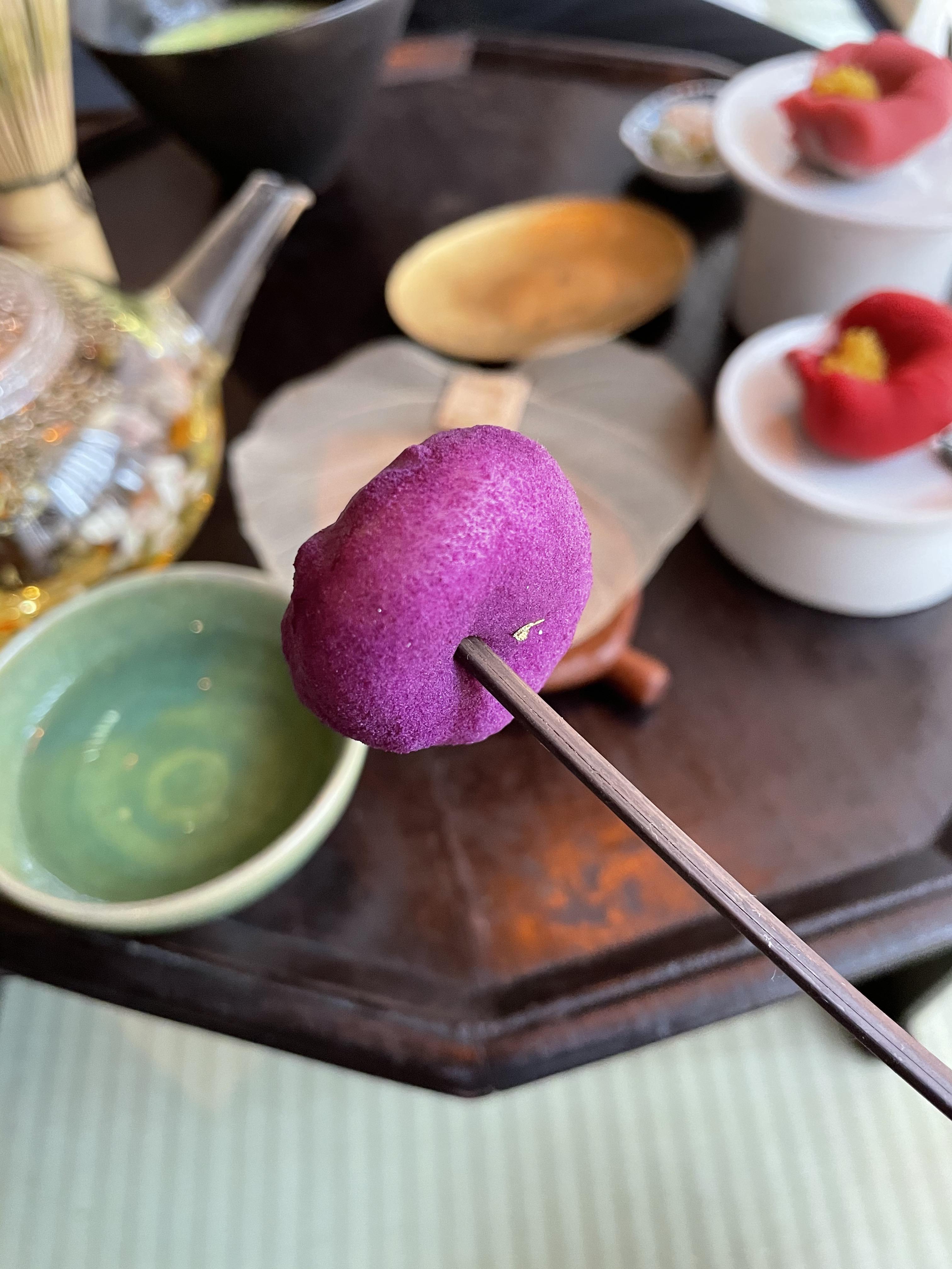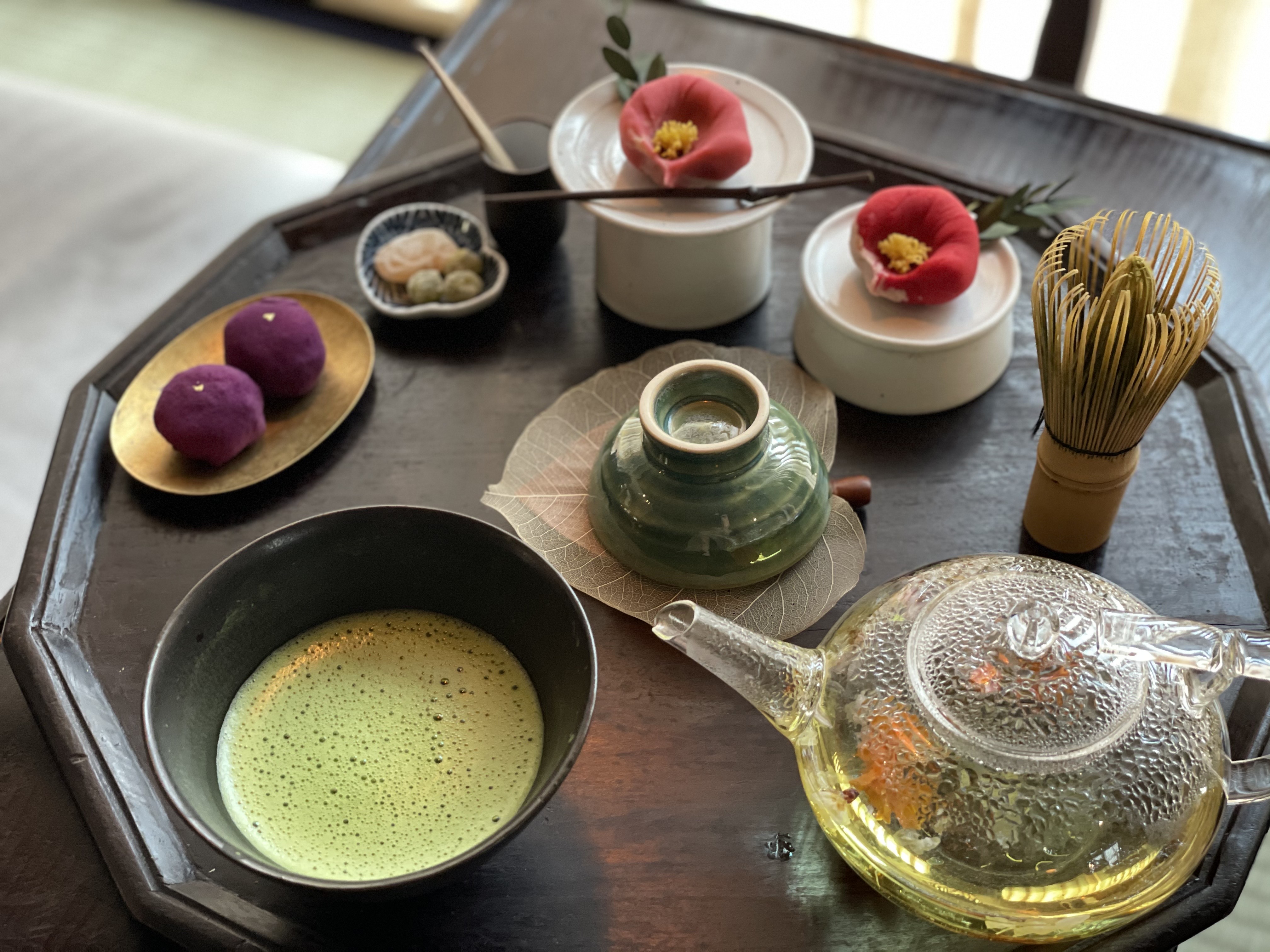 화과자는 동백꽃인데, 앙금으로 만들어진 화과자예요.