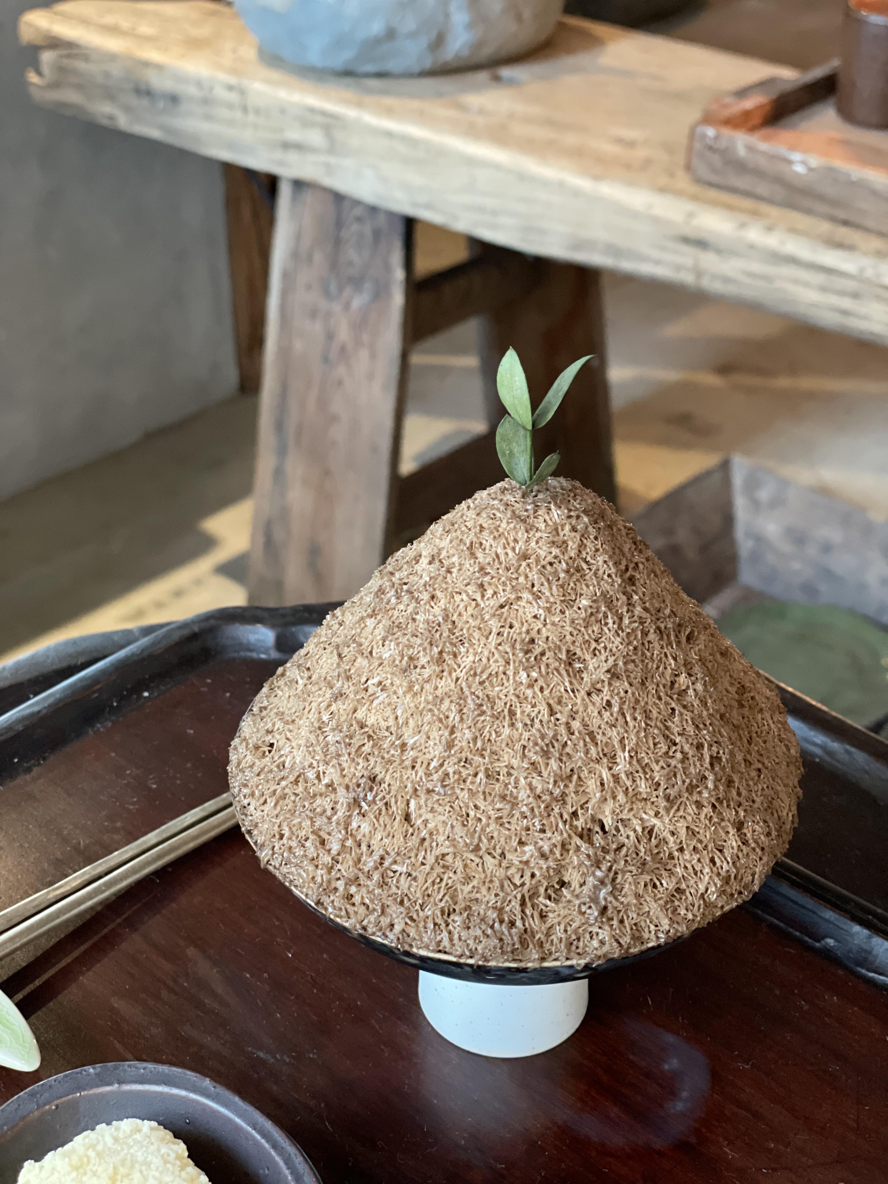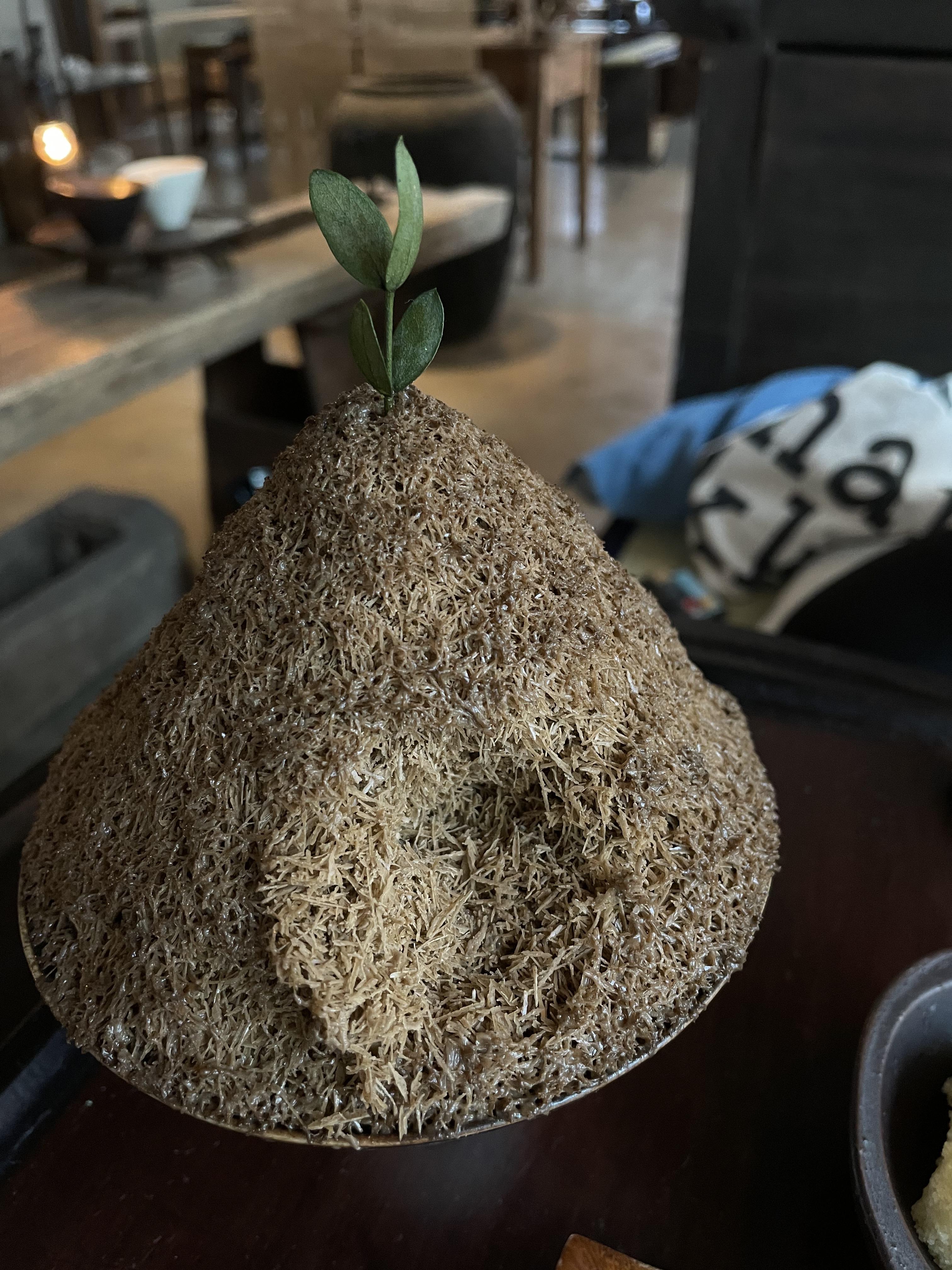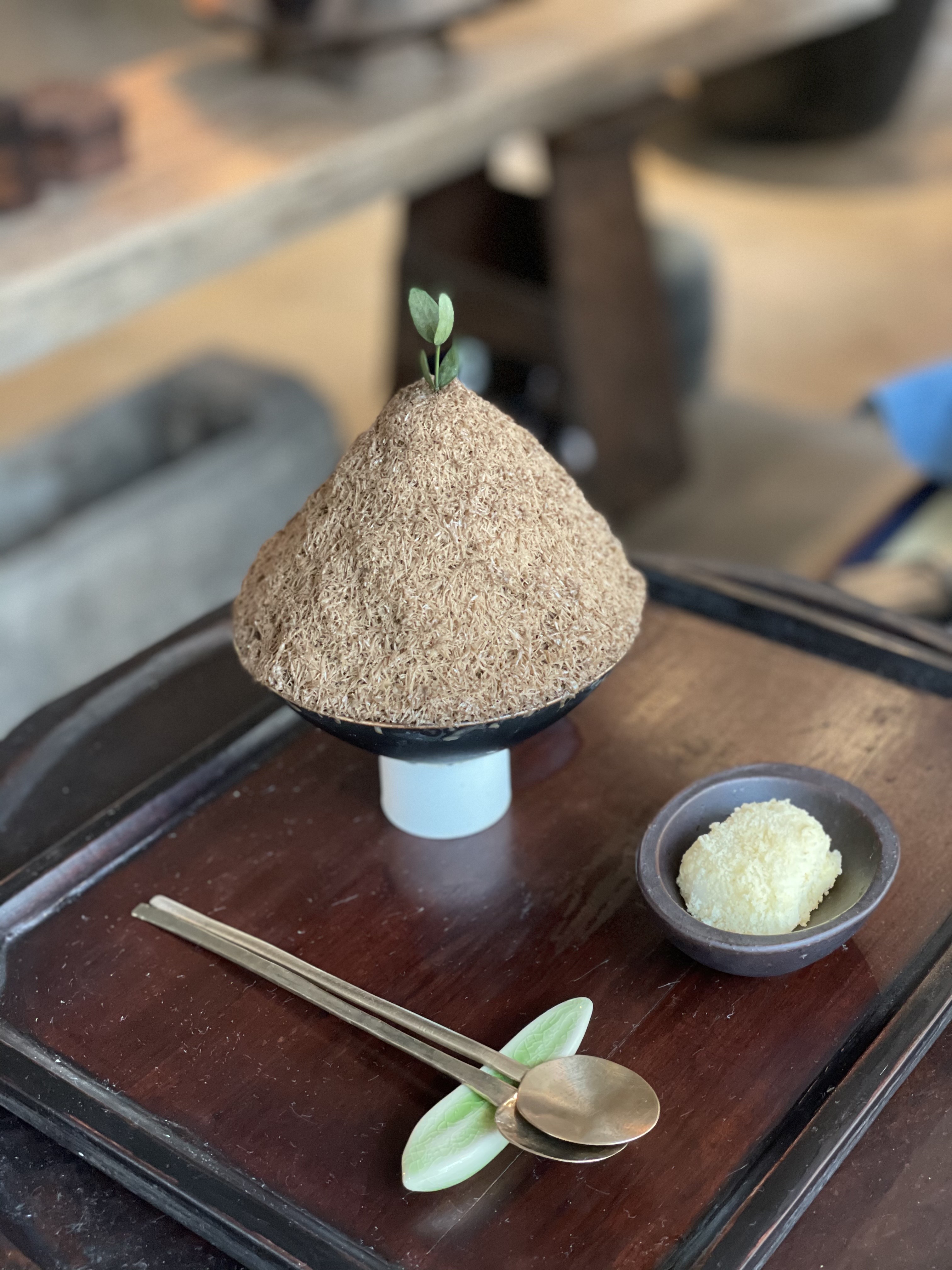 한 입 먹어봤어요. 저는 이 빙수가 참 맛있어서 좋았어요. 차를 잘 모르는 저에게 다른 차들은 음 좋다, 깊은 맛이구나, 정도의 느낌만 있었는데 이 호지차 베이스 빙수는 우유 빙수인데도 불구하고, 뒷맛도 깔끔하고 괜찮더라구요. 같이 나온 떡은 부드러운 카스테라떡 같은 맛이었어요.