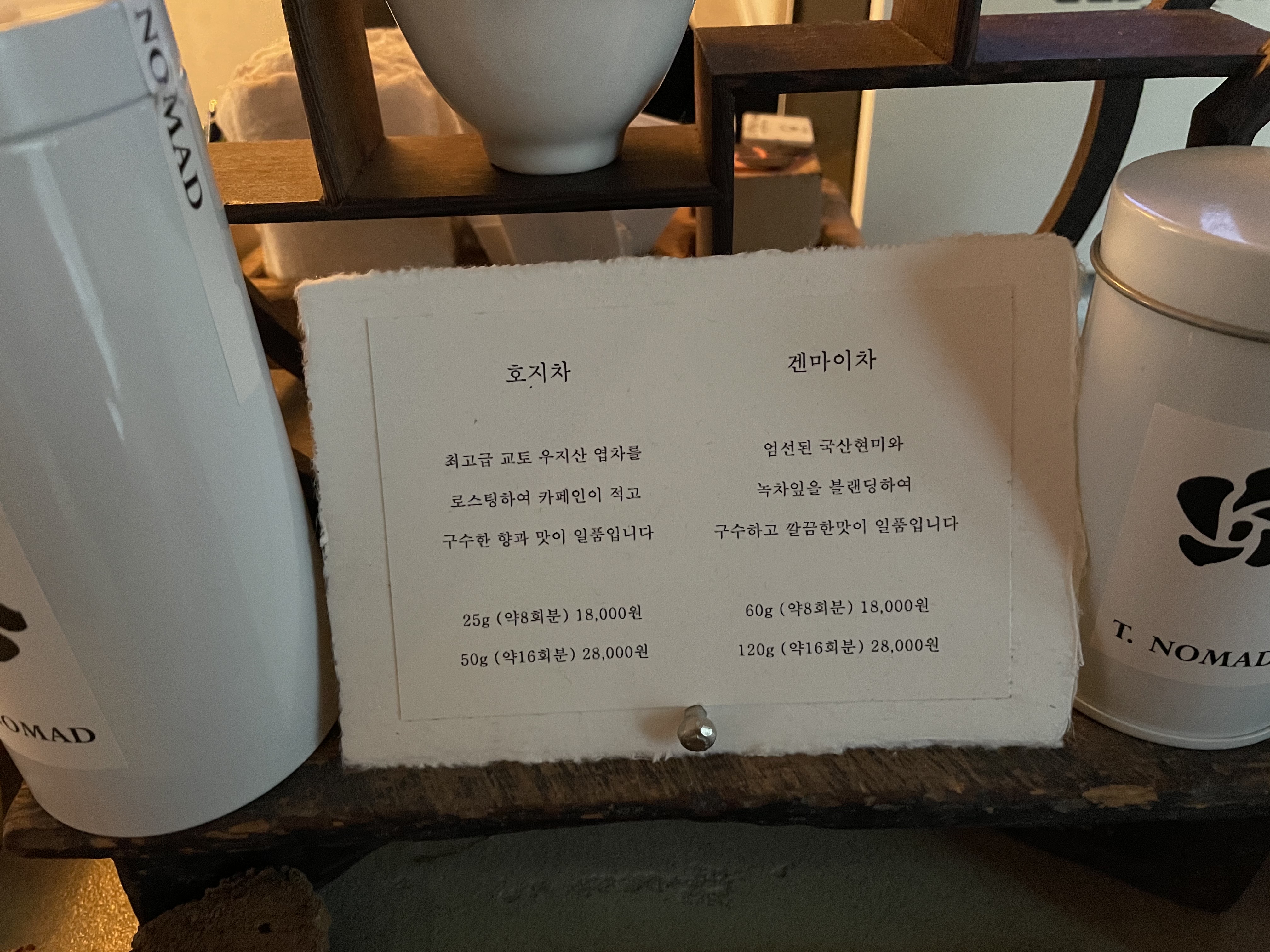 고즈넉한 공간에서 수다를 떨다가 어느덧 1시간 반이 다되어 나가는 길에 카운터를 보니 호지차와 겐마이차를 판매도 하시더라구요.