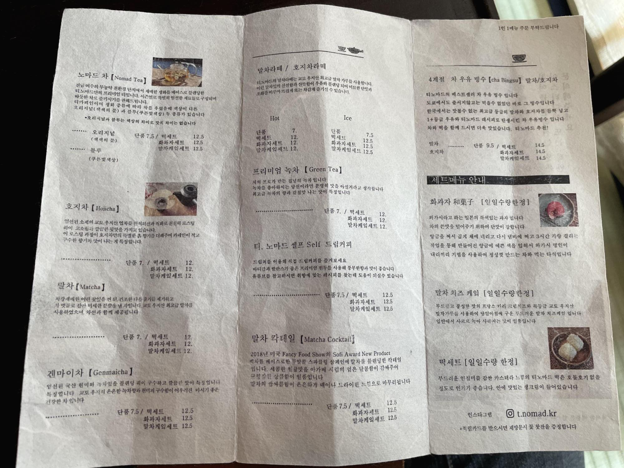 메뉴판입니다. 저희는 노마드차 화과자 세트와, 말차 화과자 세트를 주문하고, 조금 더 있다가 호지차 우유 빙수도 주문했어요. 생각보다 가격이 쎄지 않네요.