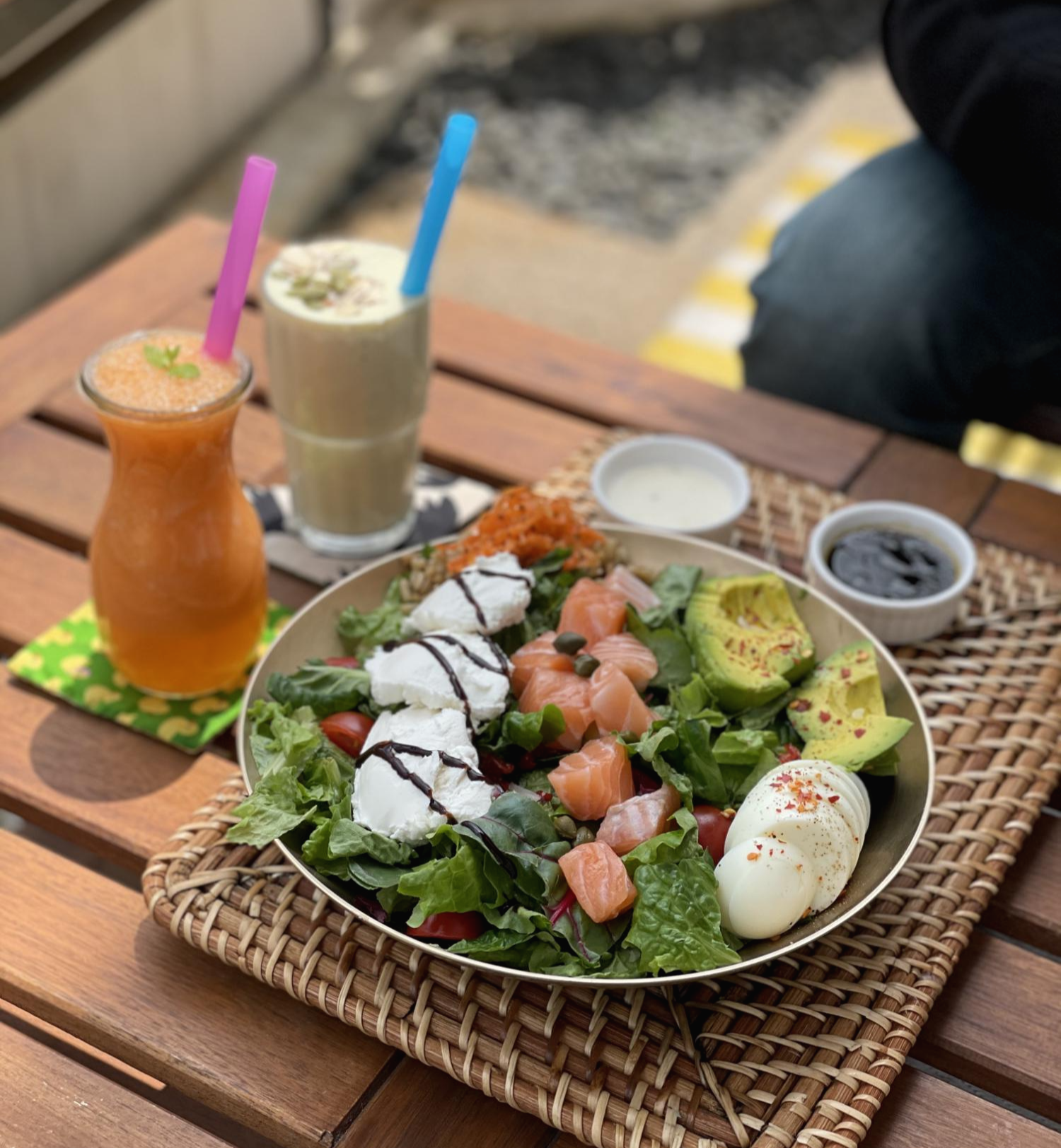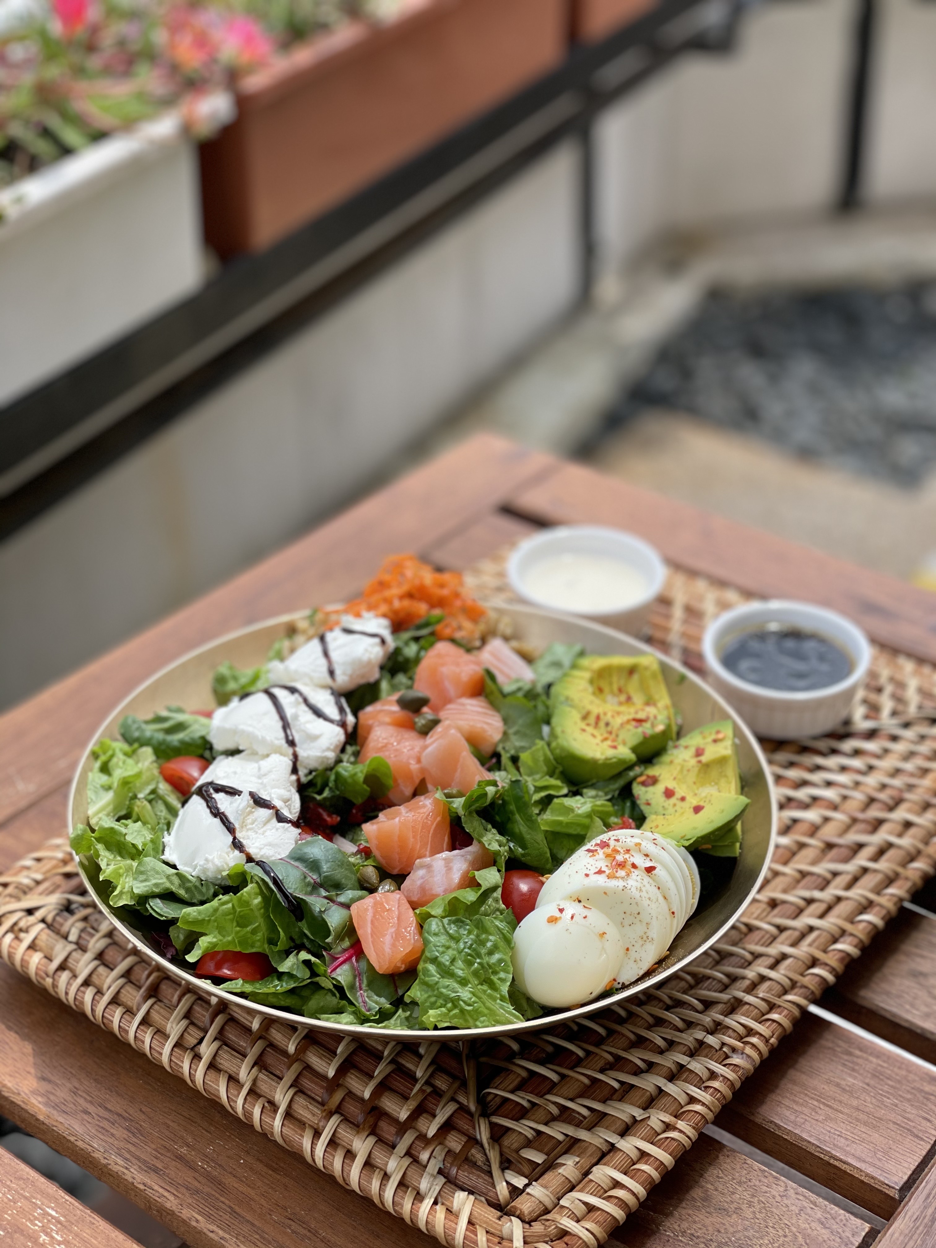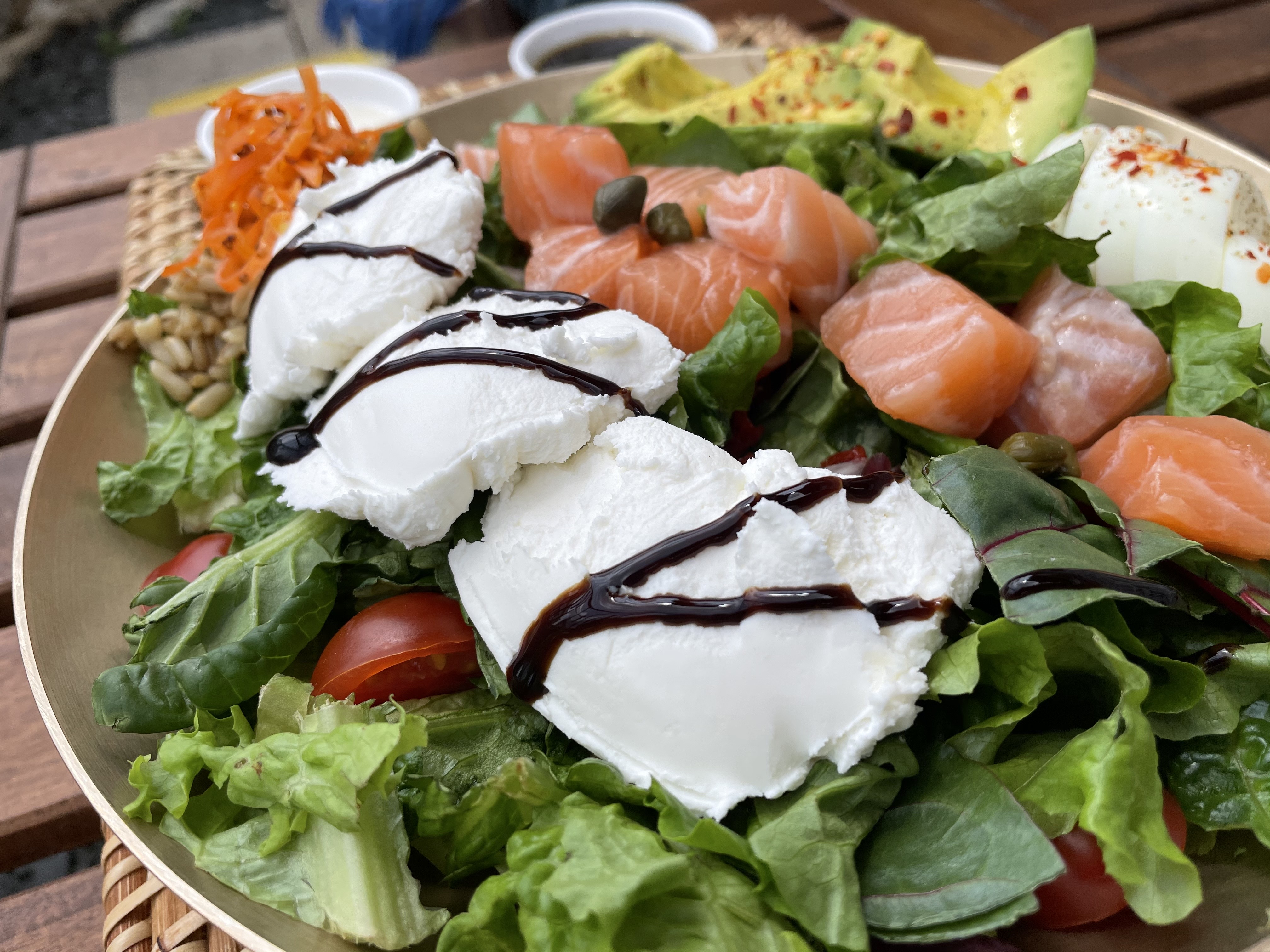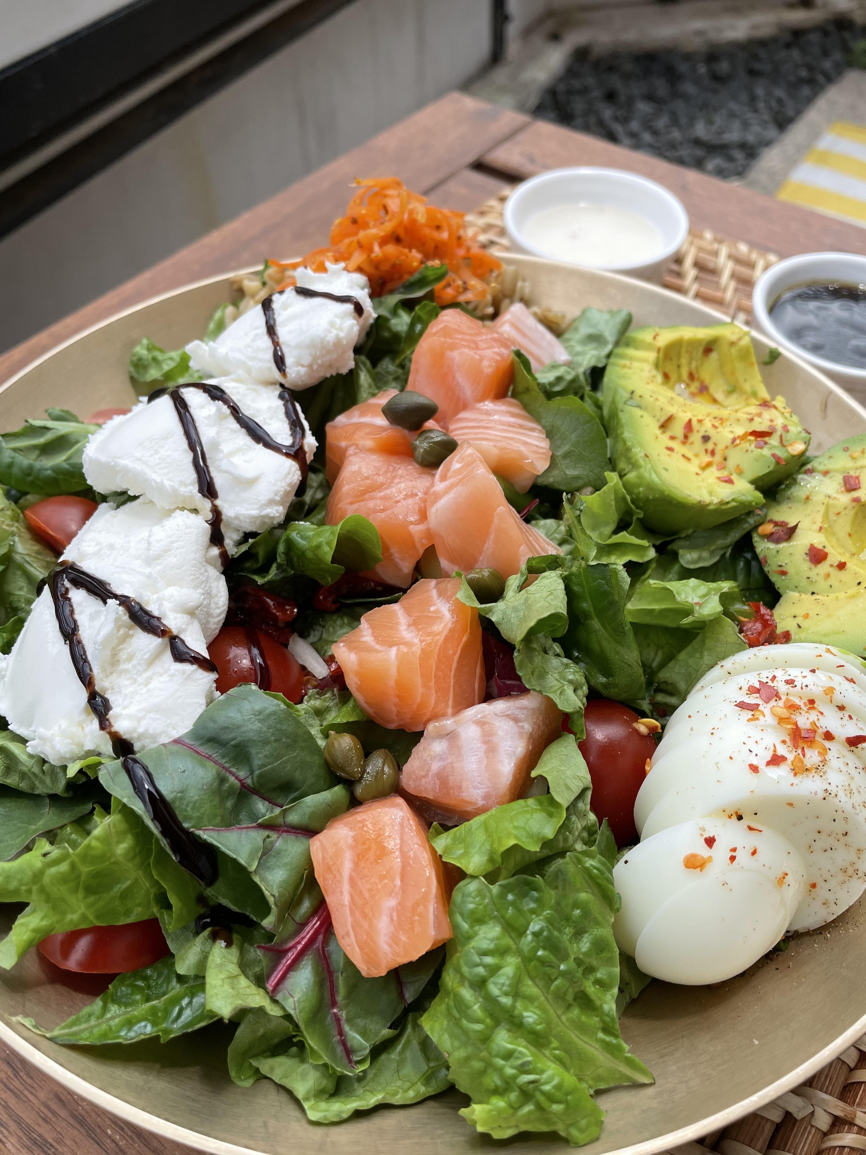 우리는 팜투샐러드에 연어와 리코타치즈, 아보카도를 추가했어요.