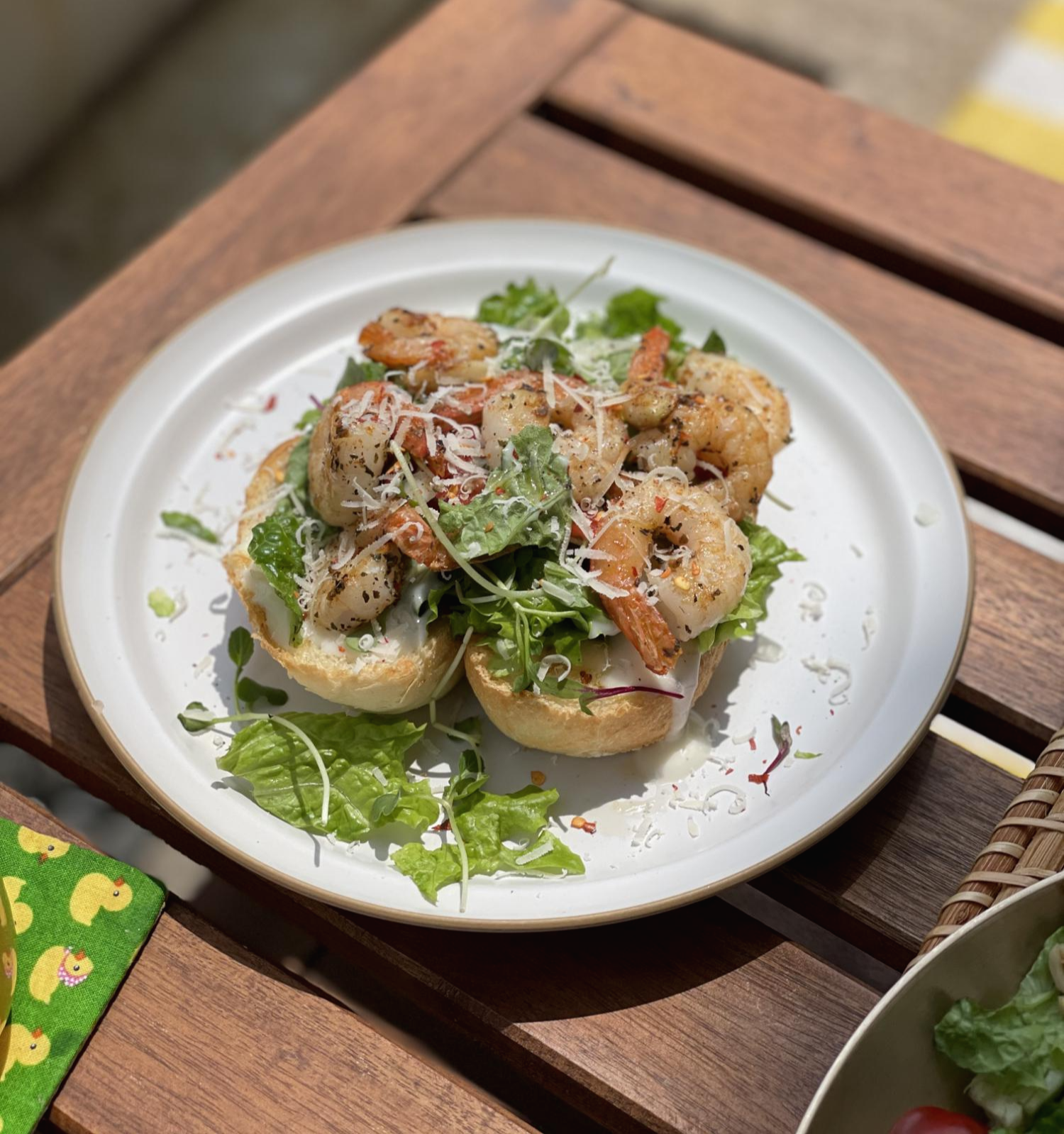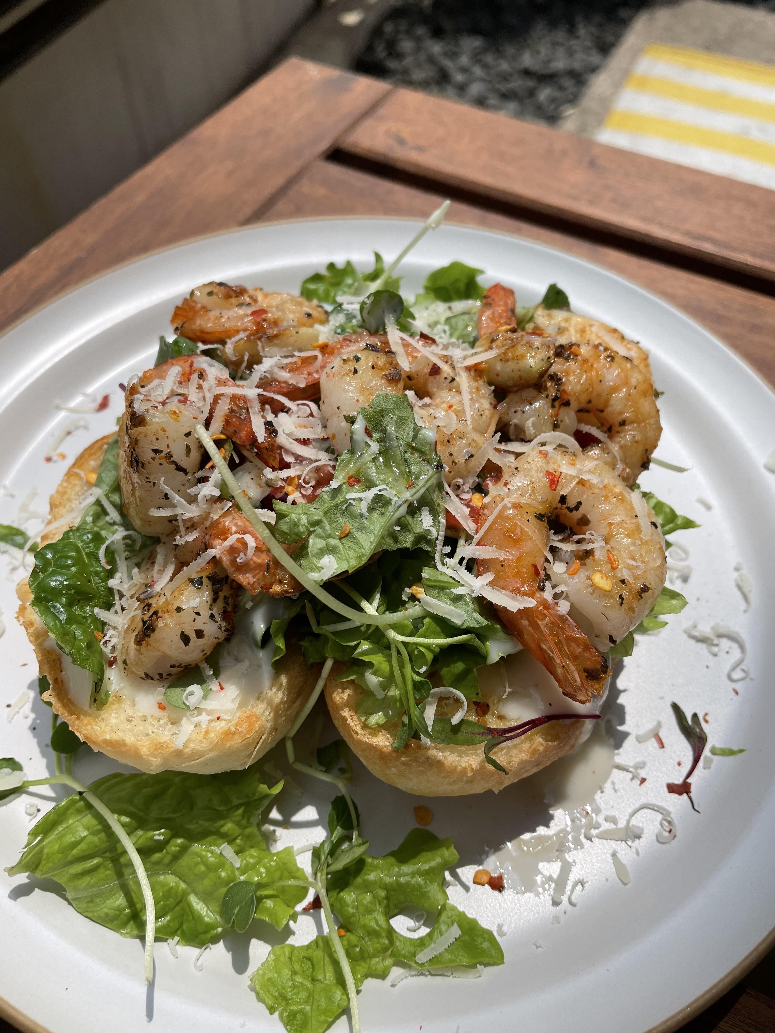 새우오픈샌드위치예요. 바게트 위에 드레싱과 야채 + 시즈닝 된 새우가 올라간 샌드위치였어요.