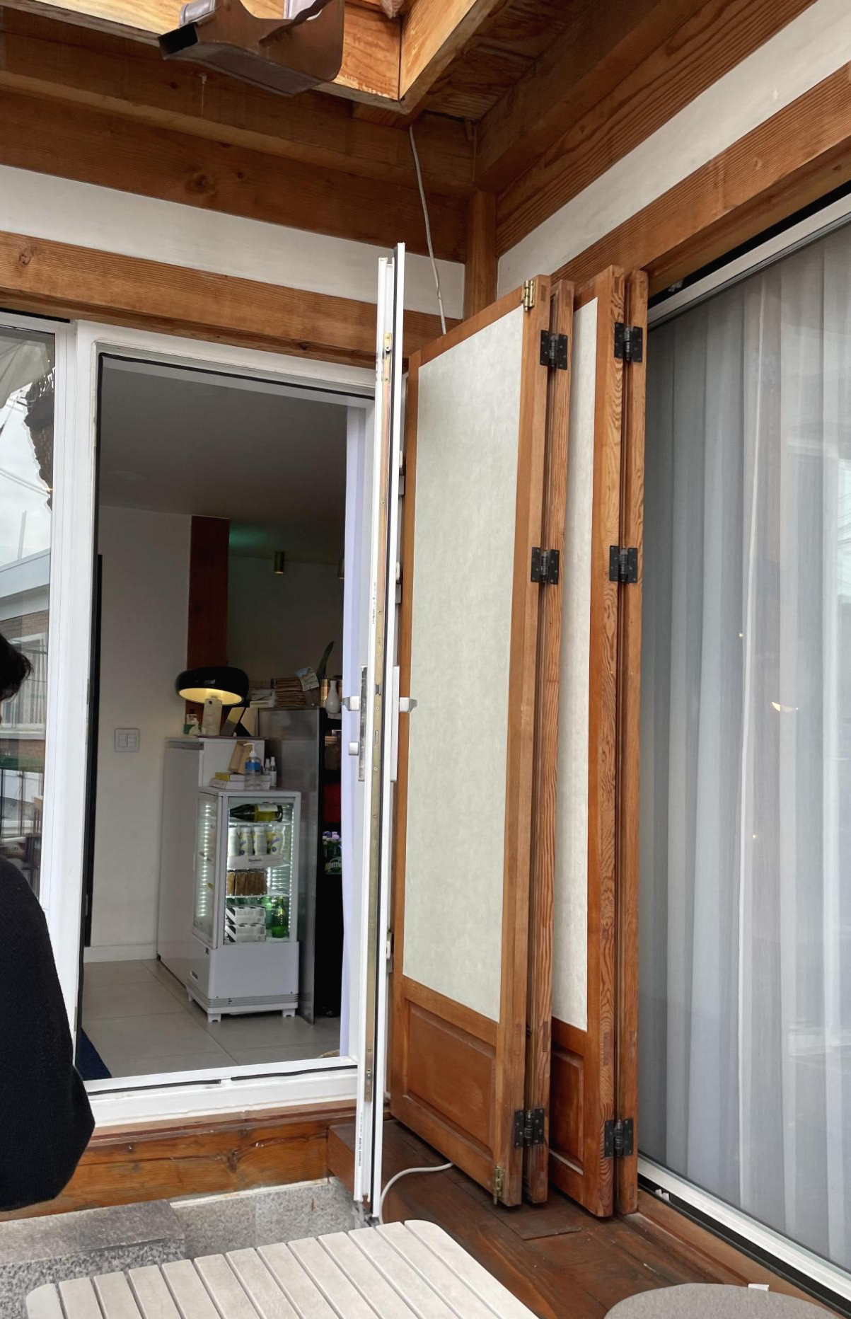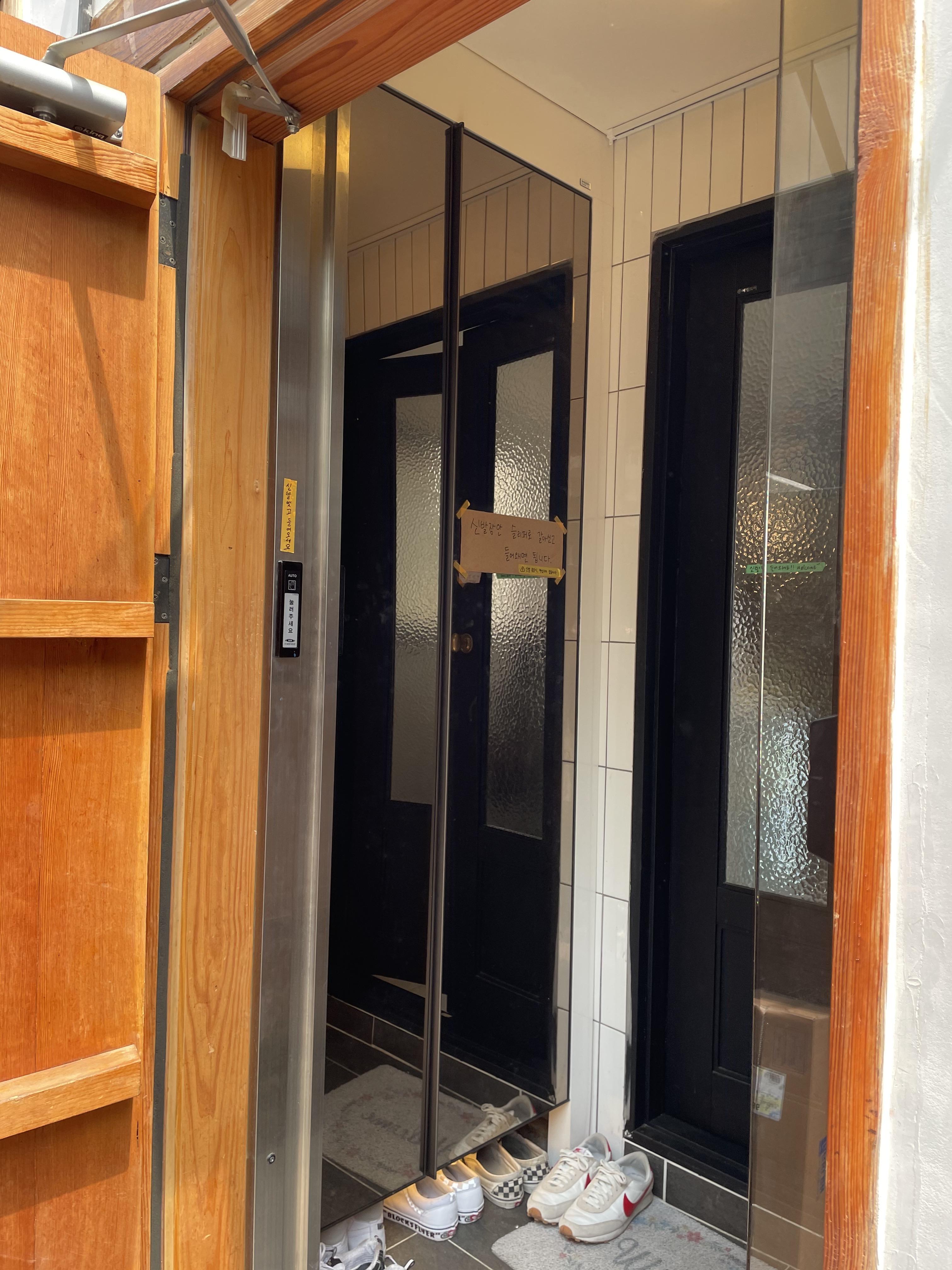 한옥이라 그런가, 입구 신발장에서 슬리퍼로 갈아 신고 들어가셔야 해요.