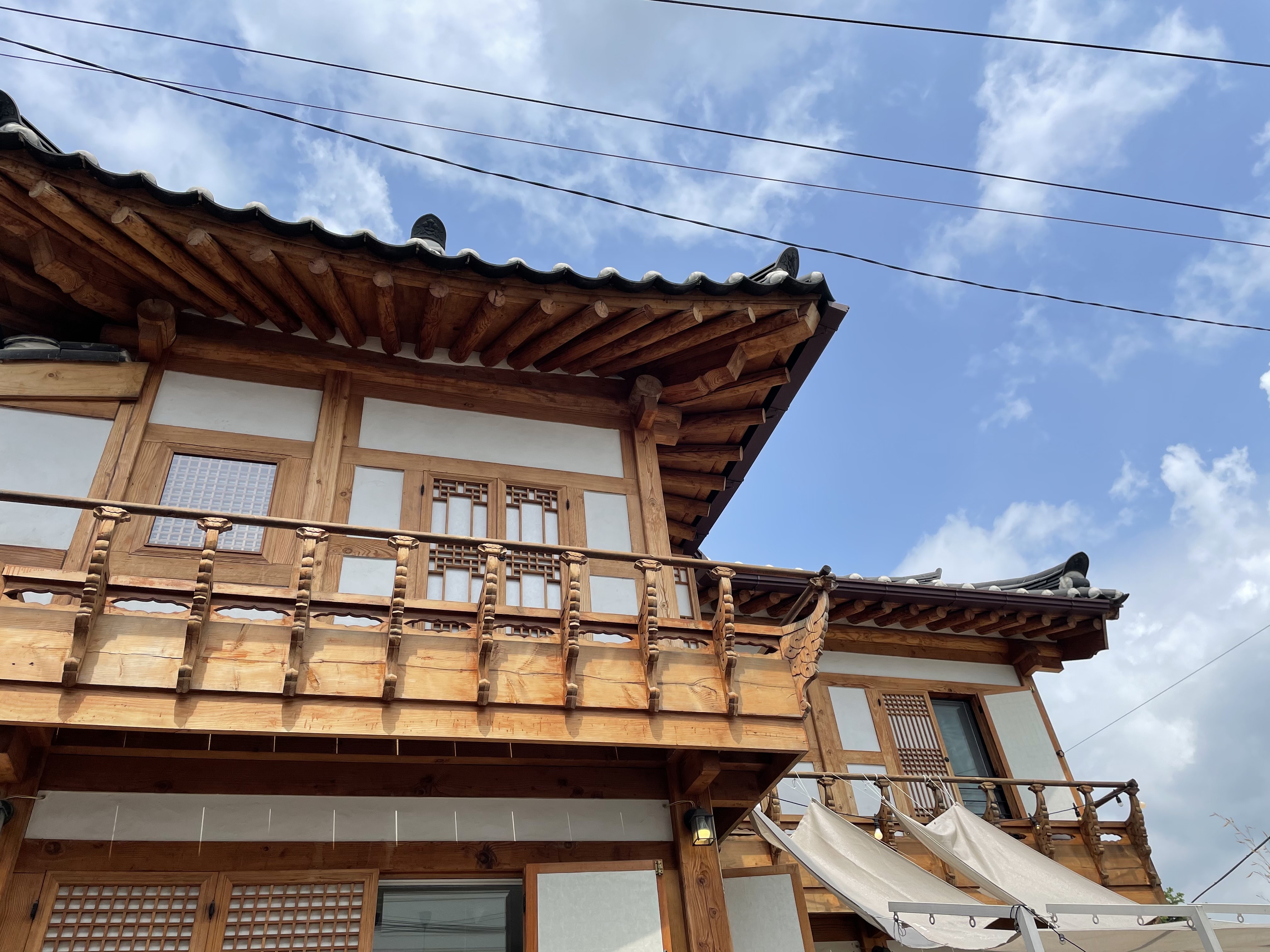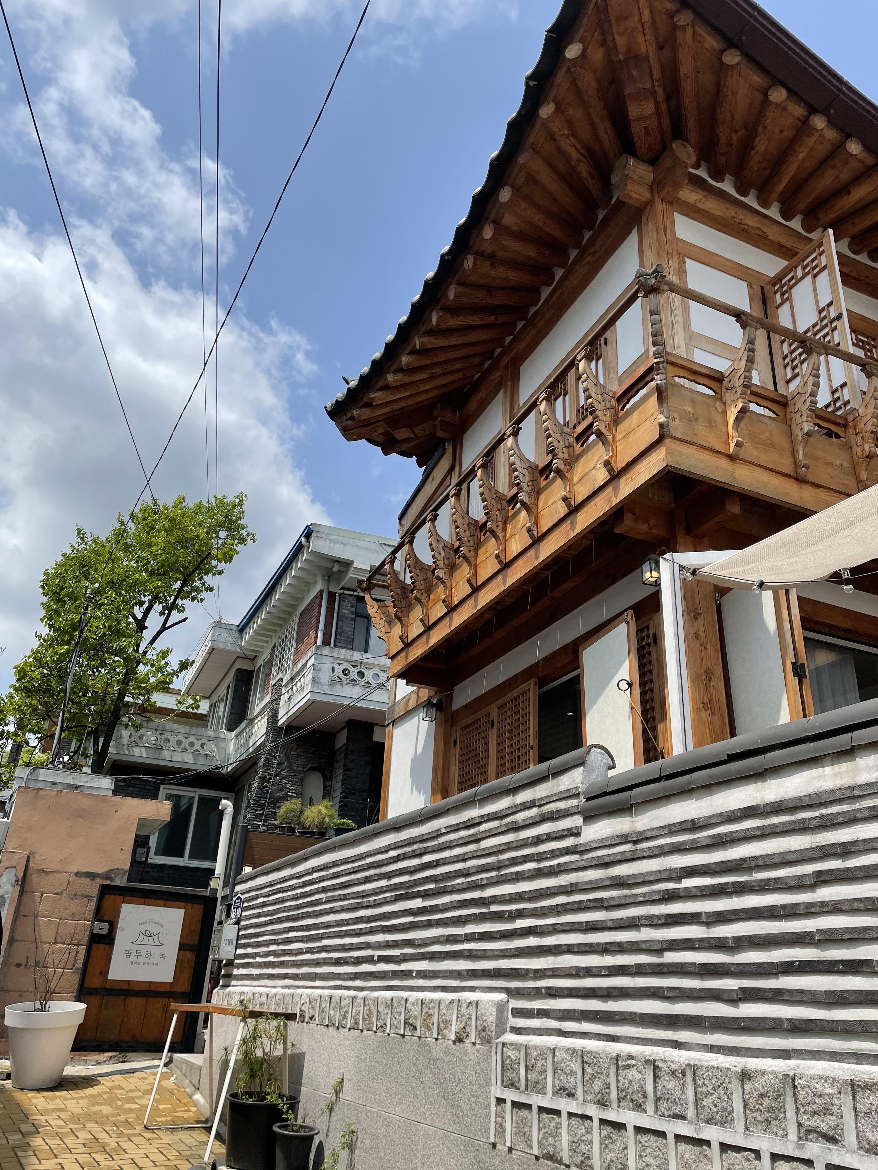 좋은 날이라, 파란 하늘과 한옥이 참 잘 어울린다는 생각이 들었어요.