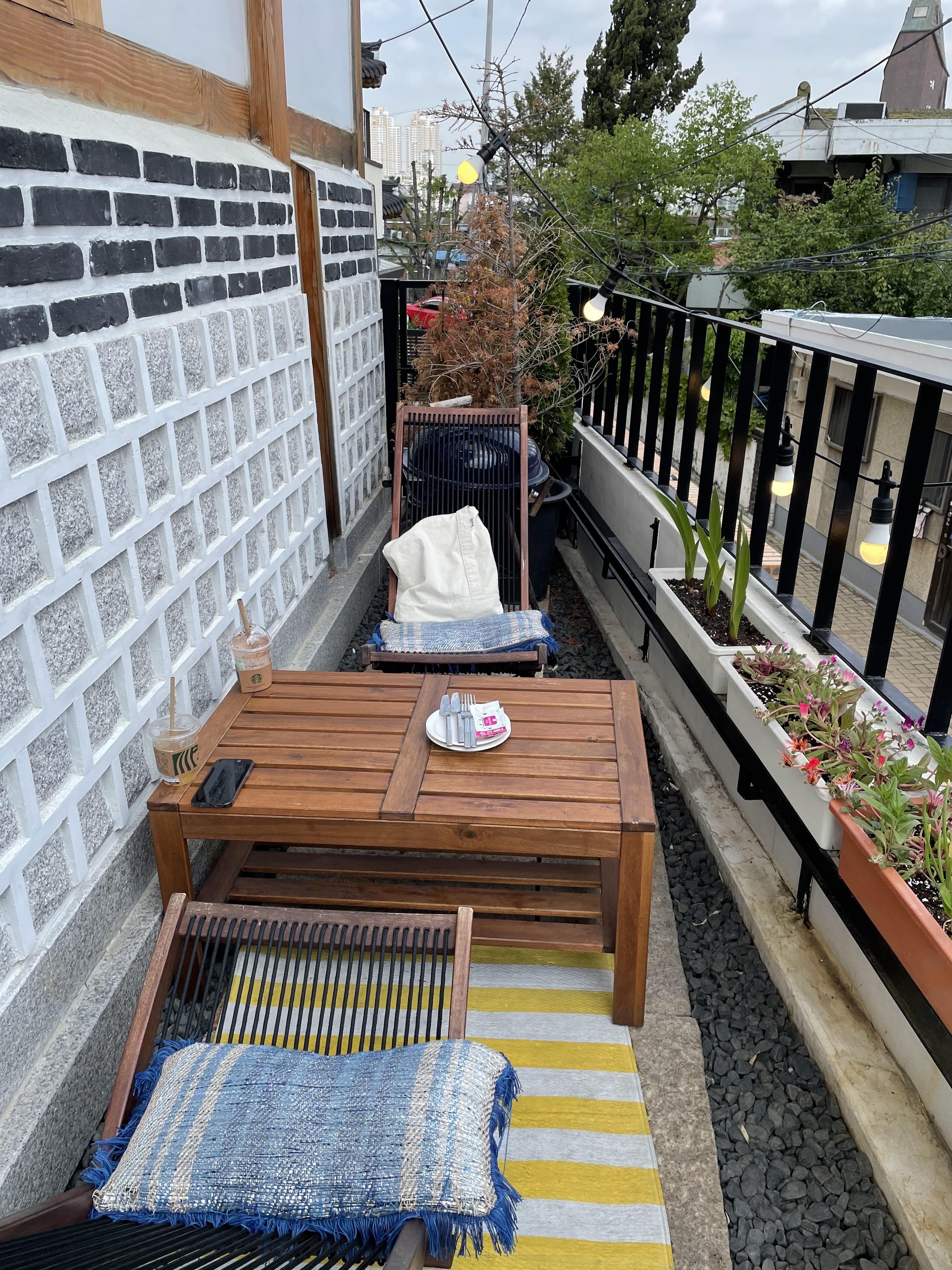 이렇게 발코니 쪽으로 나갈 수 있는 자리들도 있어요. 날이 좋으니깐 나가서 먹기로 했어요.