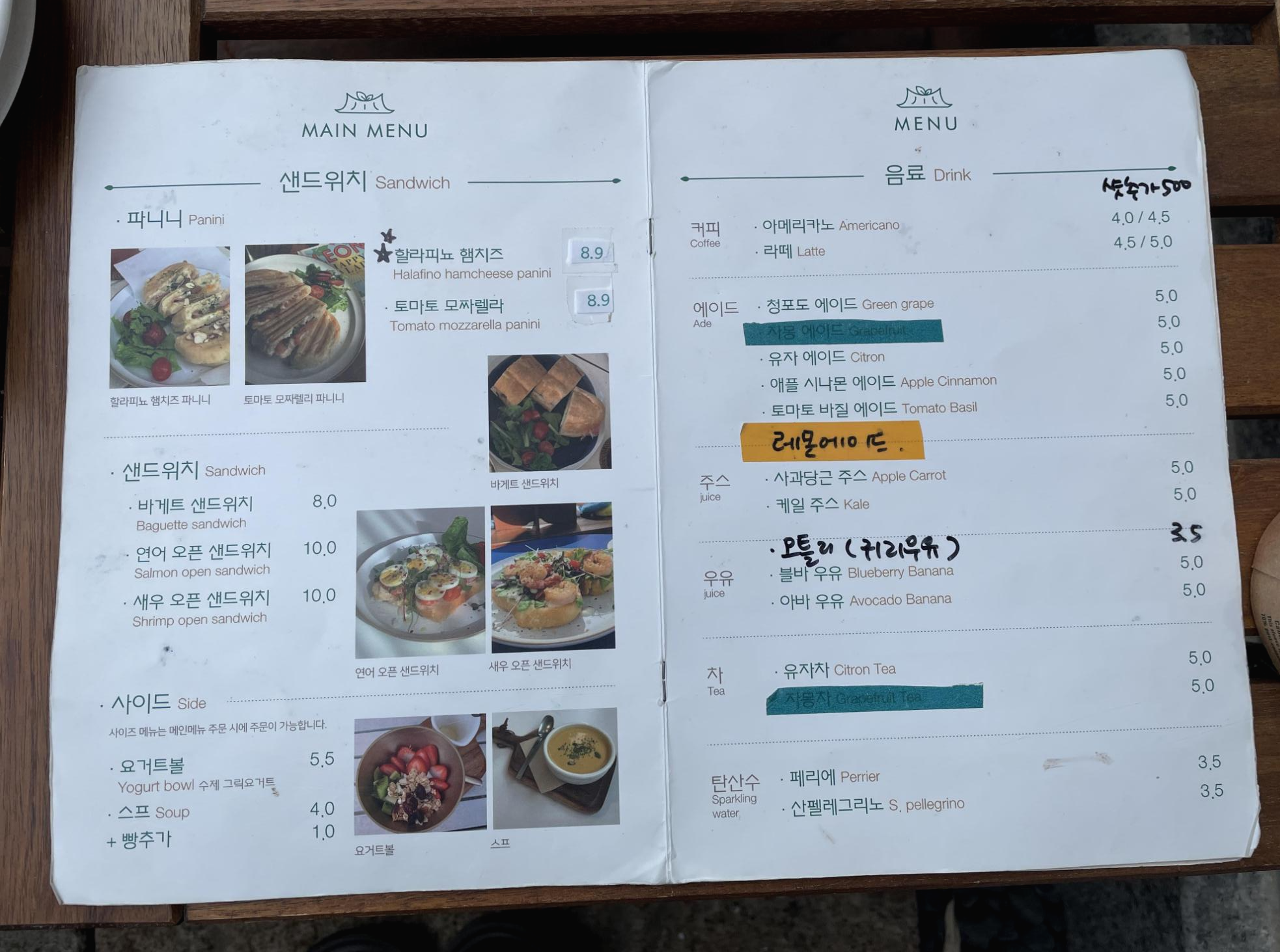 여기에 새우오픈샌드위치와 사과당근주스, 아바우유를 주문했어요.