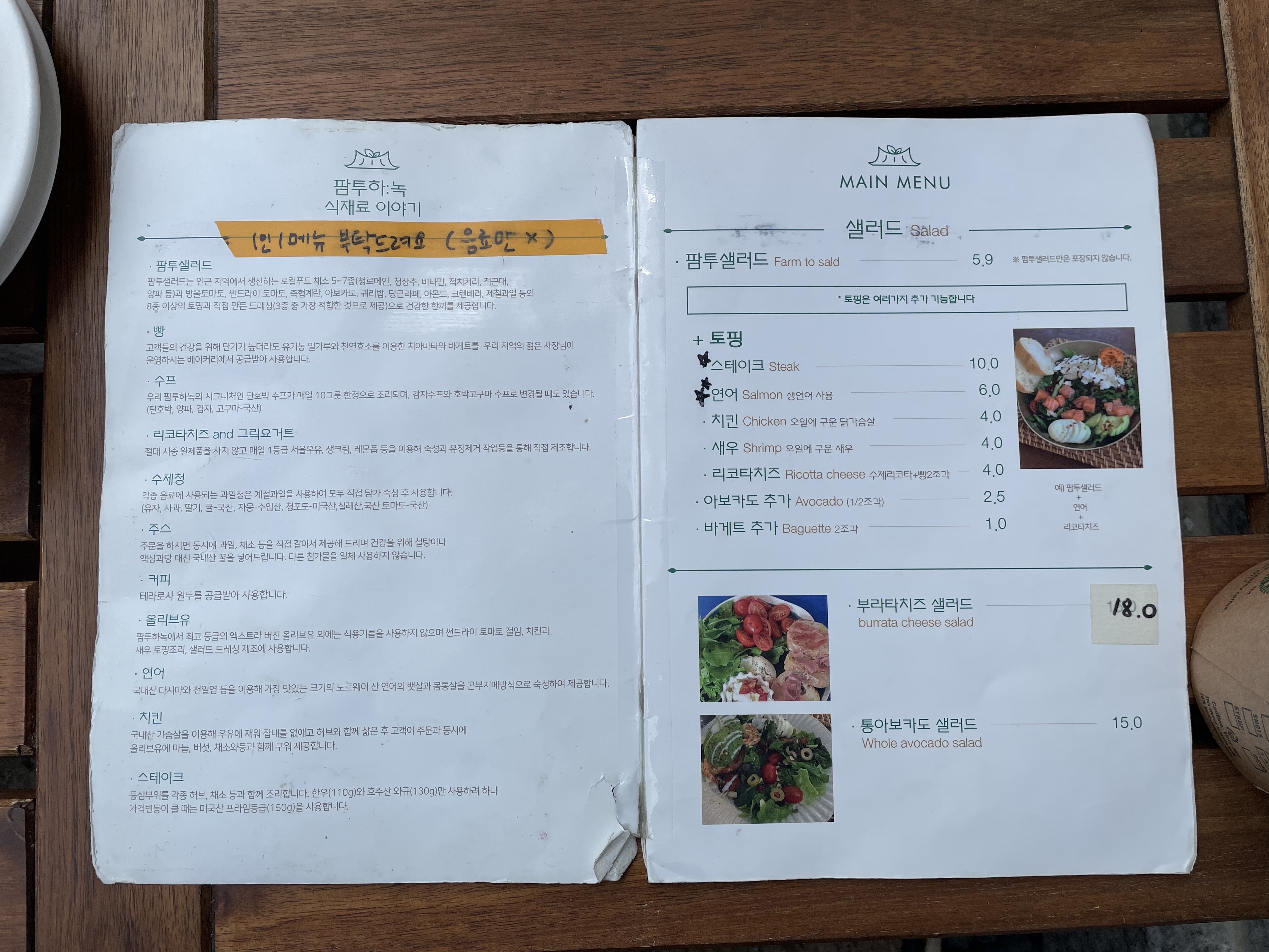 팜투샐러드는 인근 지역에서 생산하는 로컬푸드 채소 5-7종과 방울토마토, 썬드라이 토마토, 축협 계란, 아보카도, 귀리밥, 당근라페, 아몬드, 크랜베리, 제철과일 등의 8종 이상의 토핑과 직접 만든 드레싱이 나온다고 메뉴판에 설명이 나와 있었어요.