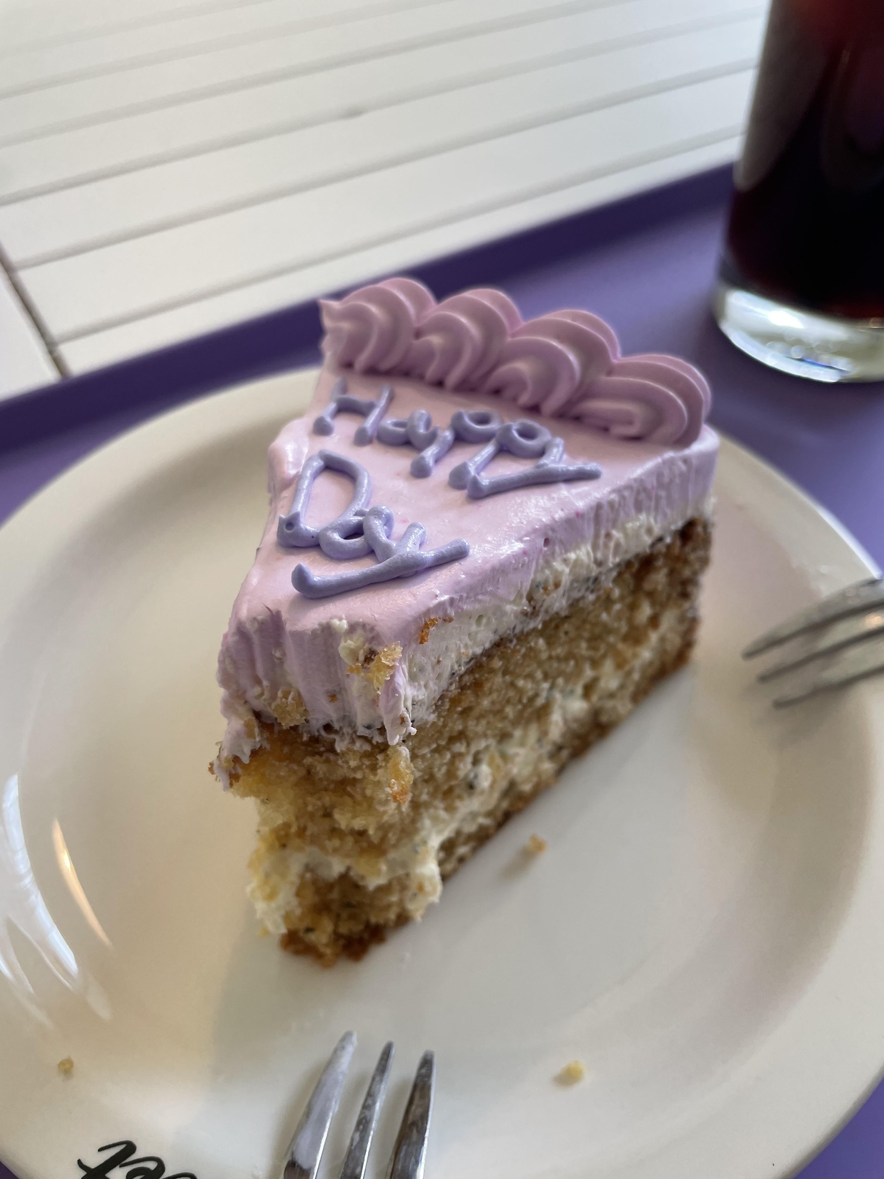 보라색 카페에 온 이상, 보라색 케이크를 먹어야겠다는 생각이 들어 이 사랑스러운 컬러의 케익을 골랐습니다. 음료는 아이스 아메리카노와 트로피칼 크림슨이라는 허브티를 시켰던 것 같아요.