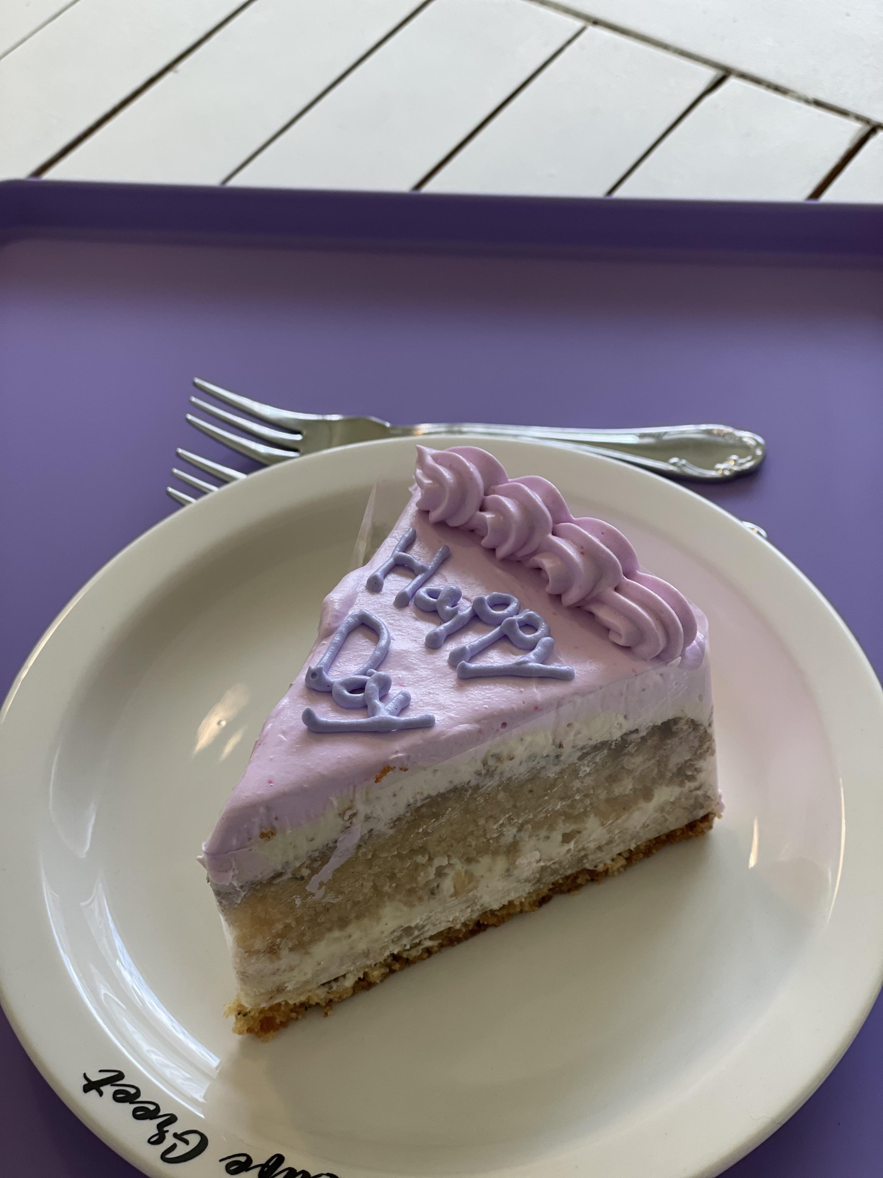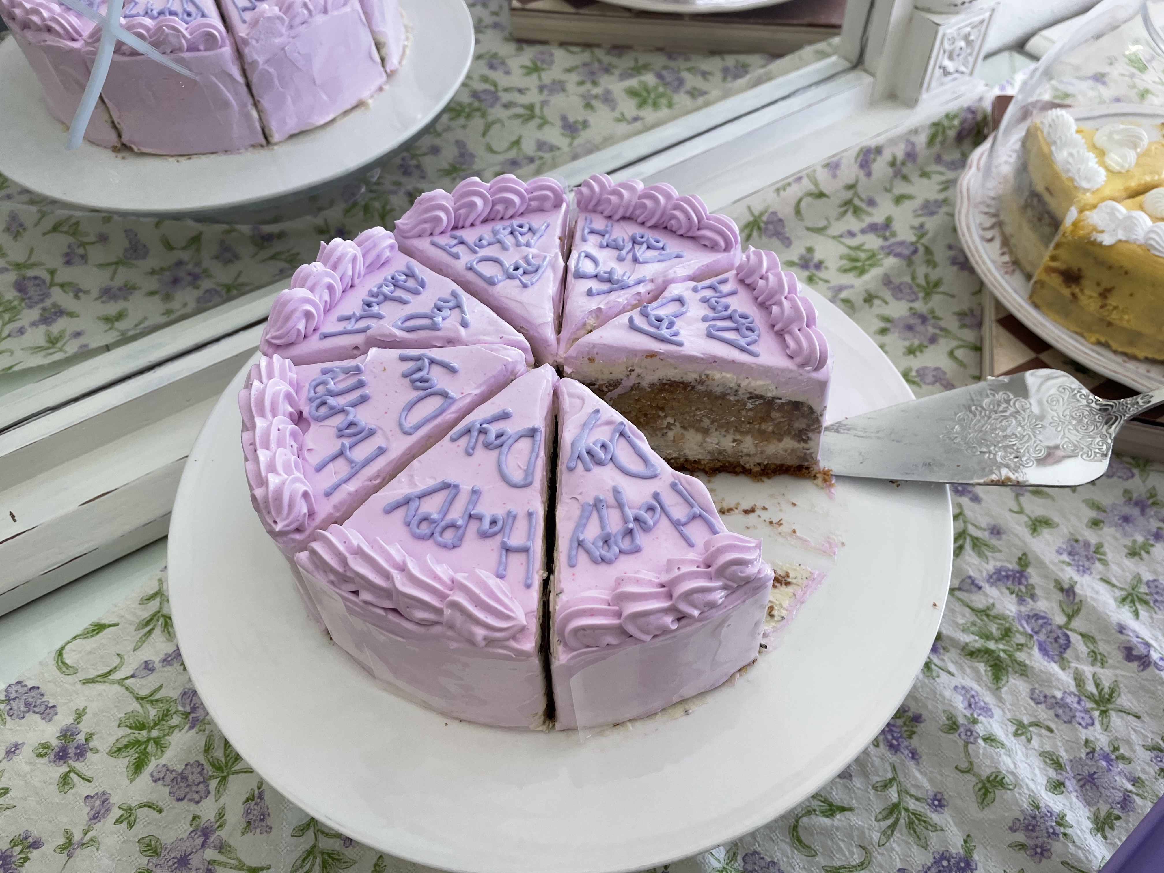 케이크는 이렇게 직접 떠야 하니 조심하셔야 할 것 같아요! 쟁반도 보라색이에요!