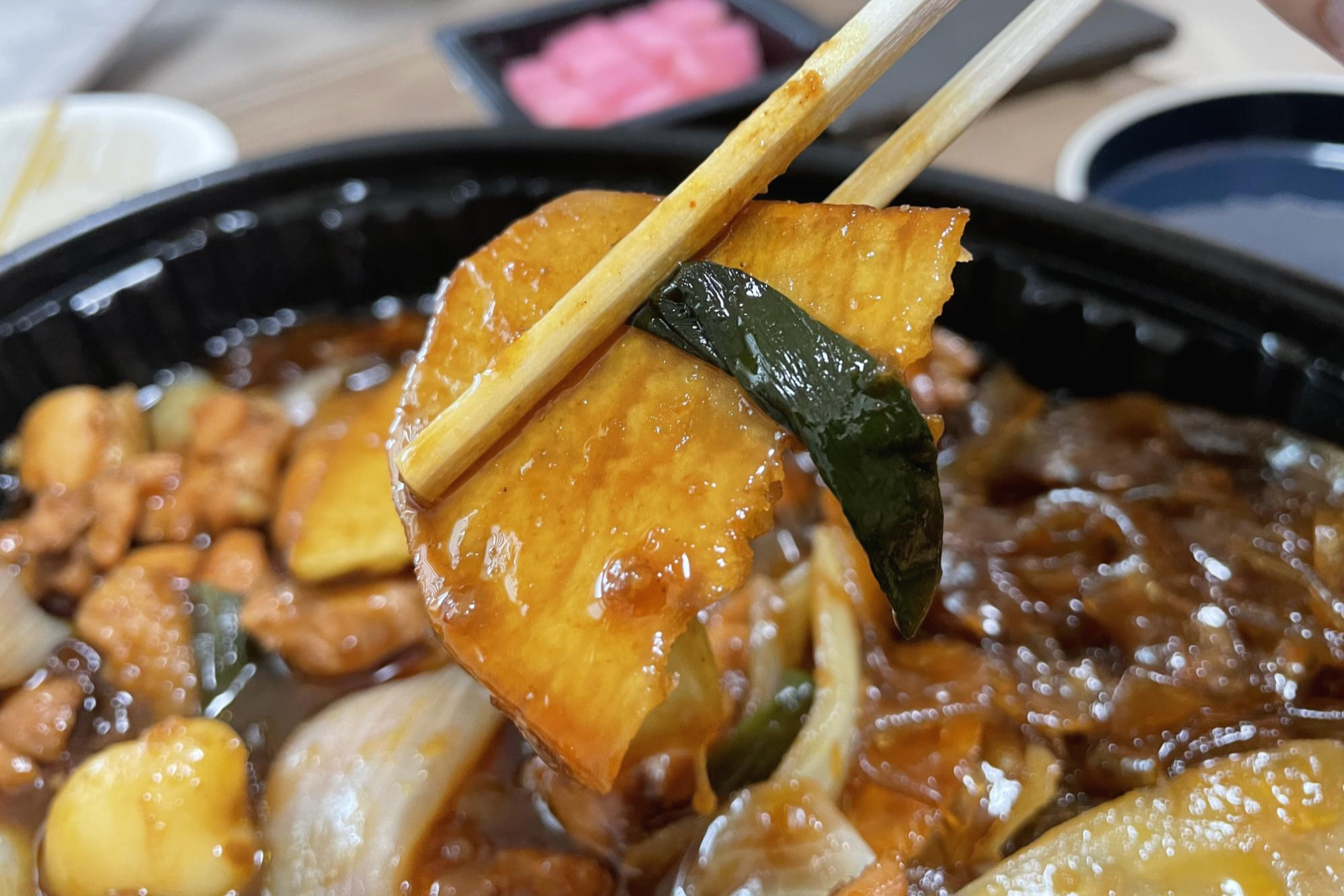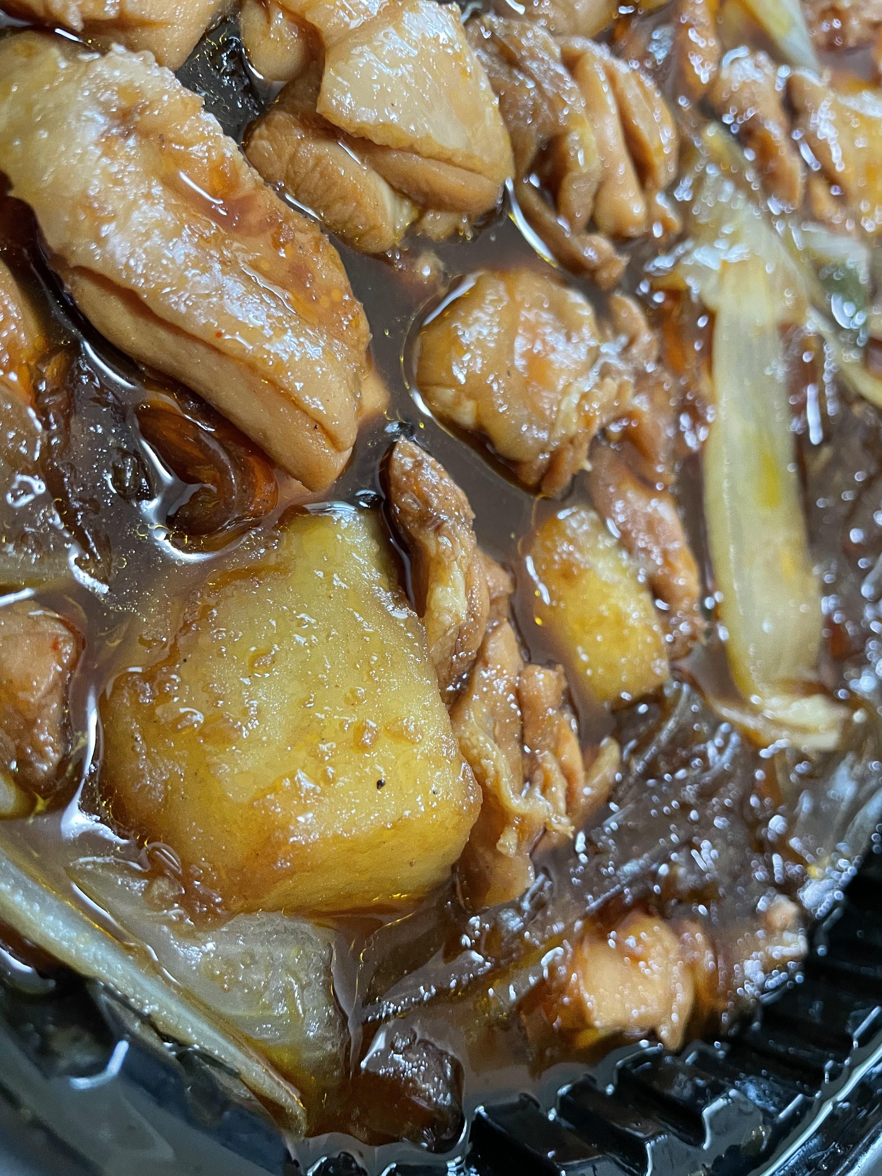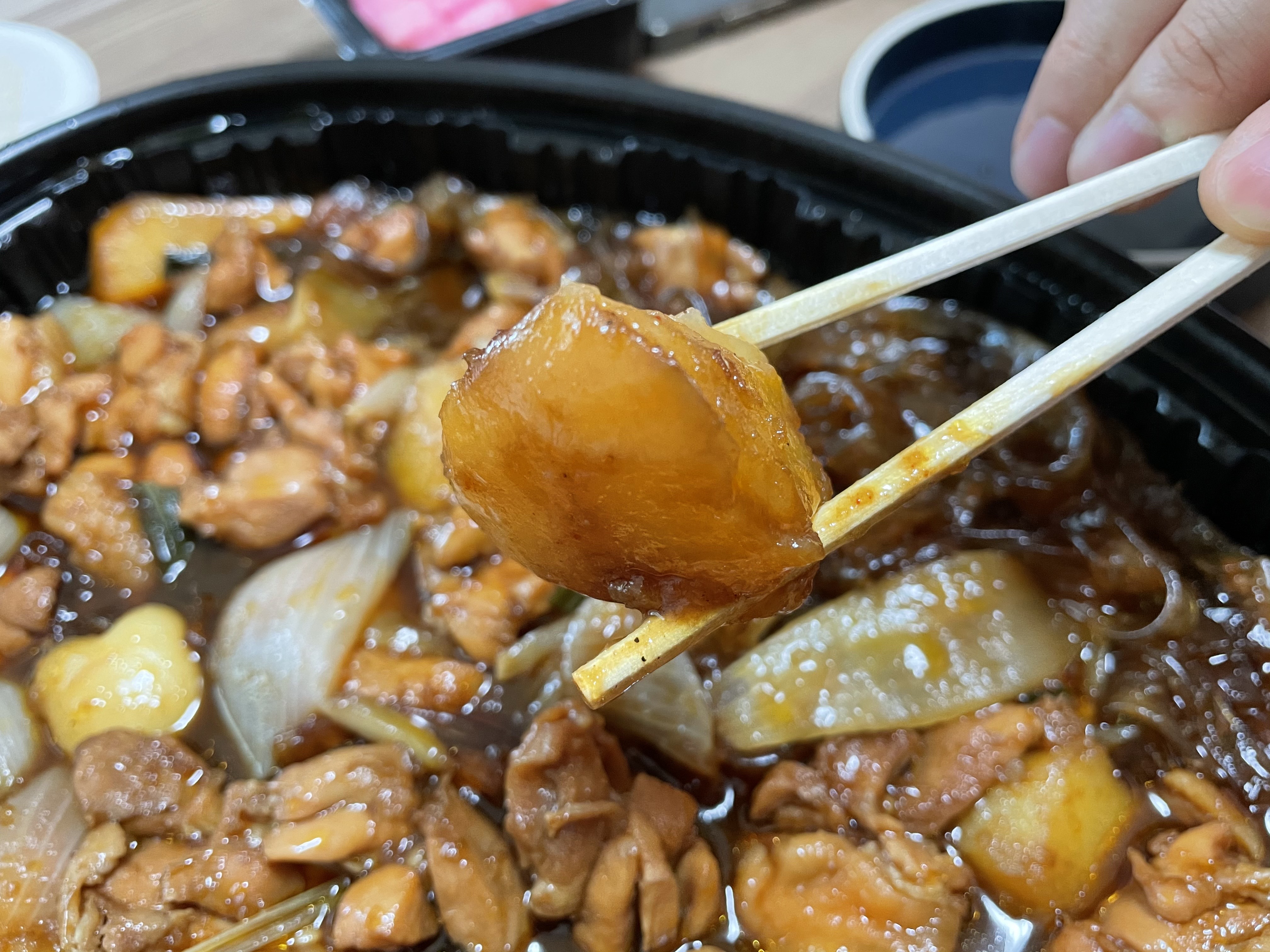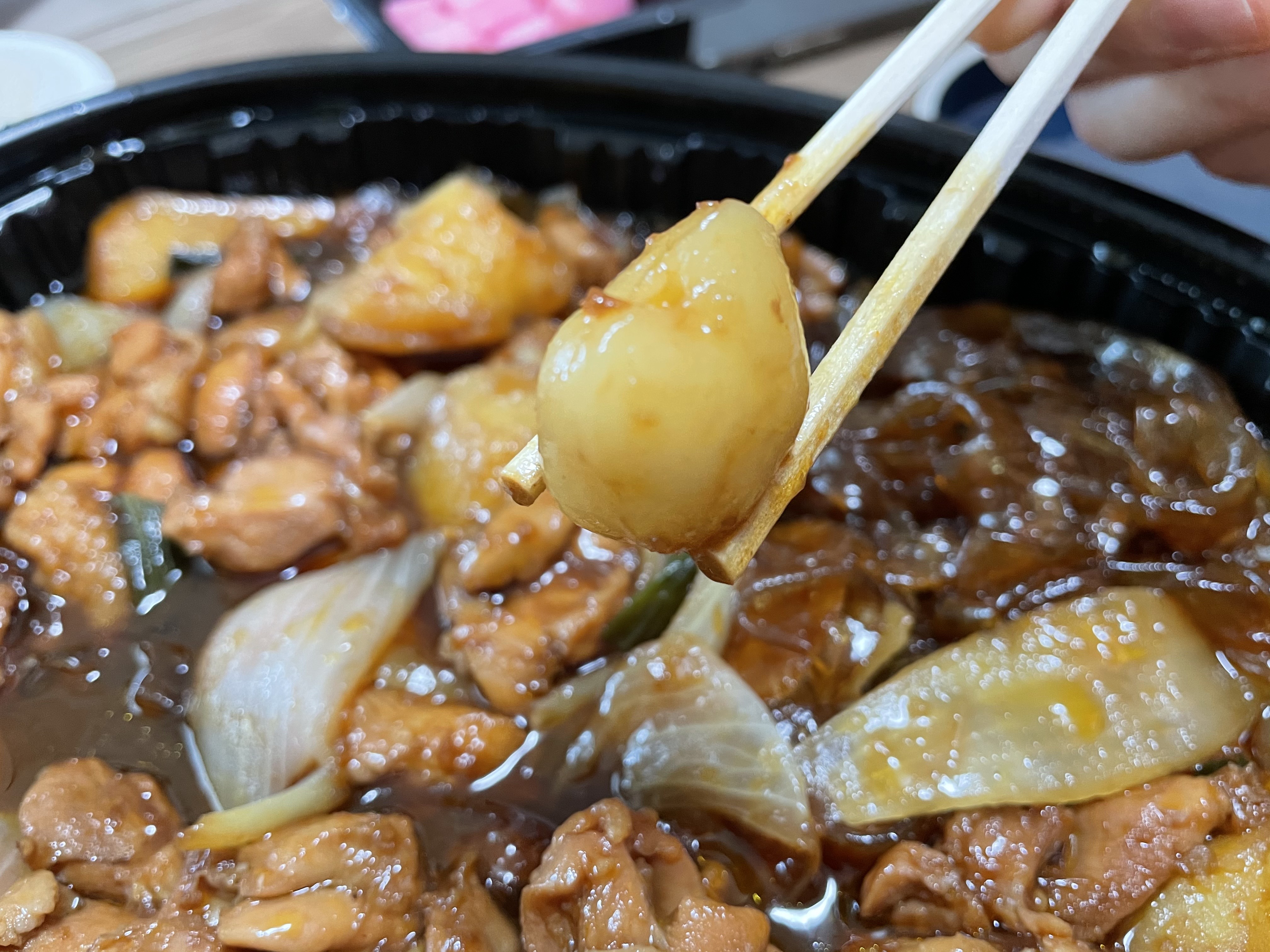 감자와 떡이에요. 저는 찜닭에 들어가는 감자도 무척 좋은데, 감자가 충분히 들어가 있어서 좋았어요. 물론 한 개 정도는 약간 덜 익어서 사각한 식감이 느껴져서 아쉬웠어요. 떡은 하트 모양이더라고요.