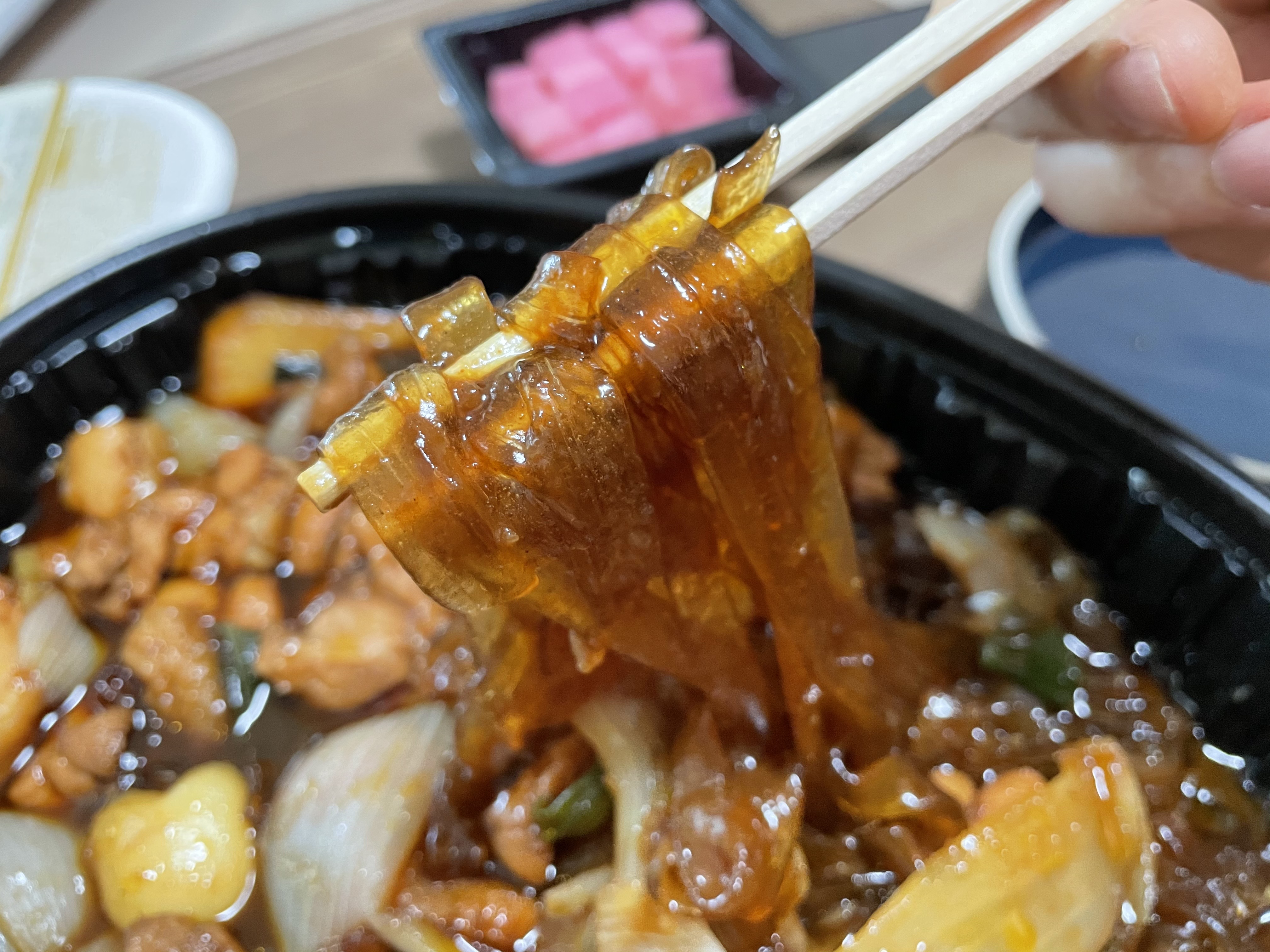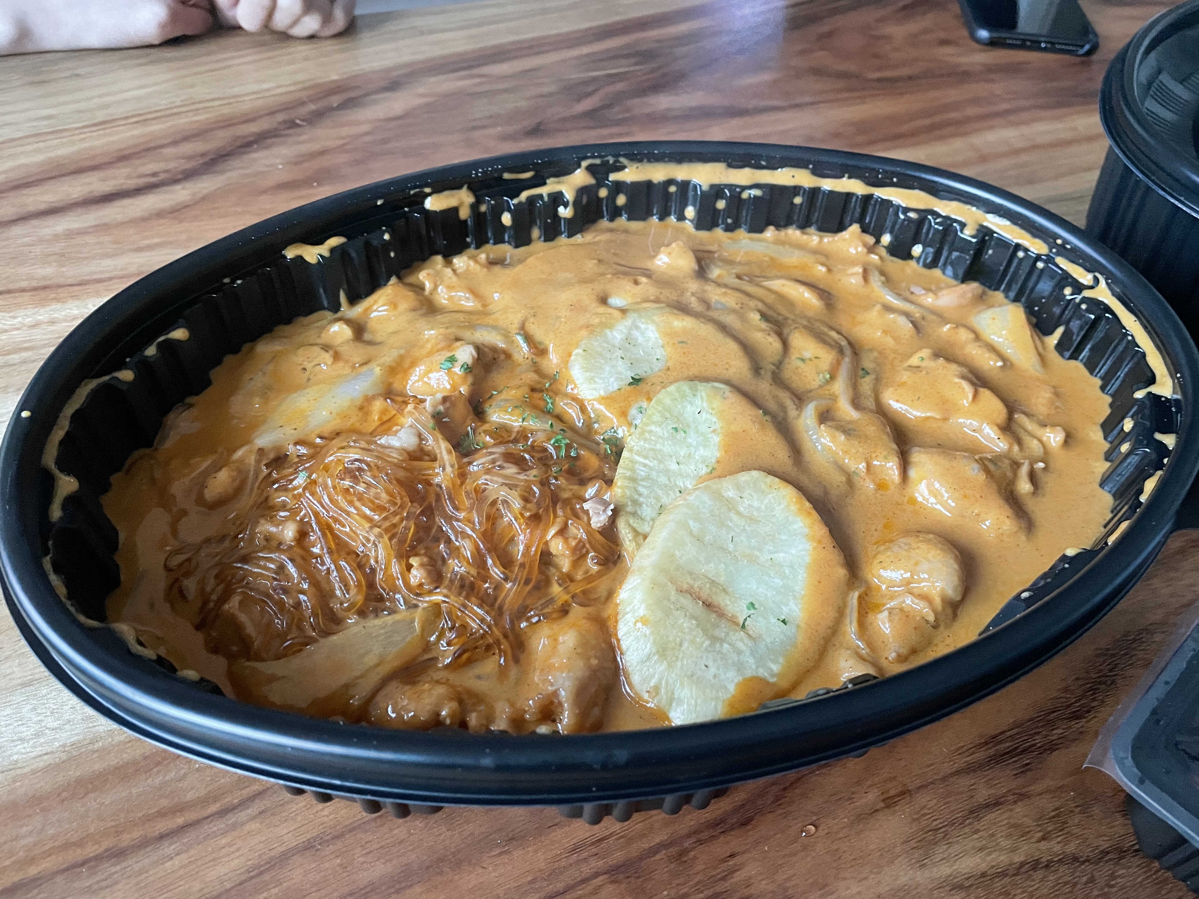 로제찜닭이에요. 맛은 많이는 못 먹겠다고 생각했어요. 약간 로제가 크림이 들어간 소스인 데다가, 약간 달달하잖아요? 그래서 살짝 질리는 느낌이 있었어요. 맵기를 3단계 이상으로 올려야 느끼하지 않게 먹을 수 있을 것 같아요.