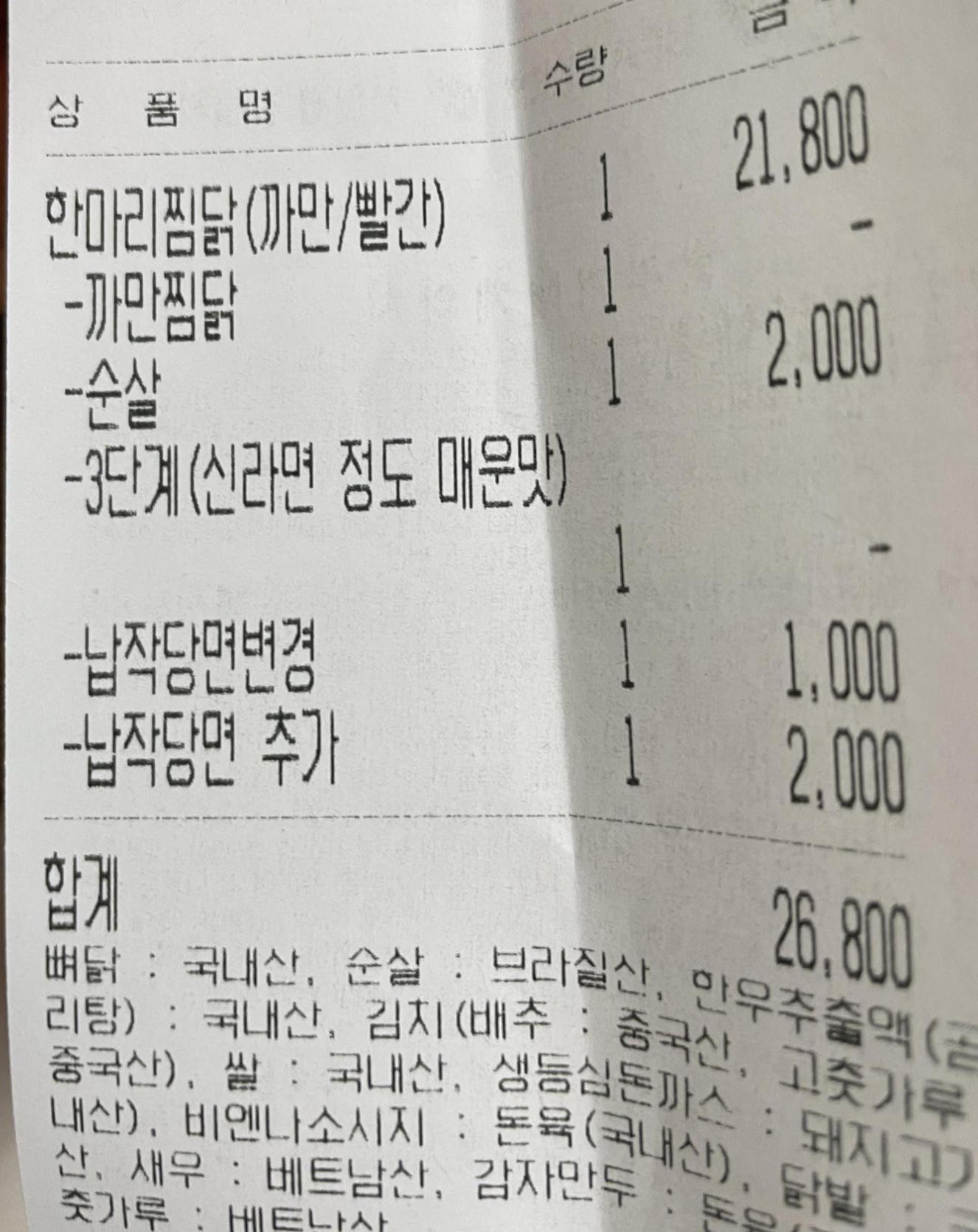 일단 2명이 먹을 거라 한 마리 찜닭에 간장소스인 까만찜닭을 순살로 선택하고, 맵기는 3단계로 했어요. 여기에 일반 당면을 납작당면으로 변경하고, 추가까지 했네요.