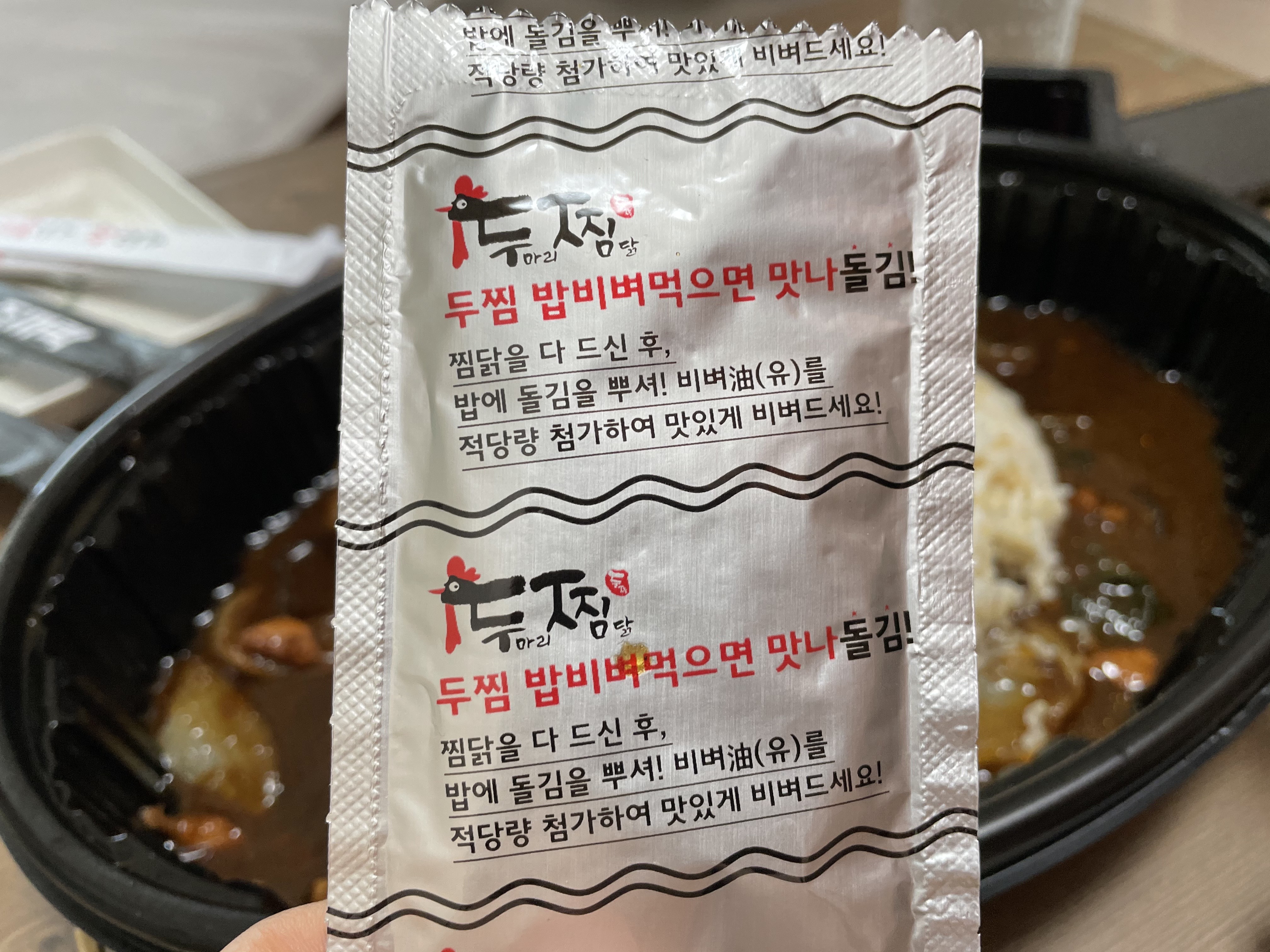 찜닭무와, 밥 비벼 먹을 때 넣는 김과 참기름이 같이 와요.