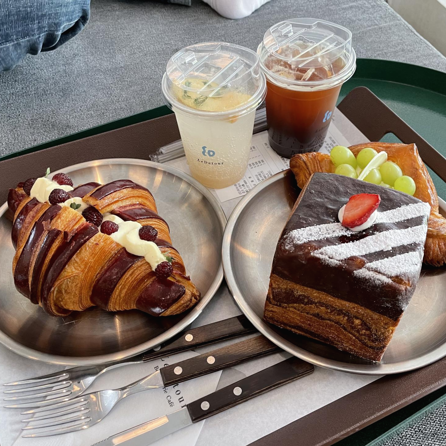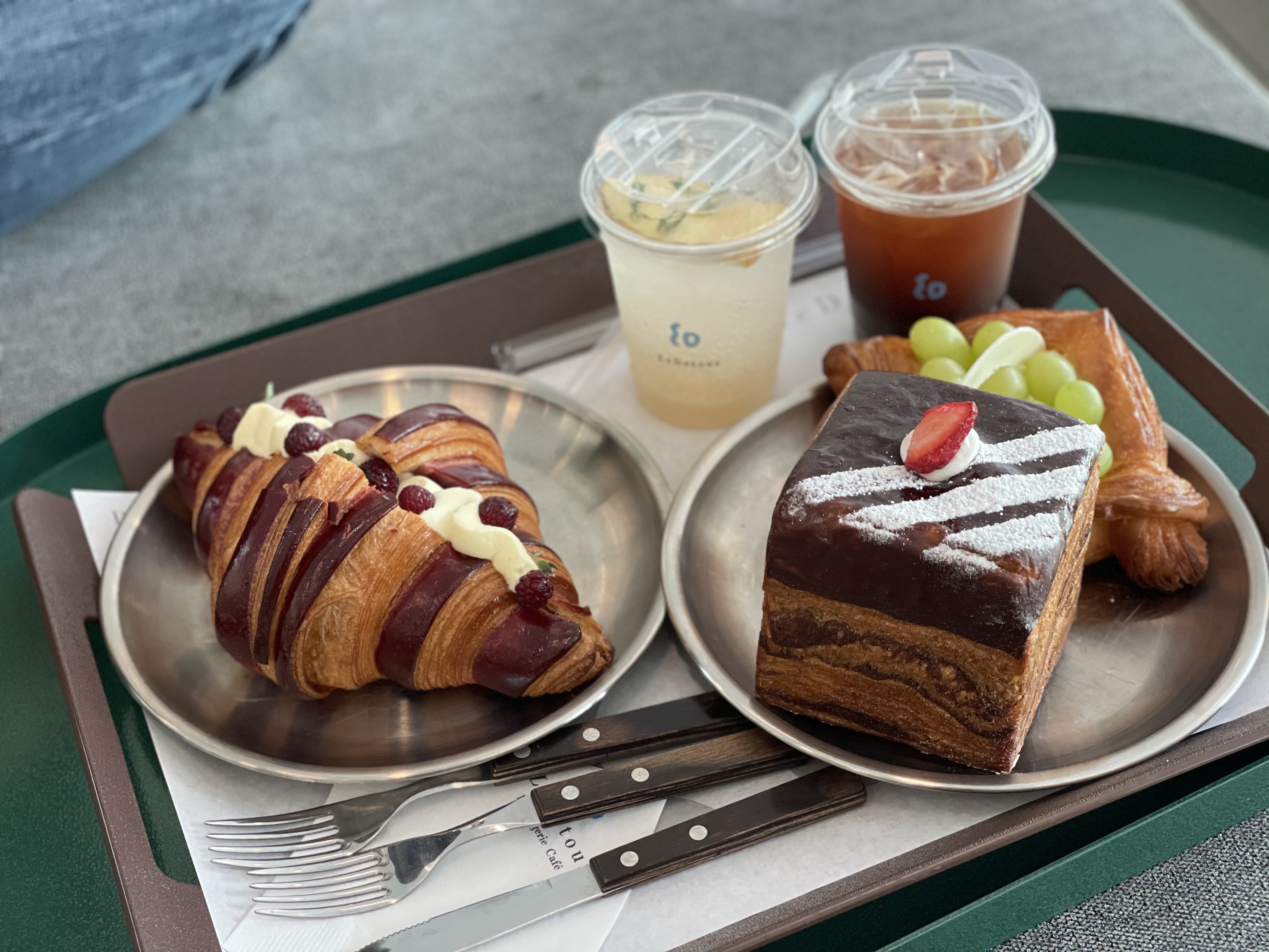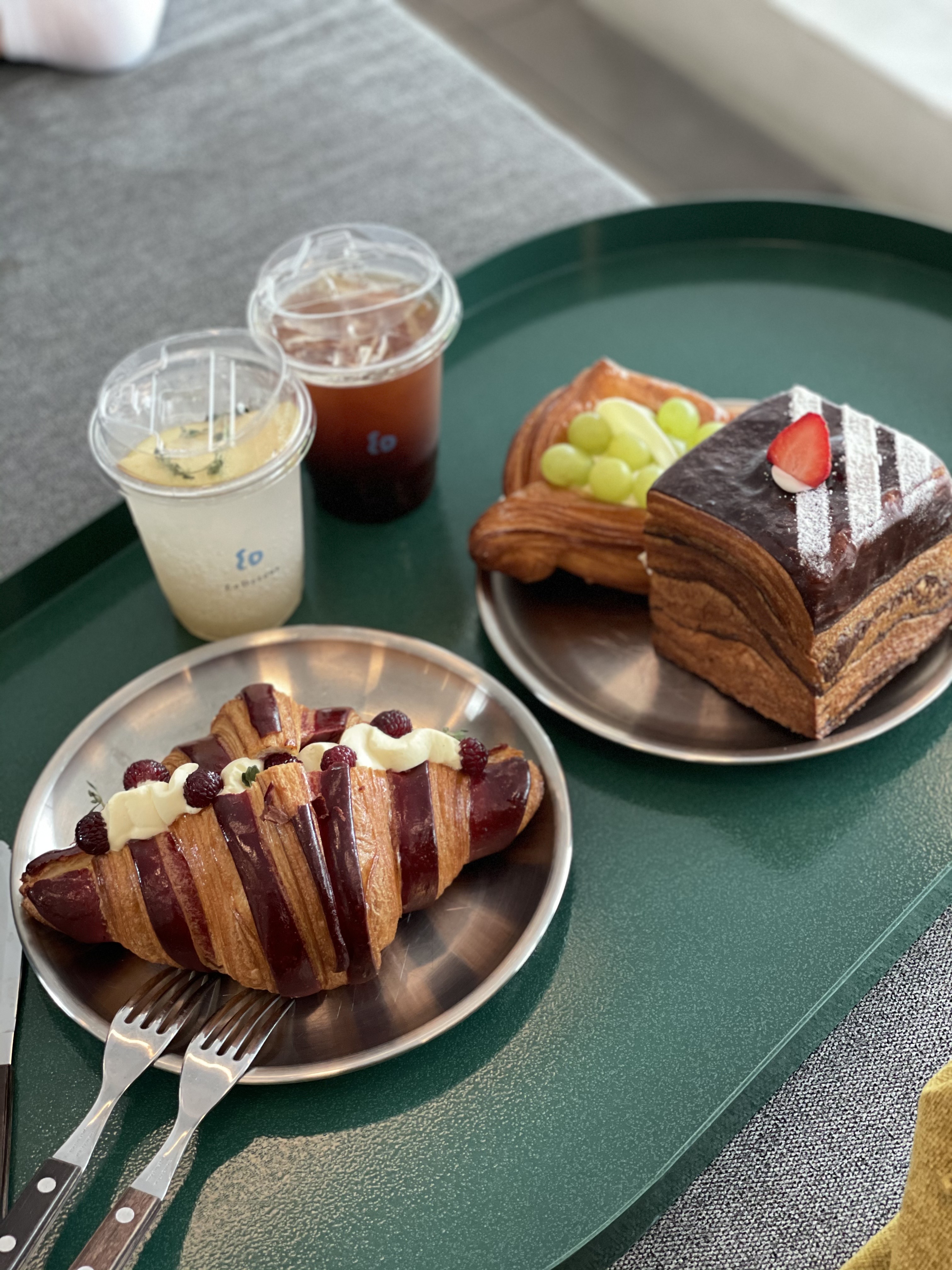 뺑 오 쇼콜라, 뺑 스위스, 뺑 오 투스틱, 페이스트리 도넛 등 다양한 빵이 많아서 좋았어요. 우리는 밥을 먹고 왔기 때문에, 산딸기 크루아상과 청포도데니쉬 페이스트리, 사워큐브페이스트리를 픽했어요.