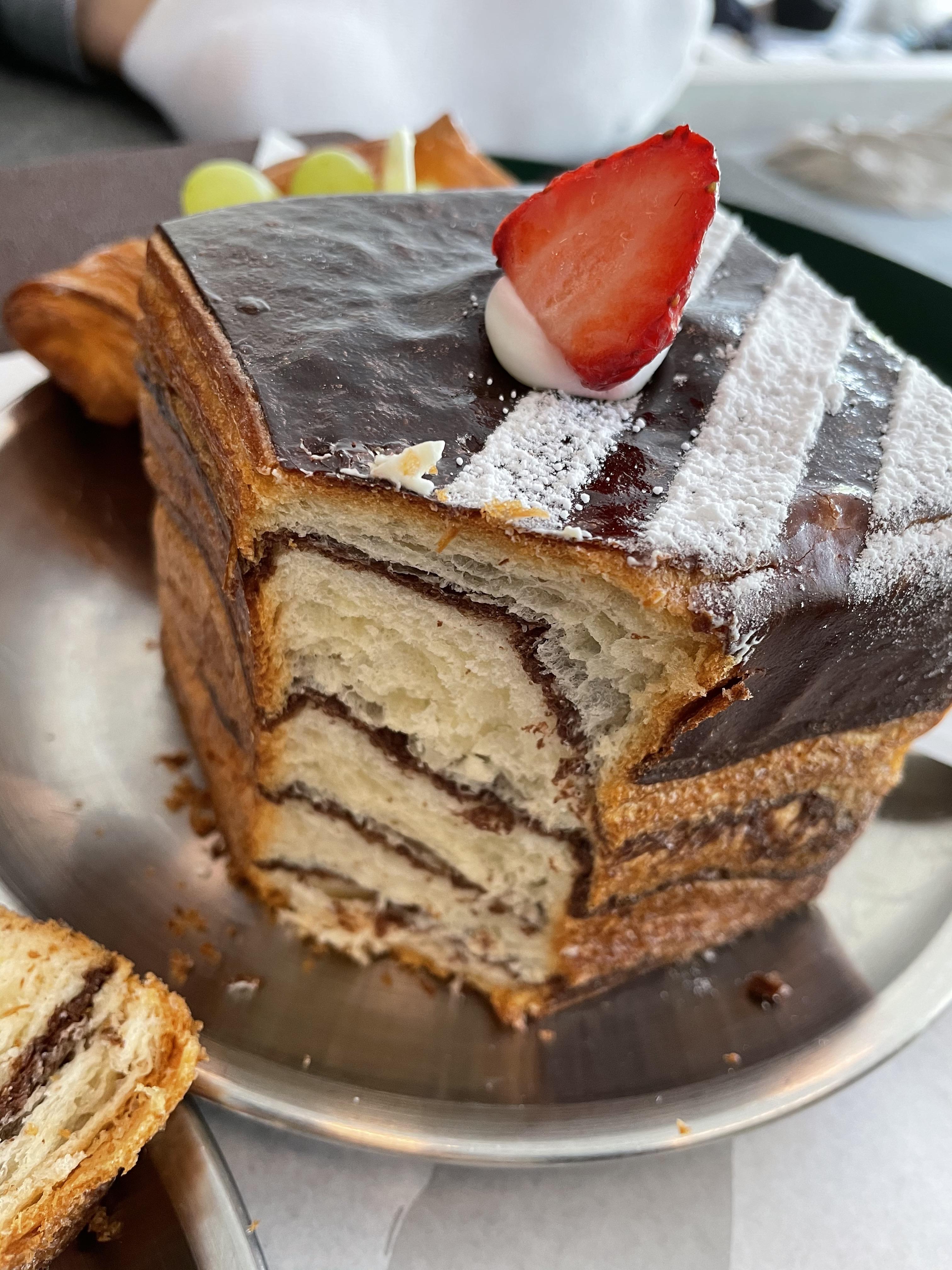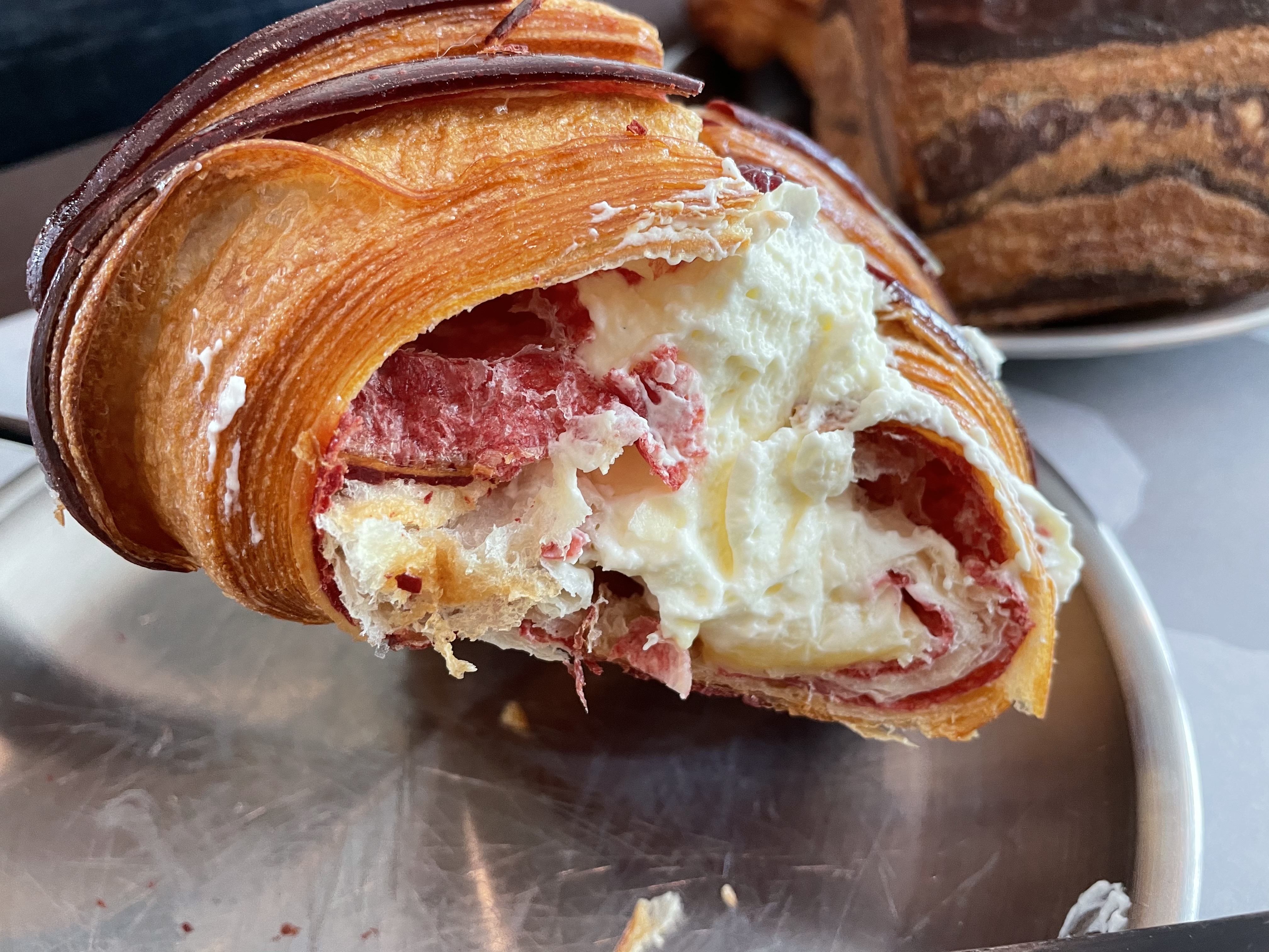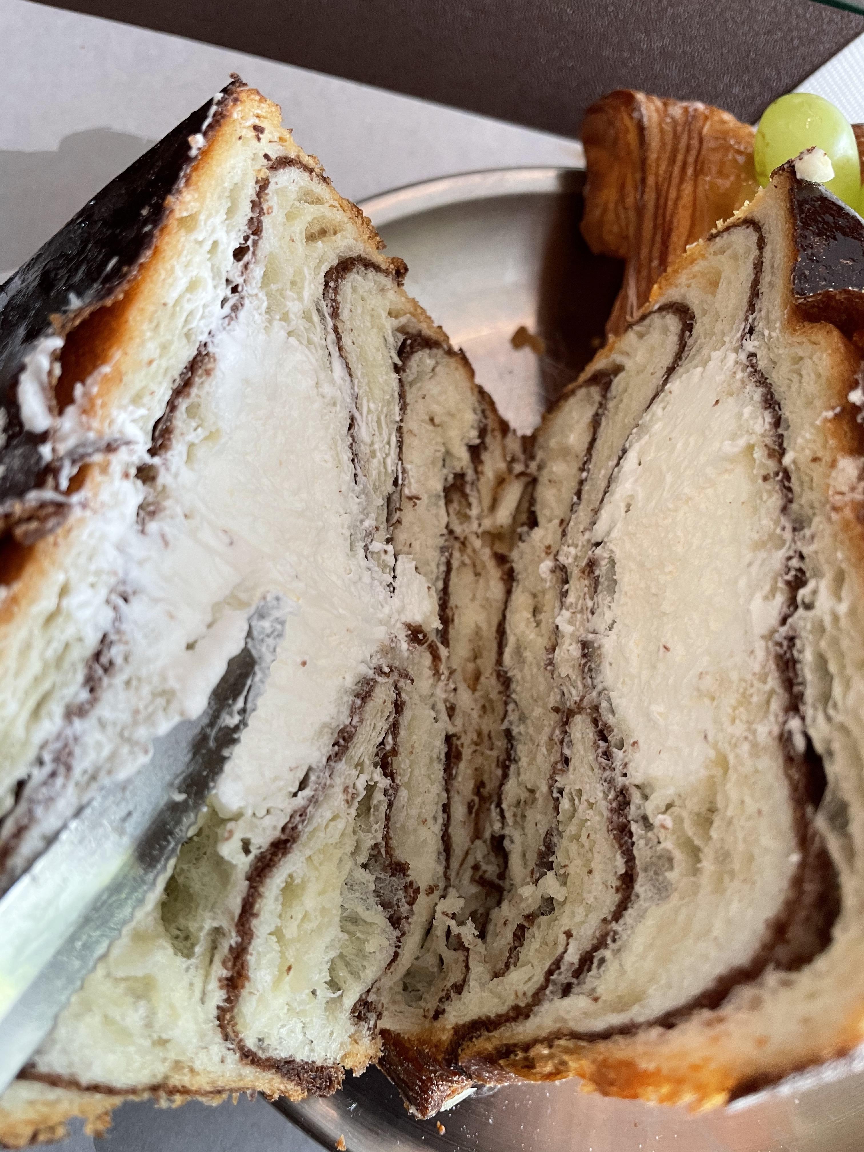 일단 단면은 이러하구요. 크루아상 안에 슈크림 맛이 강하게 나는 크림이 들어가 있고, 겹겹이 산딸기잼이 발려져 있었어요. 크림 위쪽으로는 진짜 산딸기가 데코 되어 있었어요. 저는 이 빵이 제일 맛있었어요. 먹기가 조금 힘들긴 했지만, 크루아상의 식감과 크림의 부드럽고 달콤한 맛, 그리고 산딸기의 상큼함이 잘 어울렸어요.