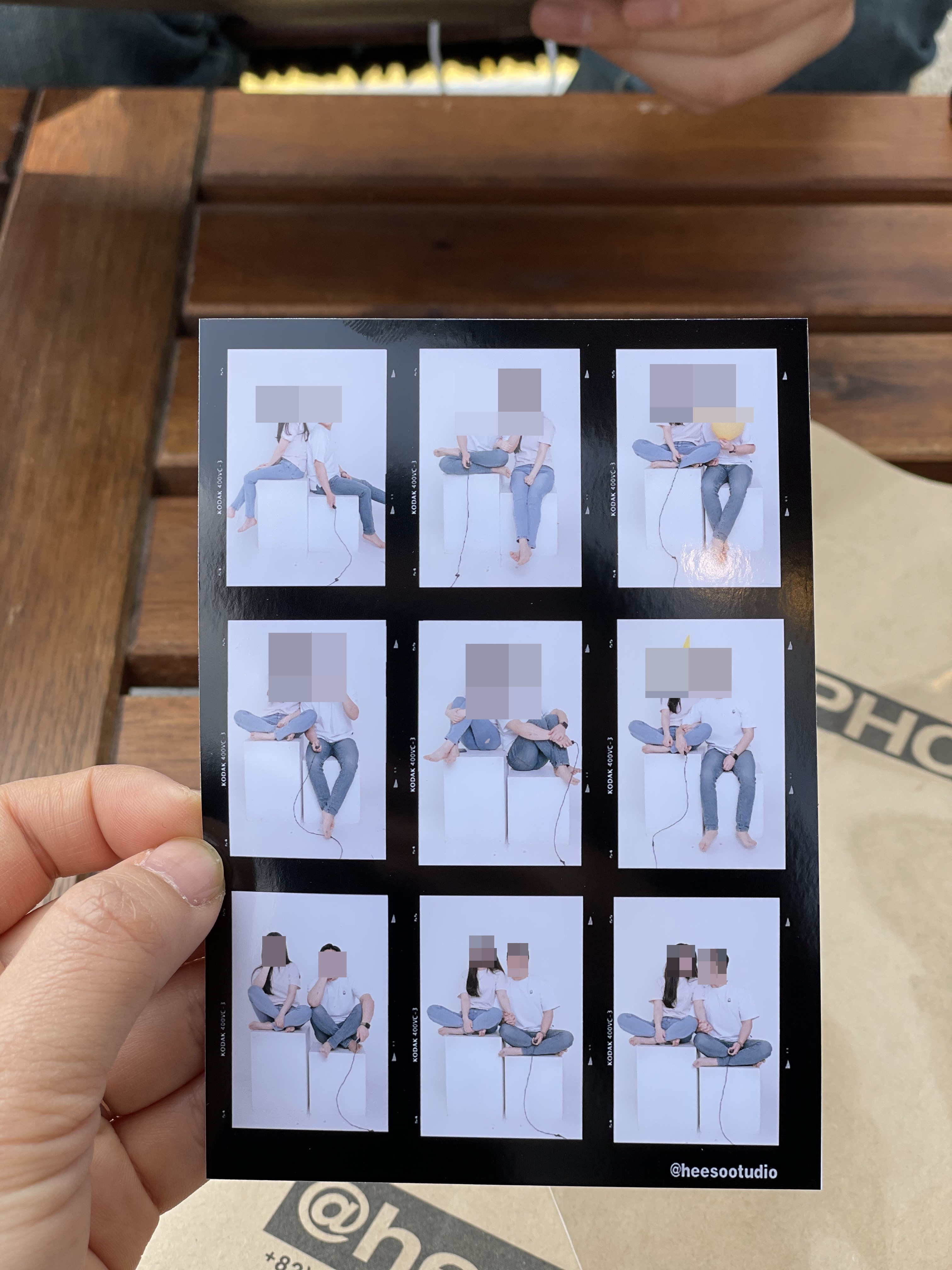 그리고 이렇게 9컷 짜리도 인화해주세요. 여기에 들어갈 사진을 우리가 직접 골라야 한답니다. 고르는 시간은 20분이에요. 이렇게 인화해 주신 사진과 촬영하는 동안을 찍은 타임랩스 영상은 카톡으로 보내주세요! 사진은 금방 보내주시고, 타임랩스 영상은 시간이 조금 걸리더라구요.