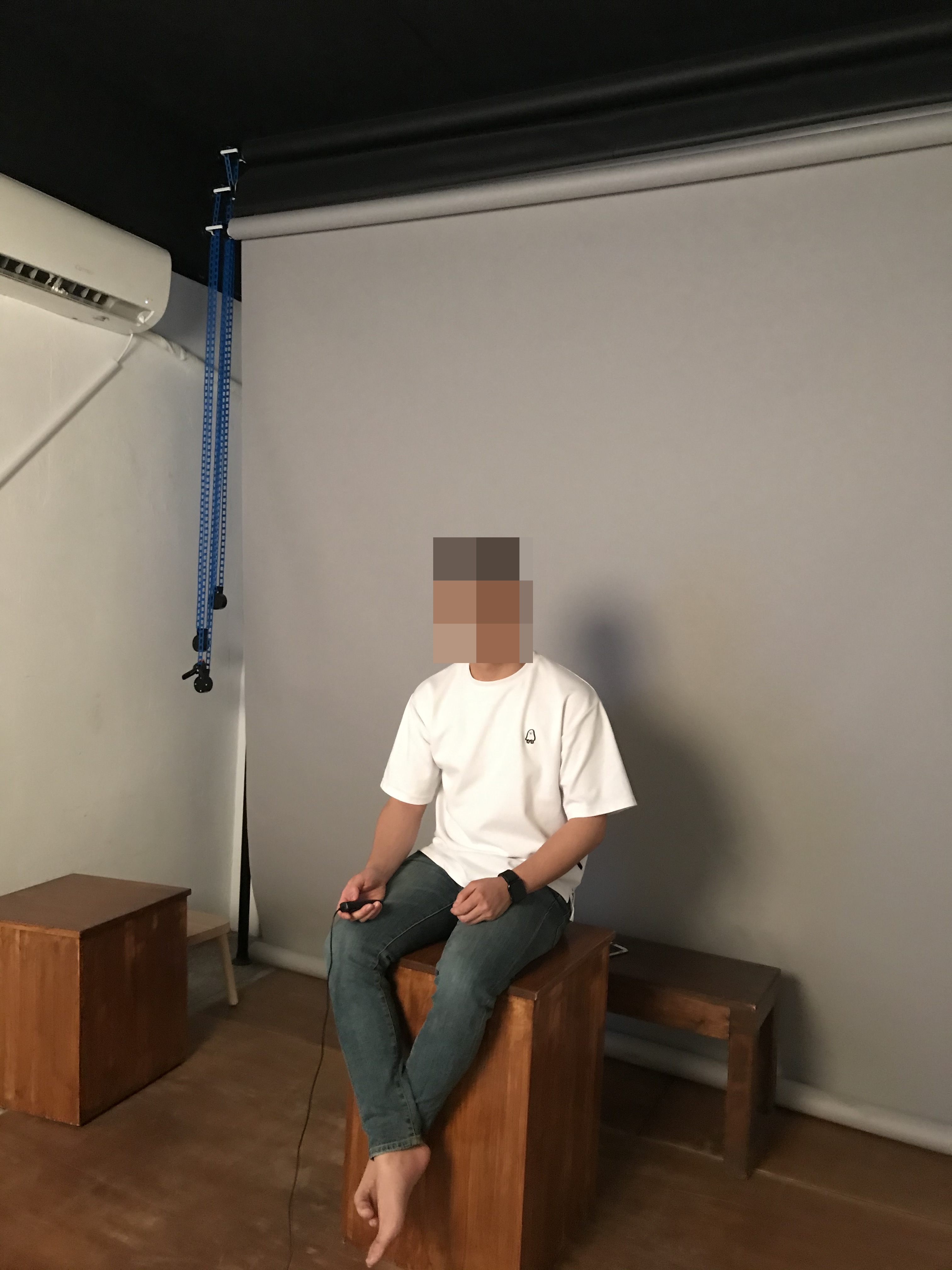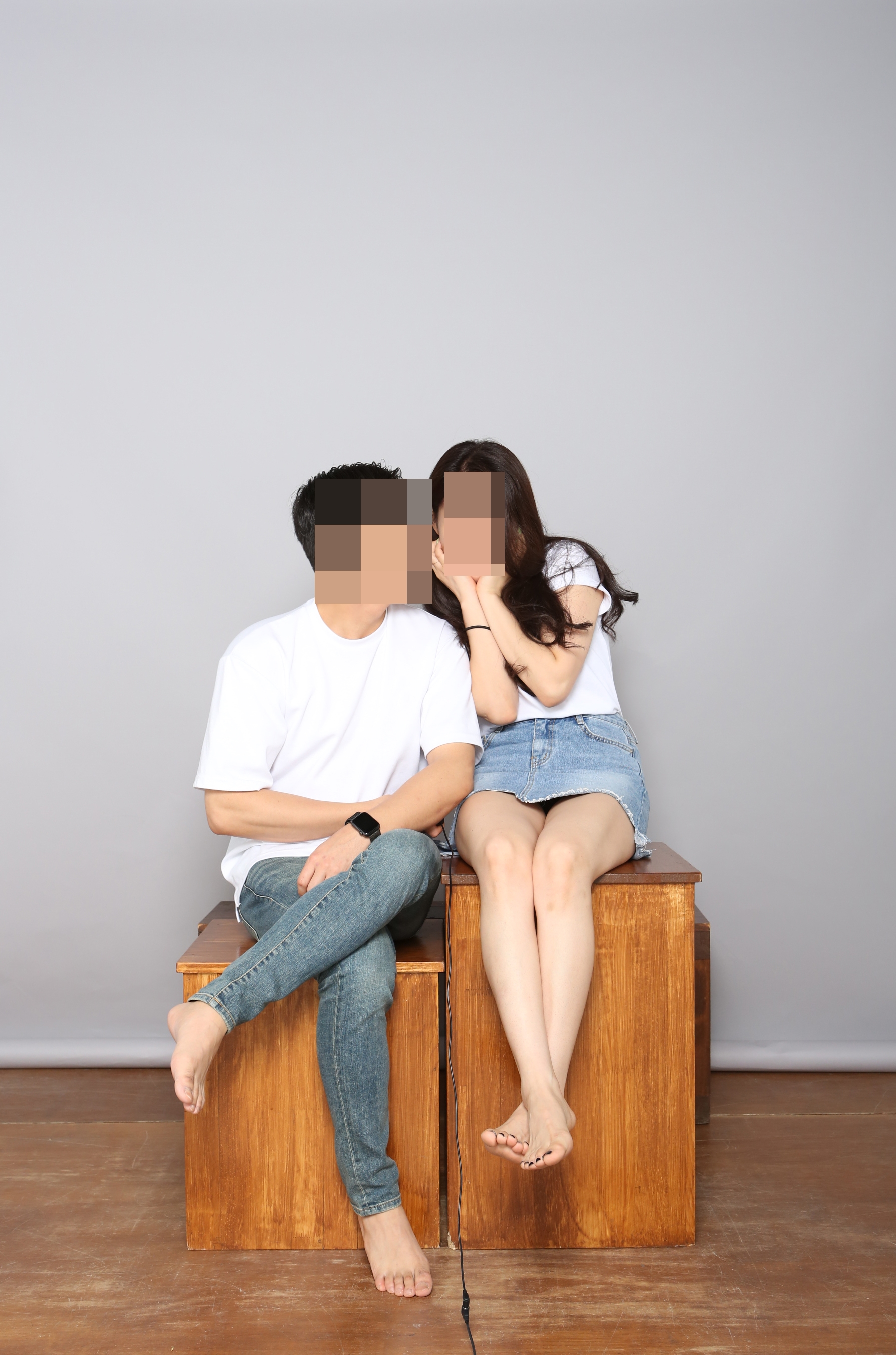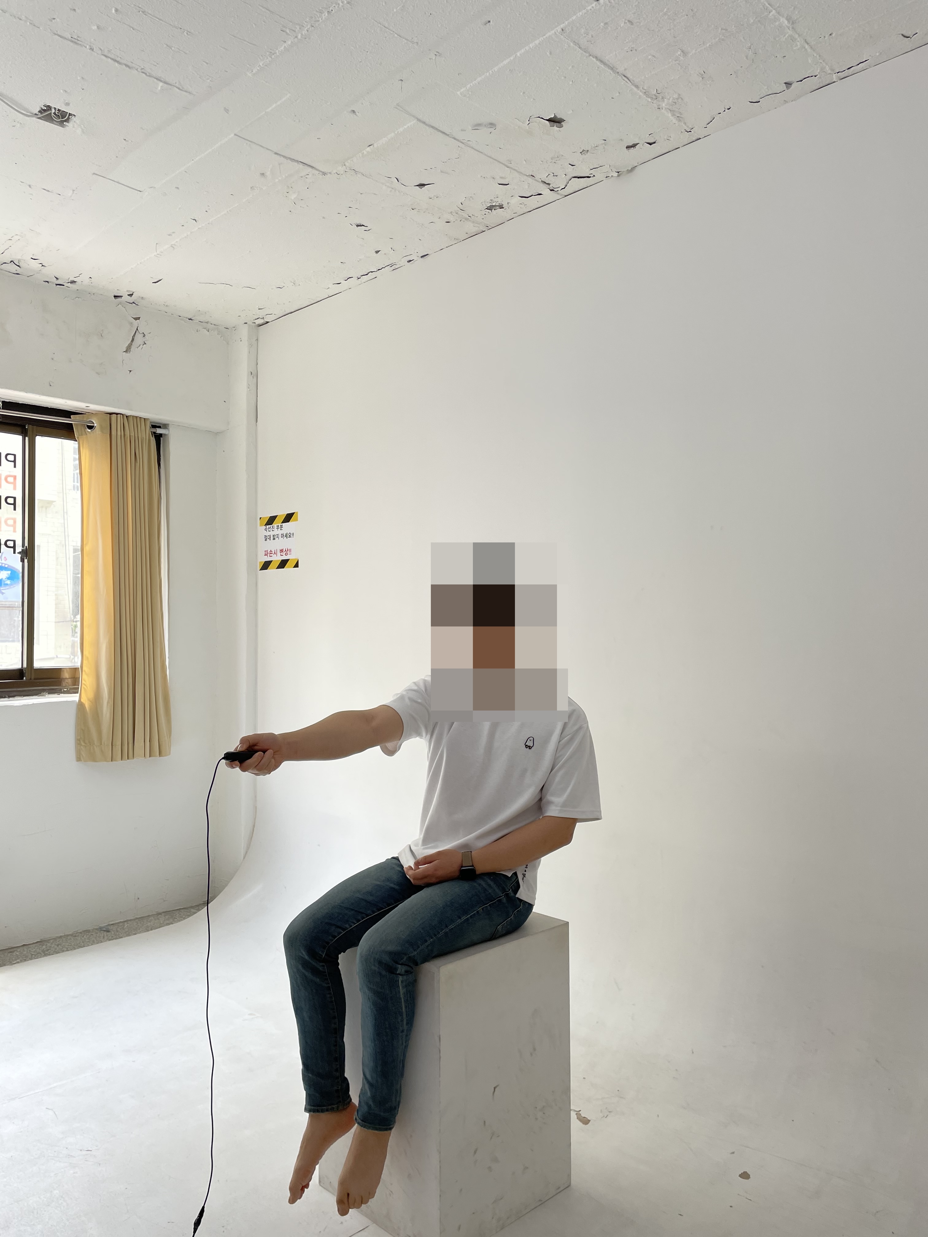 우리는 일부러 맨발로 촬영했지만, 흰색 바닥이라도 신발은 신을 수 있다고 하시네요. 이렇게 흰색 다이가 두 개 있고, 카메라를 보면서 리모컨을 직접 눌러 촬영하면 돼서, 불편하지 않아요!