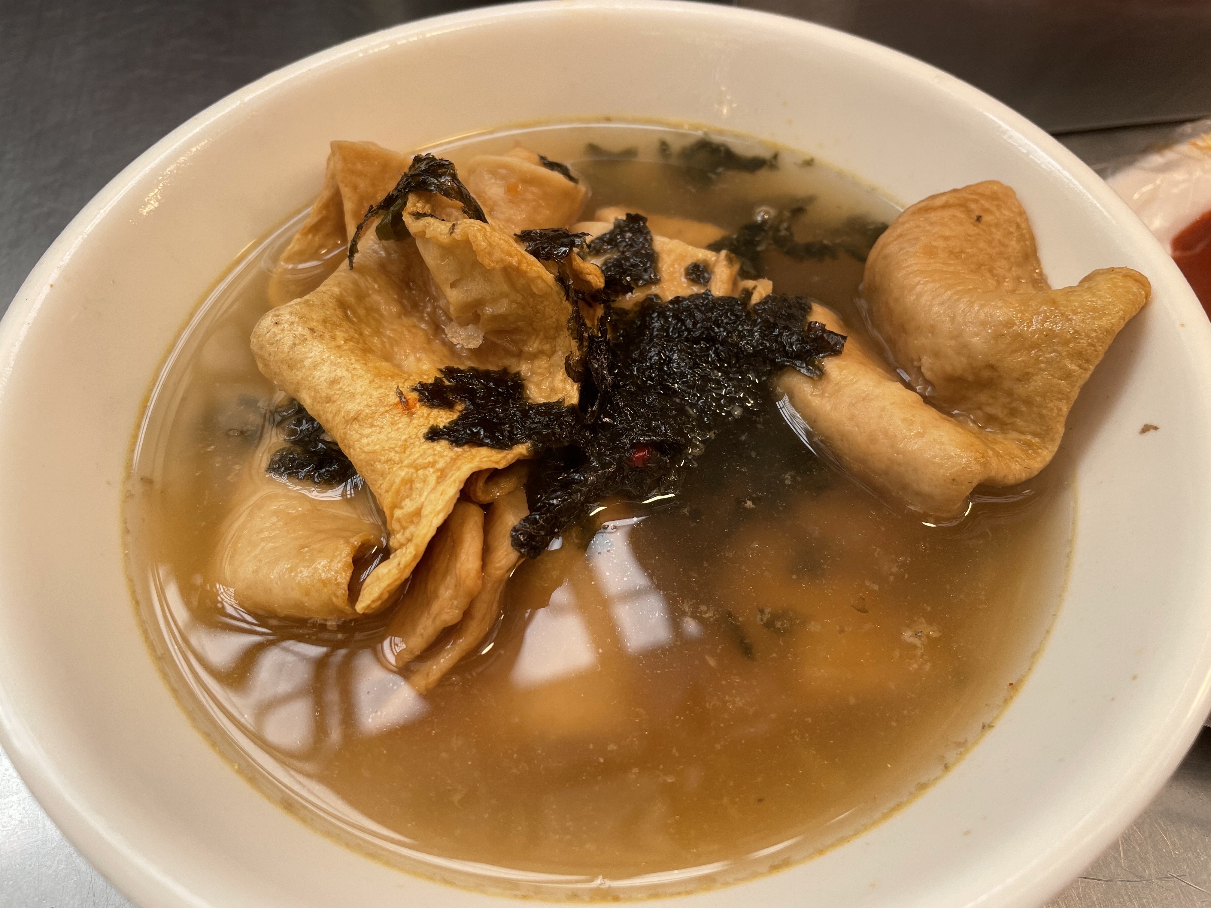 어묵은 이 한 그릇에 6천 원인데, 제가 볼 땐 무척 비싼 것 같아요. 그 절반만 받아도 그다지 싸다고 생각할 것 같지는 않네요. 맛은 우리가 아는 그 어묵 맛이고, 국물이 살짝 얼큰한 맛이 있었어요. 떡볶이에 넣어서 같이 먹으면 괜찮더라구요.