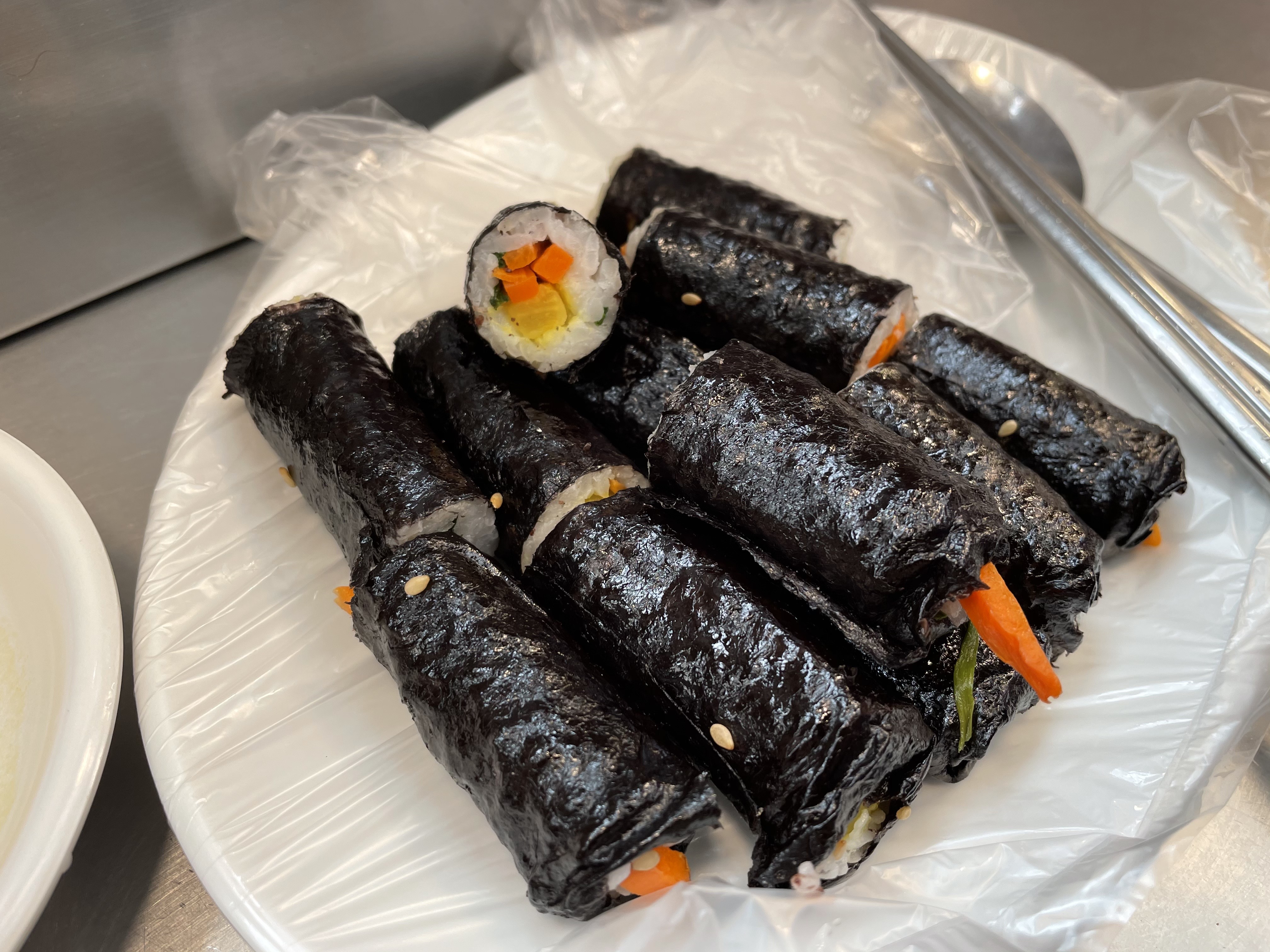 마약김밥 1인분입니다. 꼬마김밥이 나오고, 같이 겨자소스가 나와서 찍어먹어요. 심심한 맛인데, 그게 매력이라고 하네요. 떡볶이 국물에 찍어먹어도 맛있어요.
