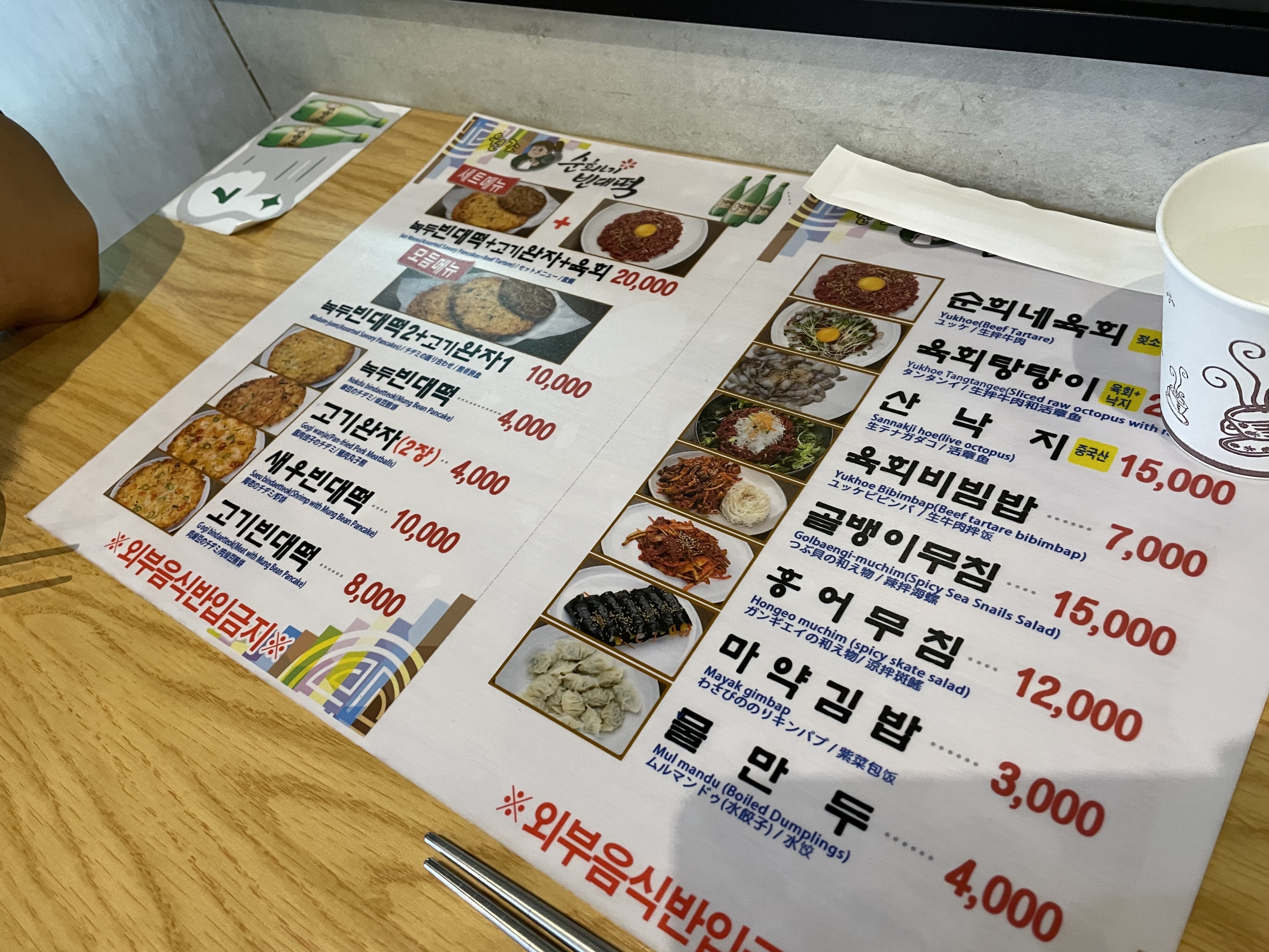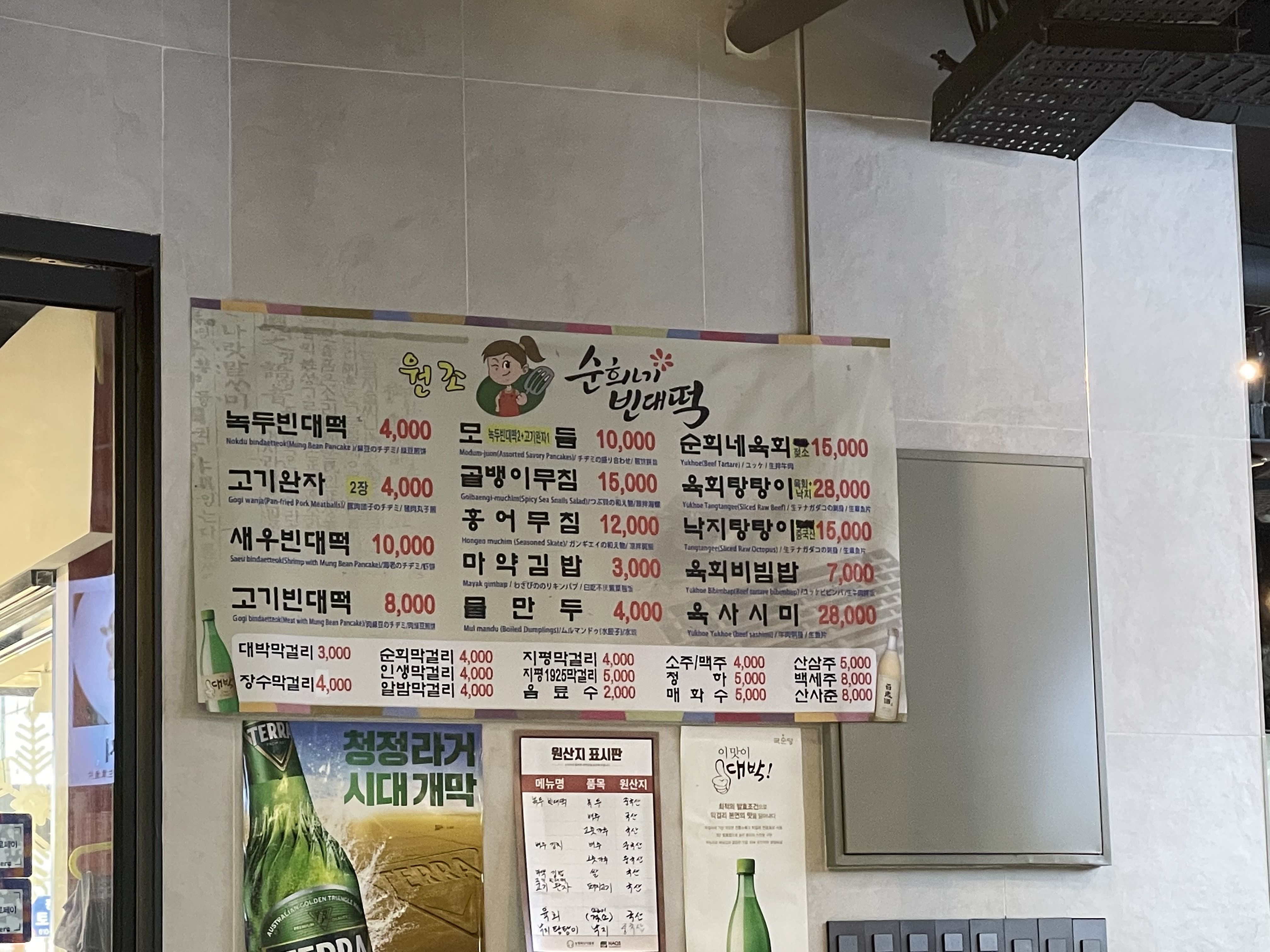 메뉴판이에요. 저희는 1차로 먹고 왔기 때문에, 녹두빈대떡 하나와, 고기완자(2장) 하나를 시켰어요.