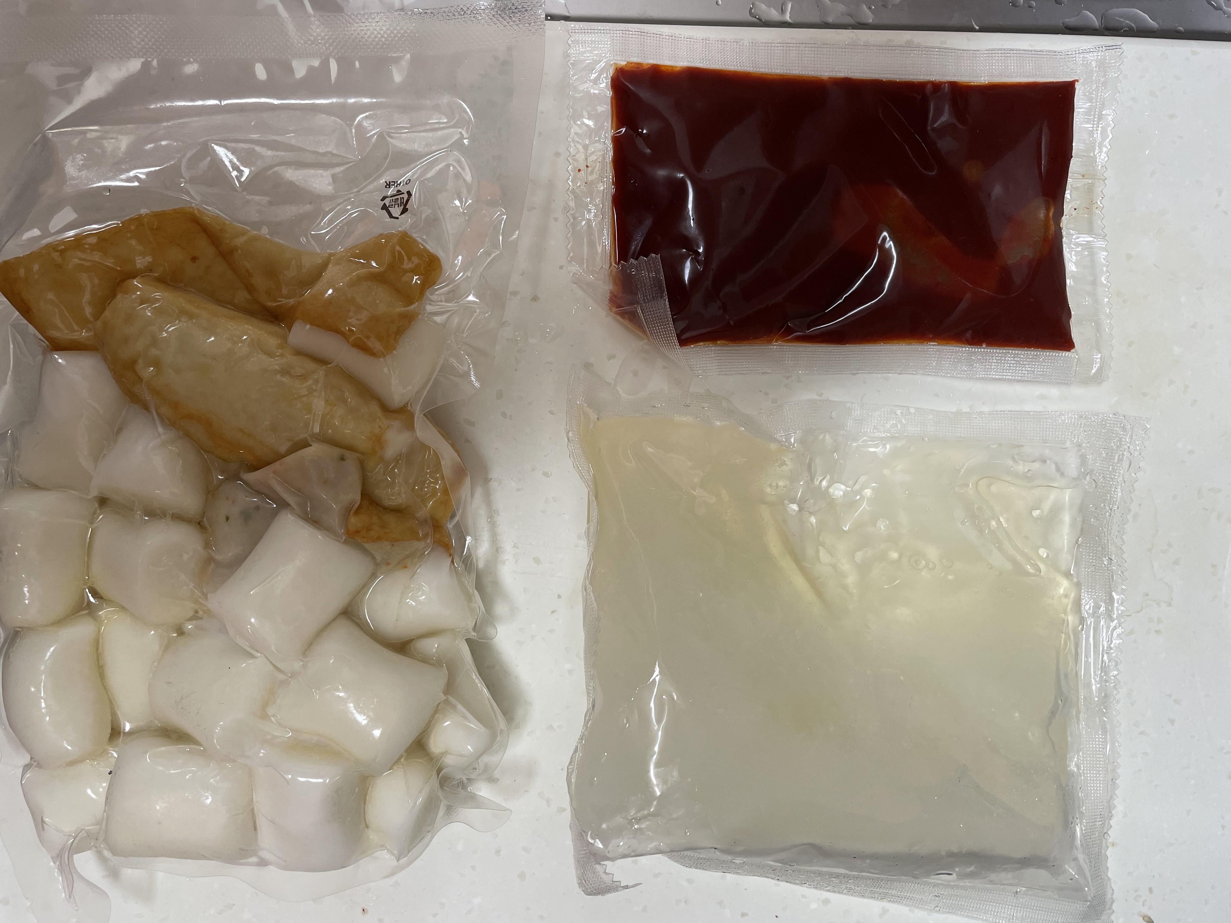 재료 구성입니다. 떡과 어묵이 같이 들어있고, 양념장과 육수가 있어요.