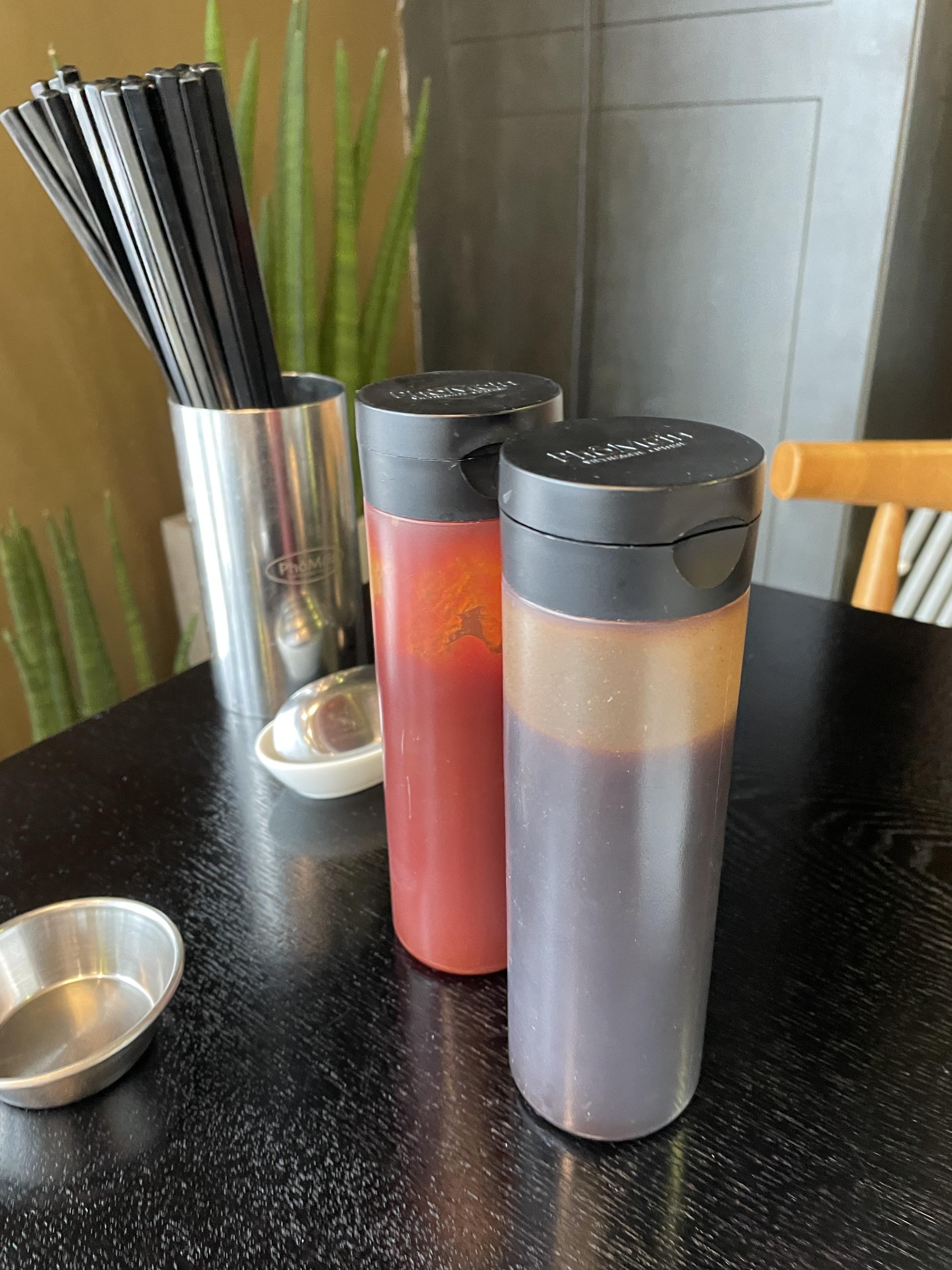 테이블에 기본으로 세팅된 소스입니다. 다들 취향에 따라 드시는 방법이 다르시던데, 저는 이 두 개를 섞어먹는 것이 제일 좋더라고요. 매콤한 걸 좋아해서, 빨간 소스를 좀 더 많이! 쌀국수에 들어간 고기를 찍어먹어요!
