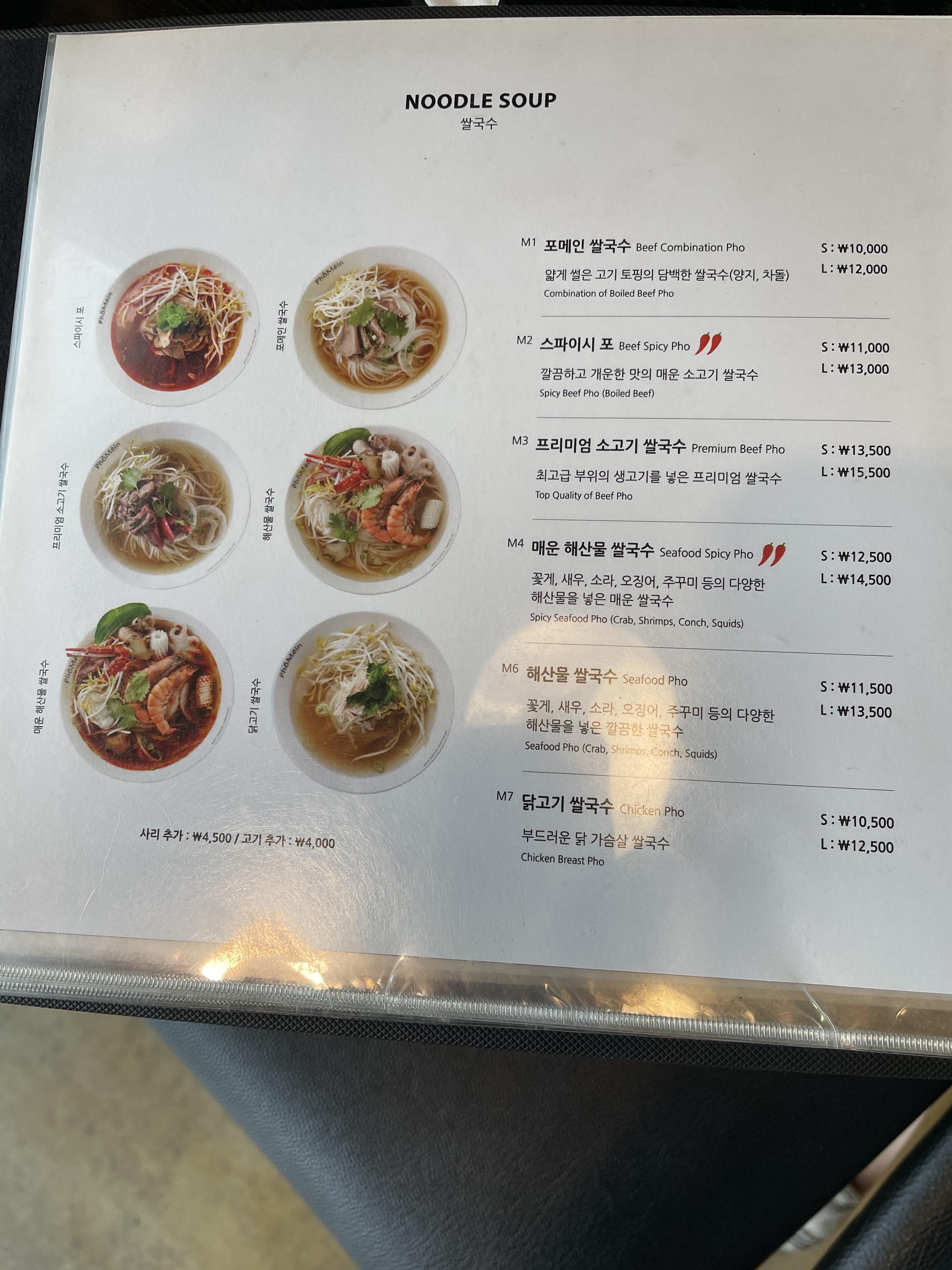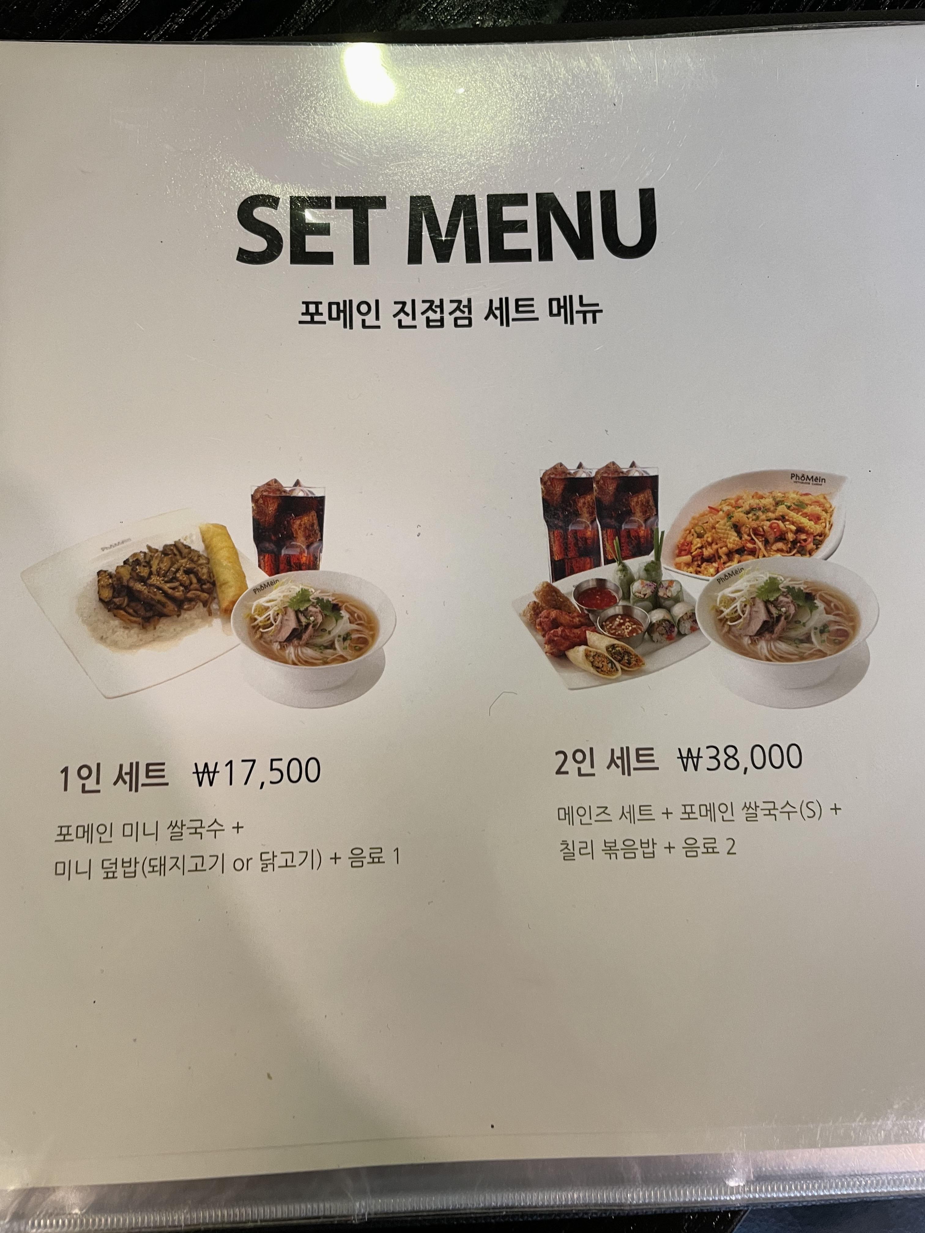 저희는 메뉴판을 둘러보다가, 짜조와 포메인 쌀국수를 두 개 시켰어요. 처음에 프리미엄 소고기 쌀국수를 주문드렸는데, 직원분께서 오늘 소고기가 좀 질기다고 드시지 않는 게 좋을 것 같다고 말씀해주시더라구요.